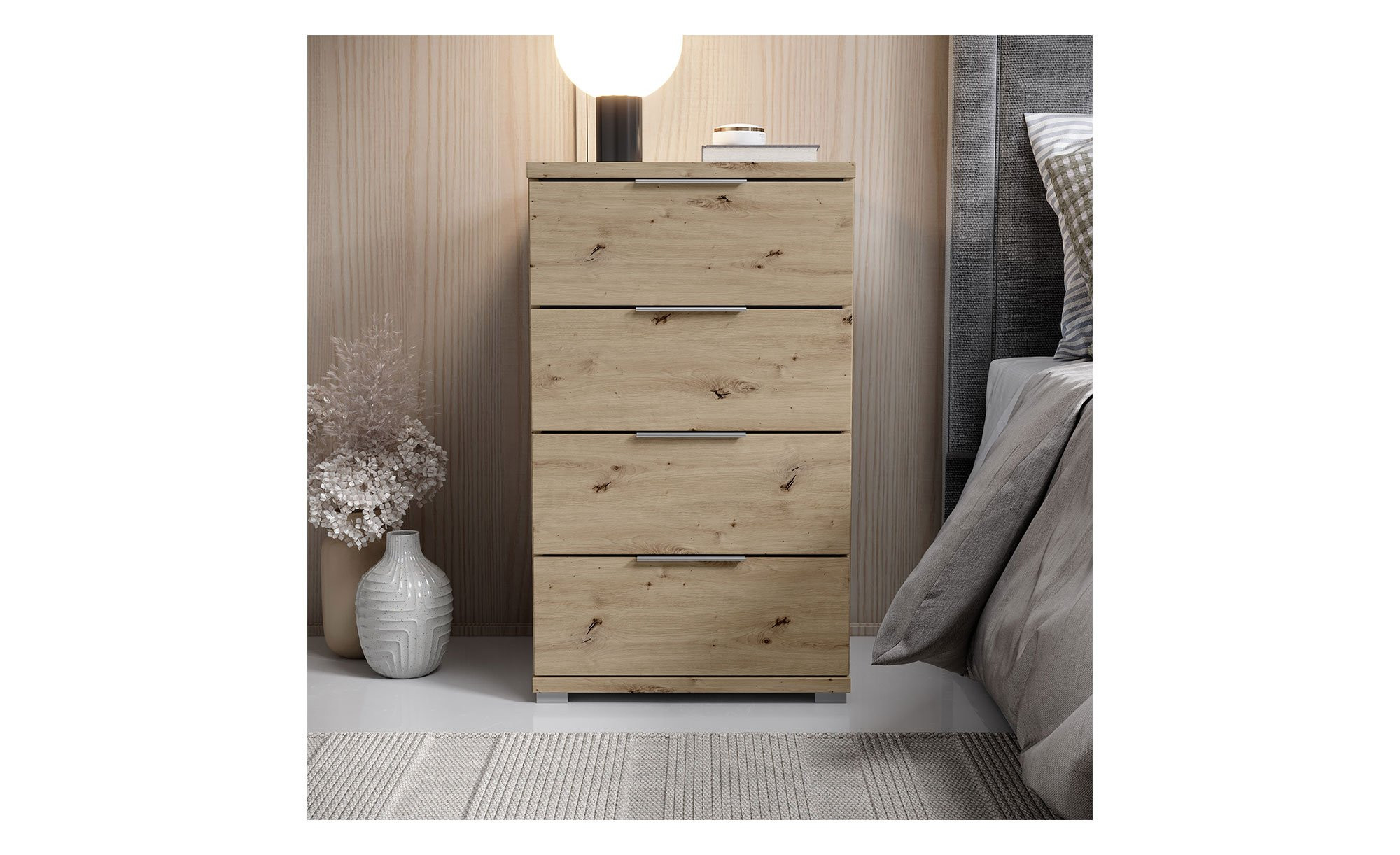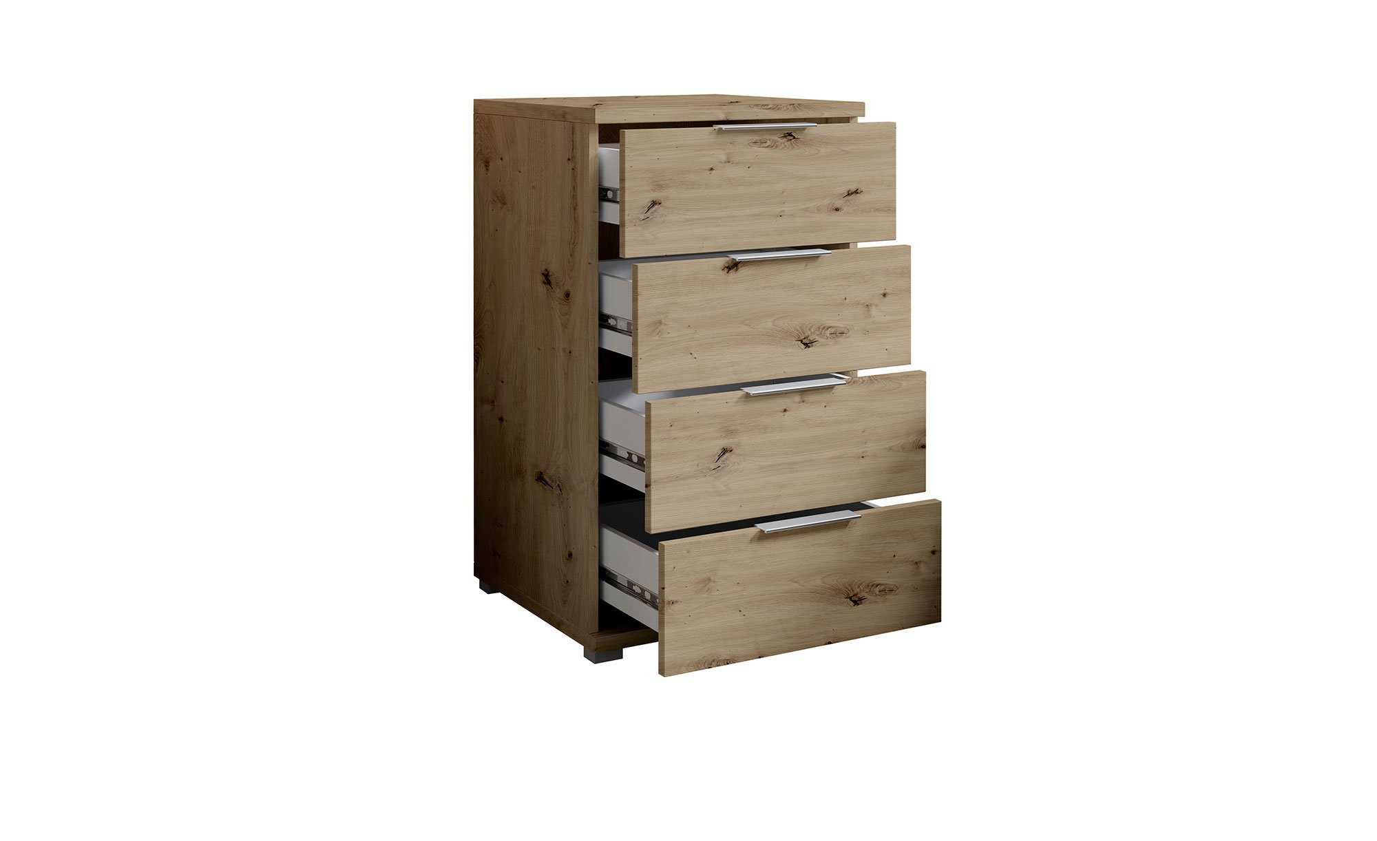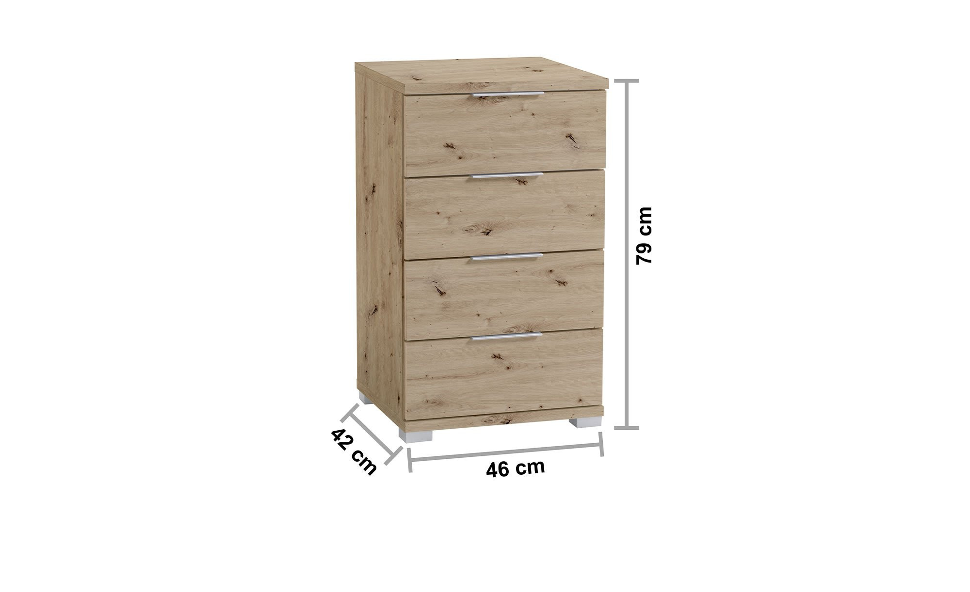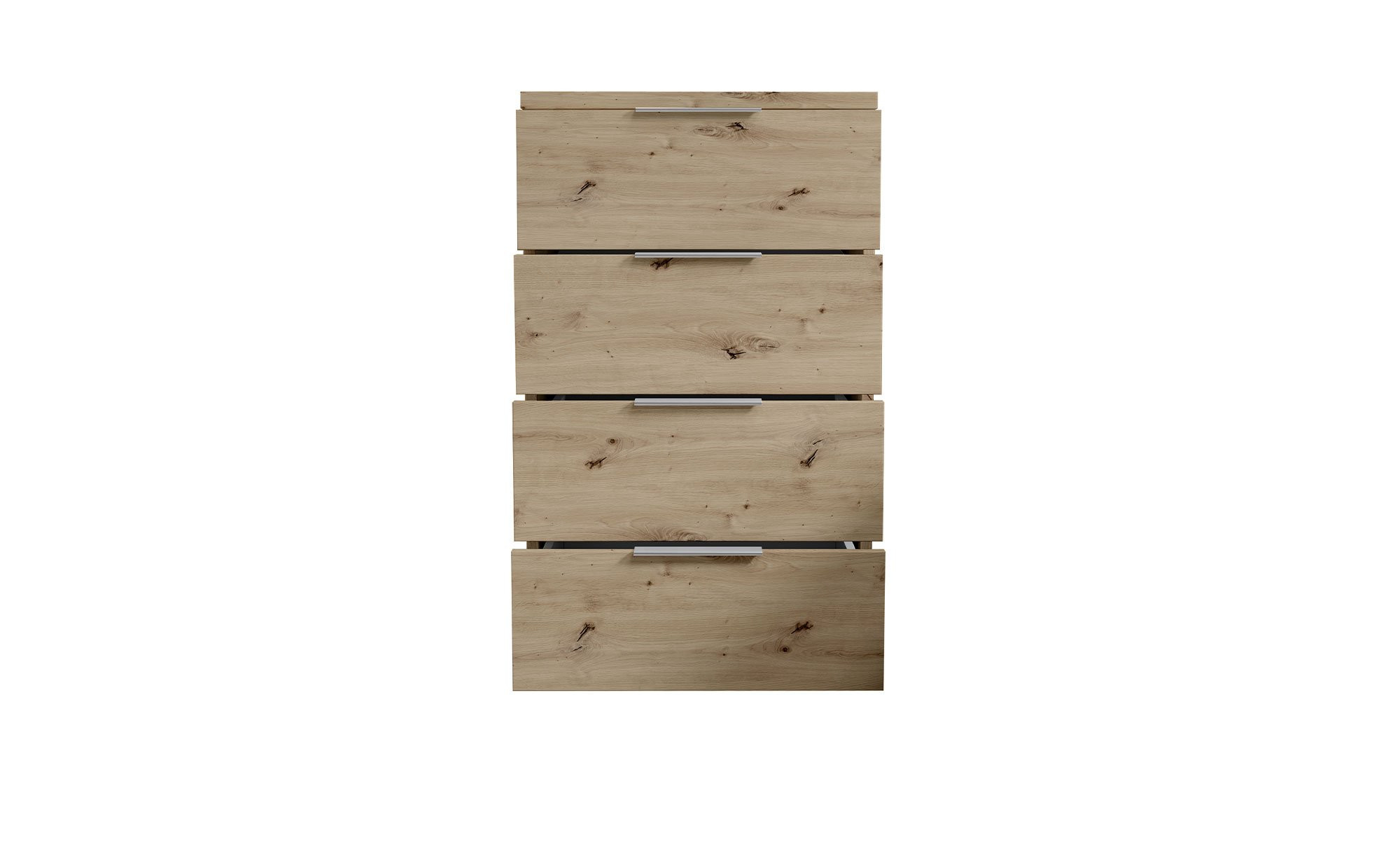 Das ca. 46 x 79 x 42 cm große Möbelstück besteht aus Holzwerkstoff in einem naturnahen Artisan Eiche Dekor. Dieses findet sich auch im Innenbereich, gemeinsam mit weißen Bestandteilen. Außen schützt eine Melaminharz-Beschichtung die Oberflächen zuverlässig vor Verschleiß und Schmutz.