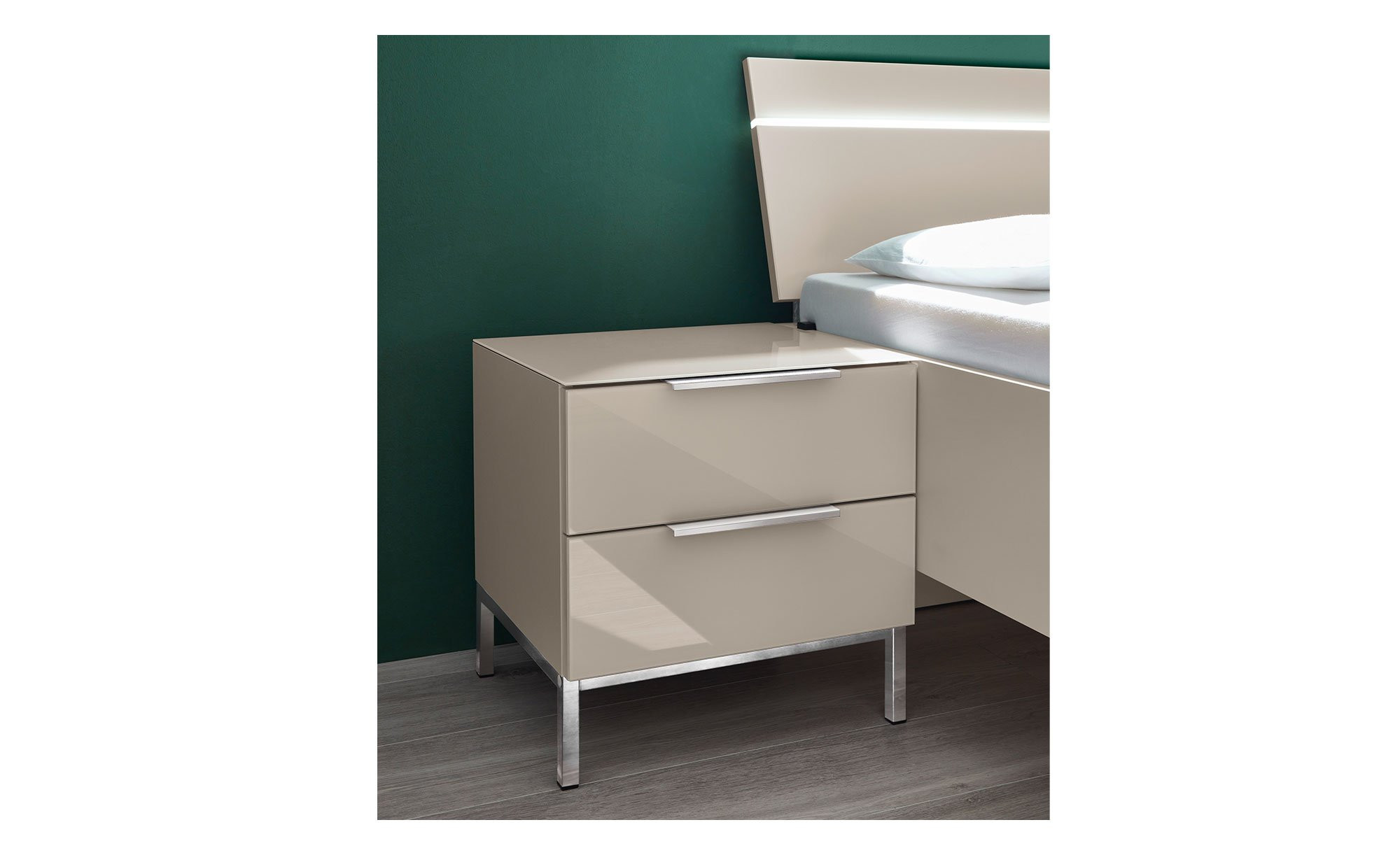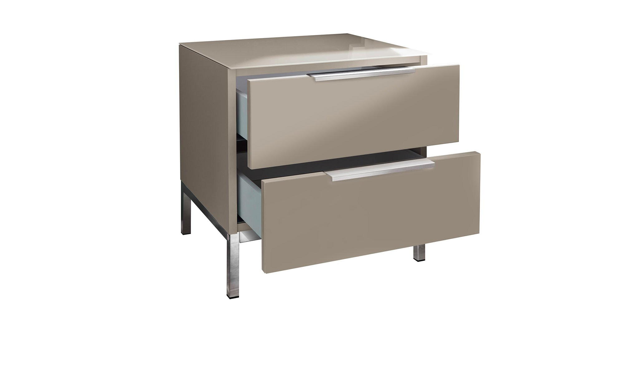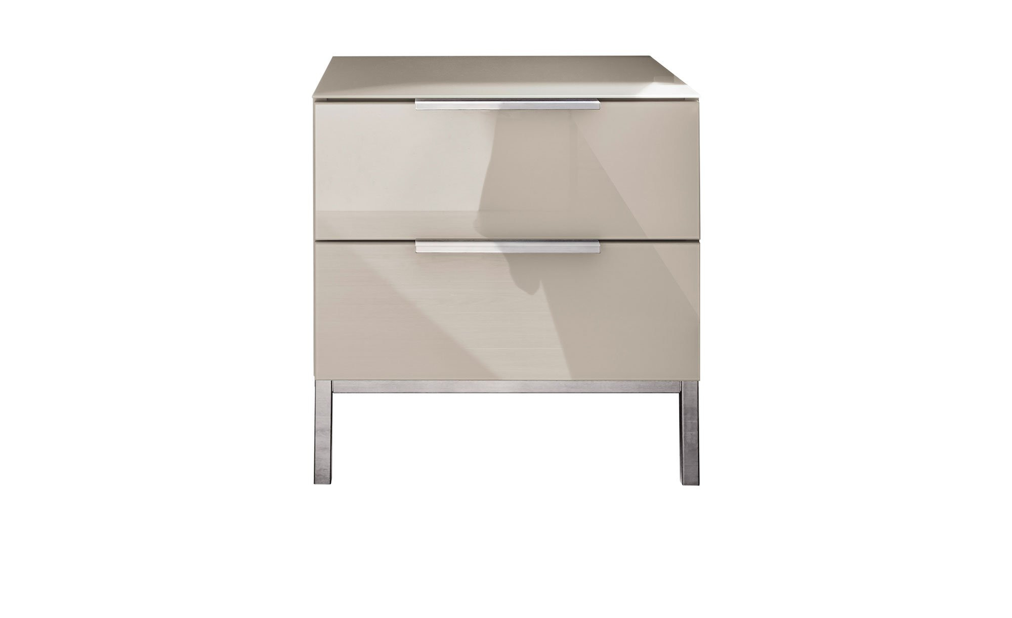 Die Nachtkonsole Bergamo misst ca. 45 x 46 x 40 cm und wurde aus Holzwerkstoff gefertigt. Seine Oberflächen sind durch eine Melaminbeschichtung vor Verschleiß geschützt, außerdem befinden sich an der Vorderseite zusätzliche Glasauflagen. Metallgriffe und -füße in Chrom-Optik harmonieren perfekt mit dem Kaschmir-Ton des Artikels.