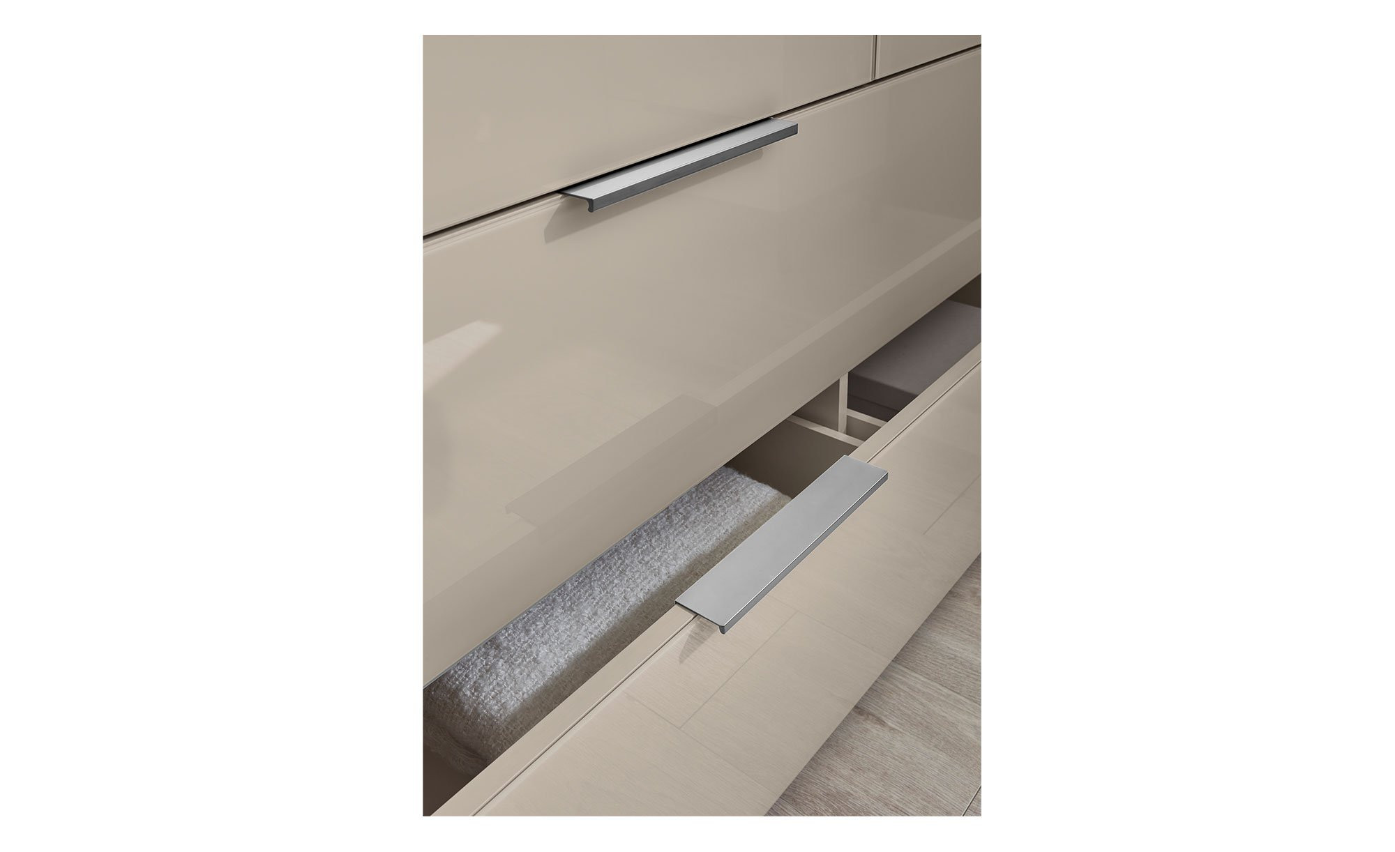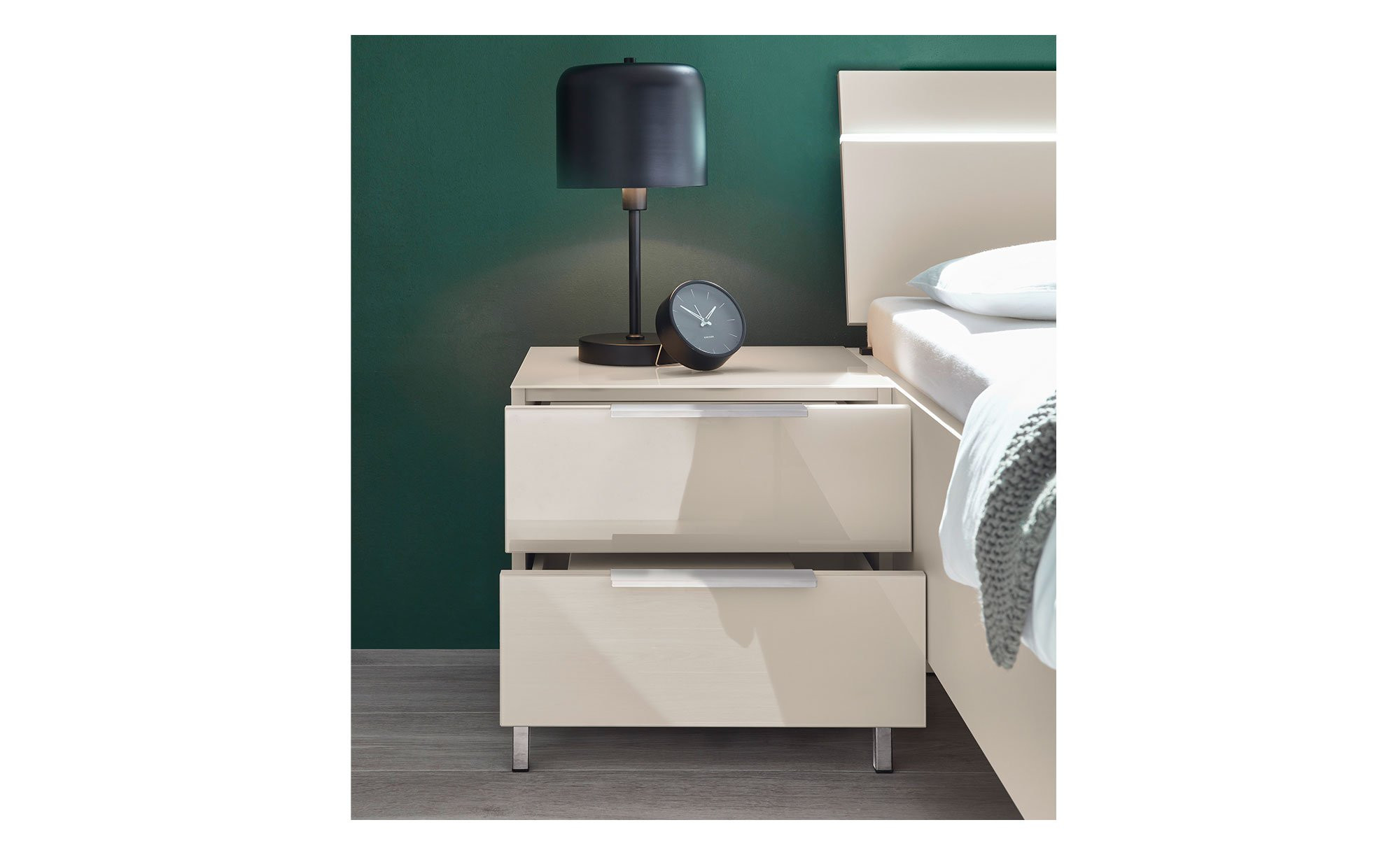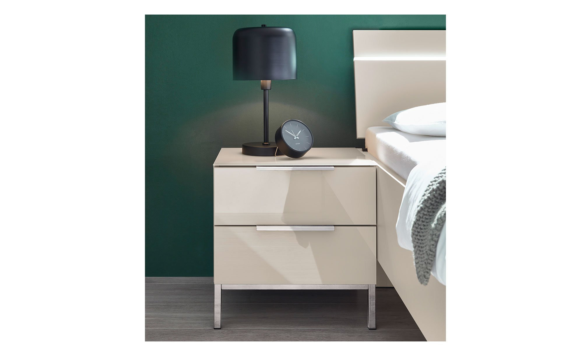 Die Nachtkonsole Bergamo misst ca. 45 x 46 x 40 cm und wurde aus Holzwerkstoff gefertigt. Seine Oberflächen sind durch eine Melaminbeschichtung vor Verschleiß geschützt, außerdem befinden sich an der Vorderseite zusätzliche Glasauflagen. Metallgriffe und -füße in Chrom-Optik harmonieren perfekt mit dem Kaschmir-Ton des Artikels.
