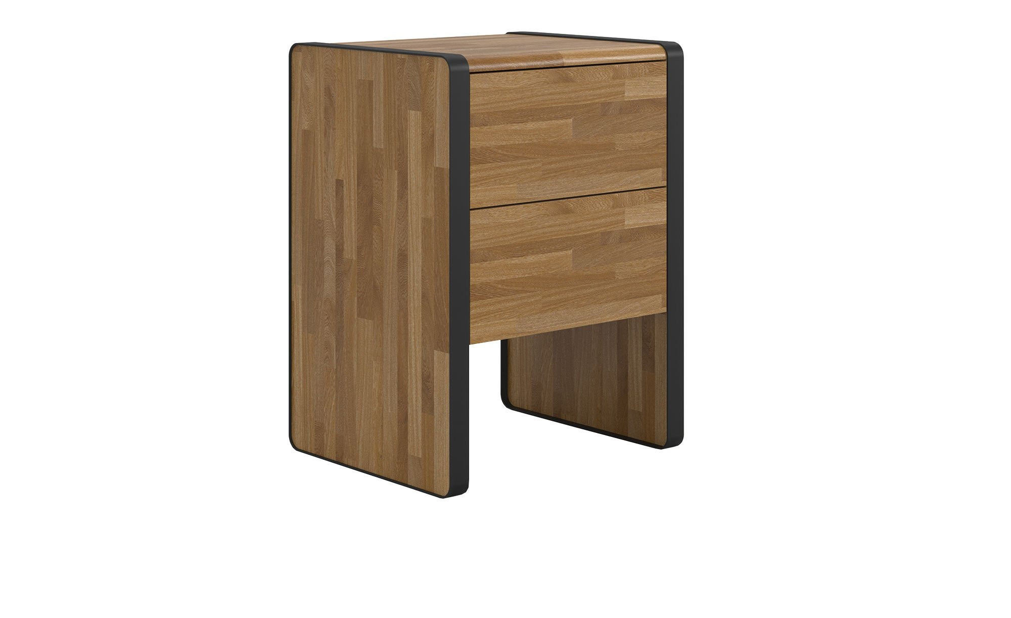 Der ca. 47 x 63 x 40 cm große Nachttisch besteht aus massiver Eiche und begeistert durch seine warme Ausstrahlung sowie eine harmonische, klare Formgebung. Als besonderer Eyecatcher wirkt die integrierte Absetzung aus schwarzgrauem Metall.