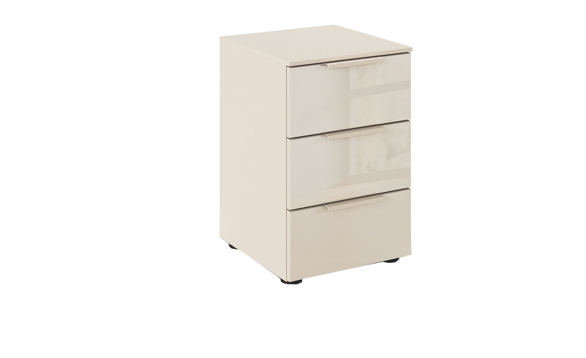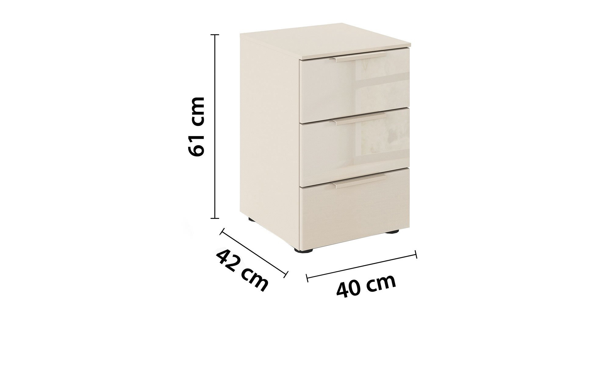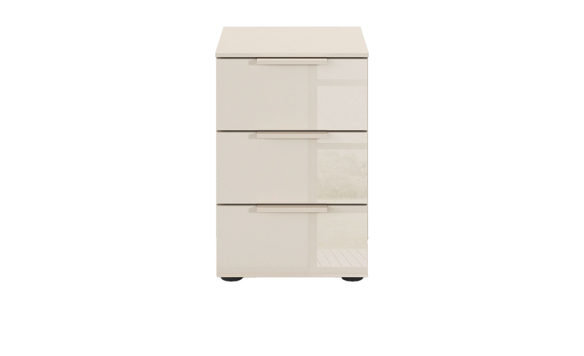 An Front und Korpus besteht das Möbelstück aus Holzwerkstoff in einem ansprechenden Champagner-Ton, außerdem überzeugt es durch eine Glasfront und einen strapazierfähigen Dekor-Oberboden. Das Innendekor in ansprechender Texline-Optik setzt einen hochwertigen Akzent, während höhenverstellbare Füße in mattem Schwarz einen modernen Kontrast erzeugen.