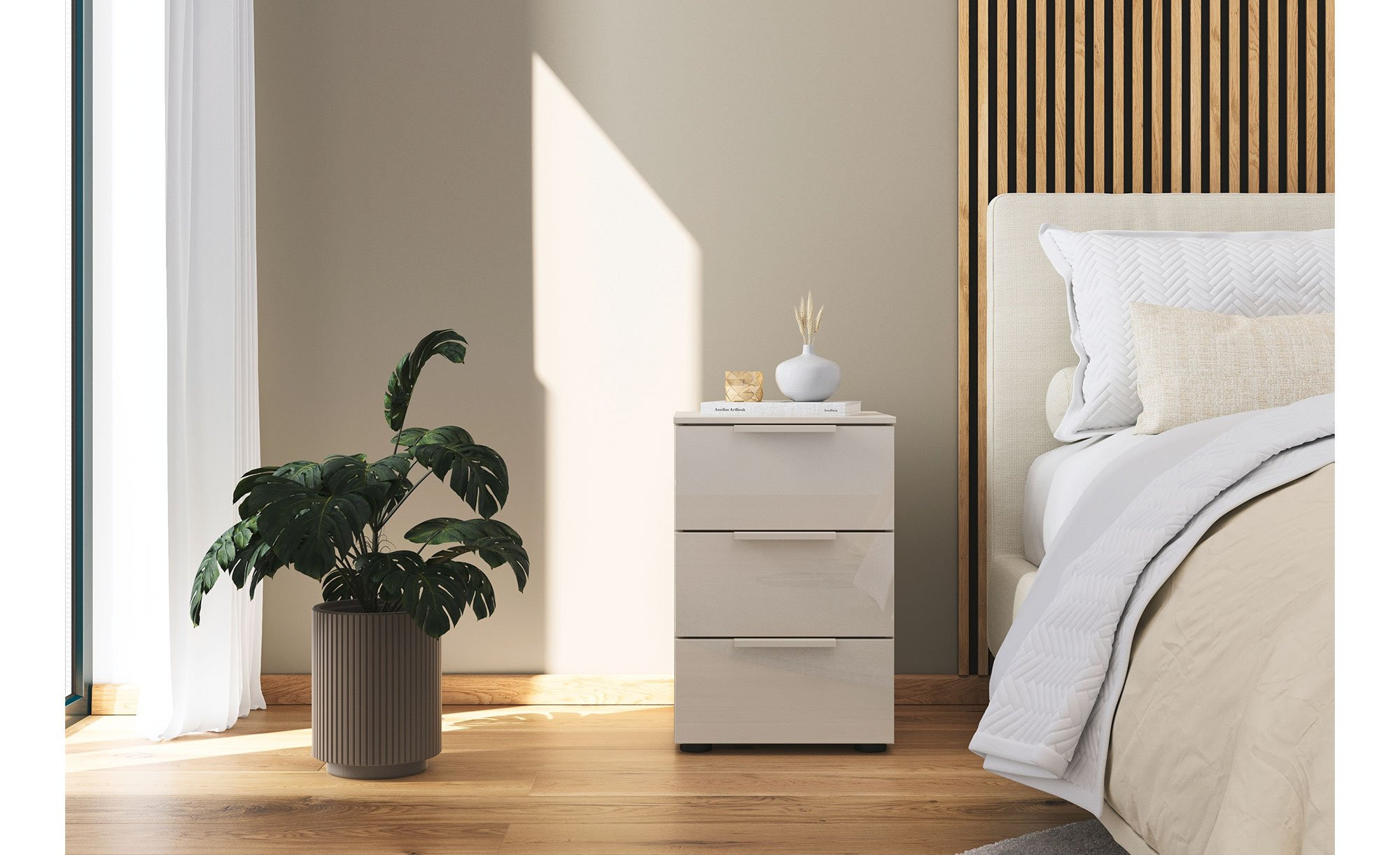 Die drei Schubkästen mit champagnerfarbigen Griffen und komfortabler Soft-Close-Funktion lassen sich sanft öffnen und schließen. Sie bieten großzügigen Platz für persönliche Utensilien, Bücher oder andere Dinge, die Sie griffbereit am Bett benötigen.