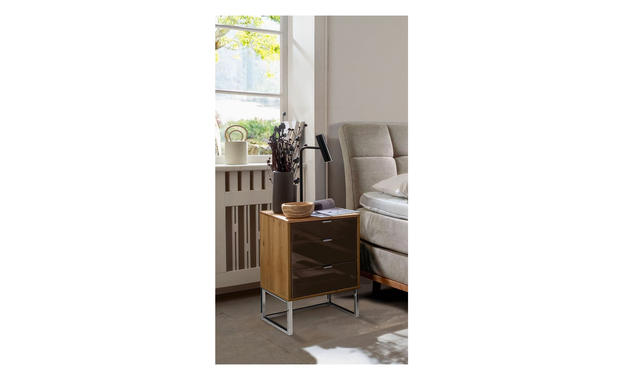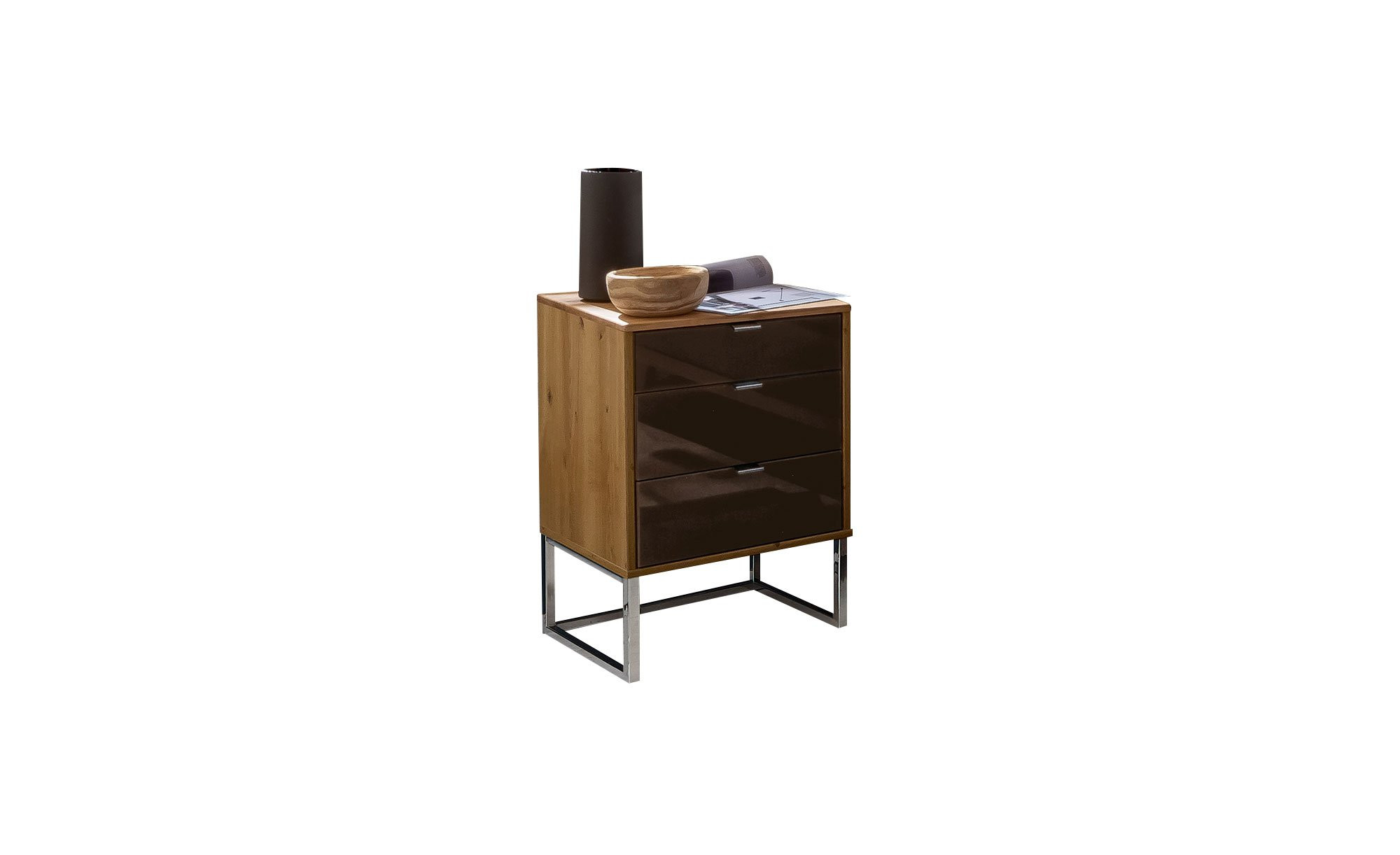 Freuen Sie sich auf eine Glasfront im Farbton Mocca sowie einen teilmassiven Korpus im Bianco-Eiche-Stil. Als Alternativen stehen zudem drei andere Holzarten für den Korpus und vier verschiedene Fronten zur Auswahl. Die Kufenfüße und Griffe werden in Chrom und Schiefer angeboten.