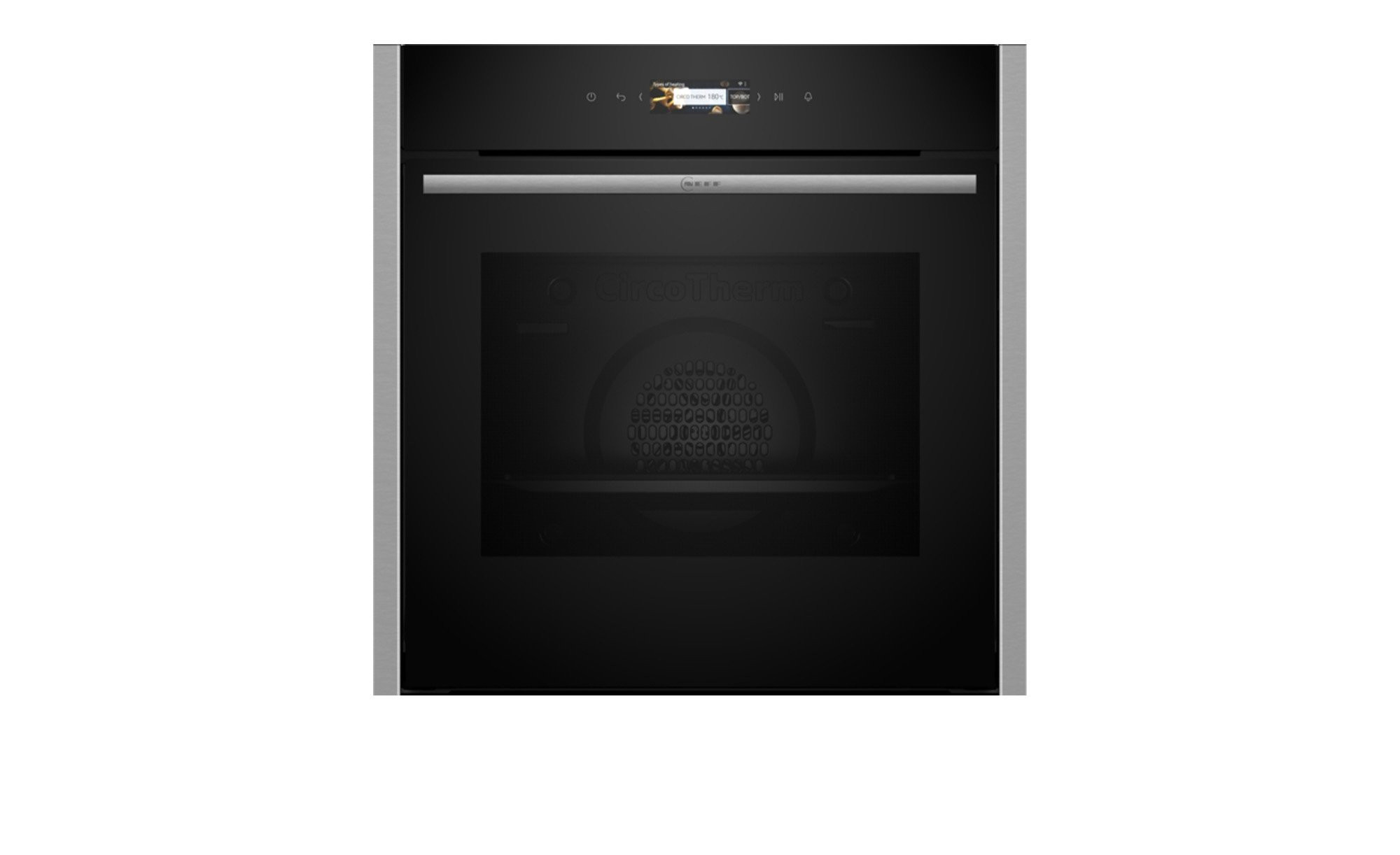 Der aus Edelstahl und schwarzem Glas bestehende NEFF Backofen ist ca. 59,6 x 59,5 x 54,8 cm groß. Dank Soft Close und Soft Opening lässt er sich beinahe geräuschfrei bedienen.