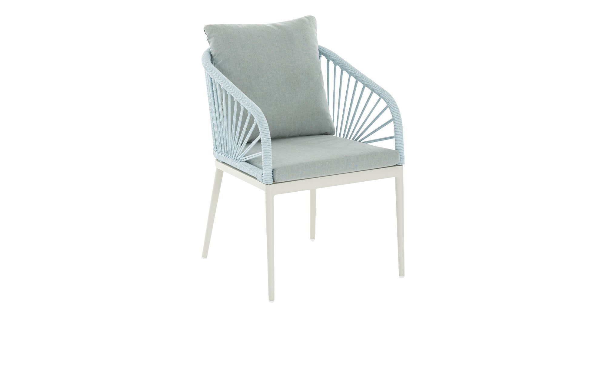 Als Basis fungiert bei dem ca. 56 x 87 x 63 cm großen Gartenmöbelstück ein vierfüßiges Aluminiumgestell mit pulverbeschichteter Oberfläche in Ivory. Die Sitzschale ist mit einer Rope-Kordelflechtung in Himmelblau gestaltet, die zusammen mit den passenden Auflagen in Hellblau für hohen Komfort sorgt.