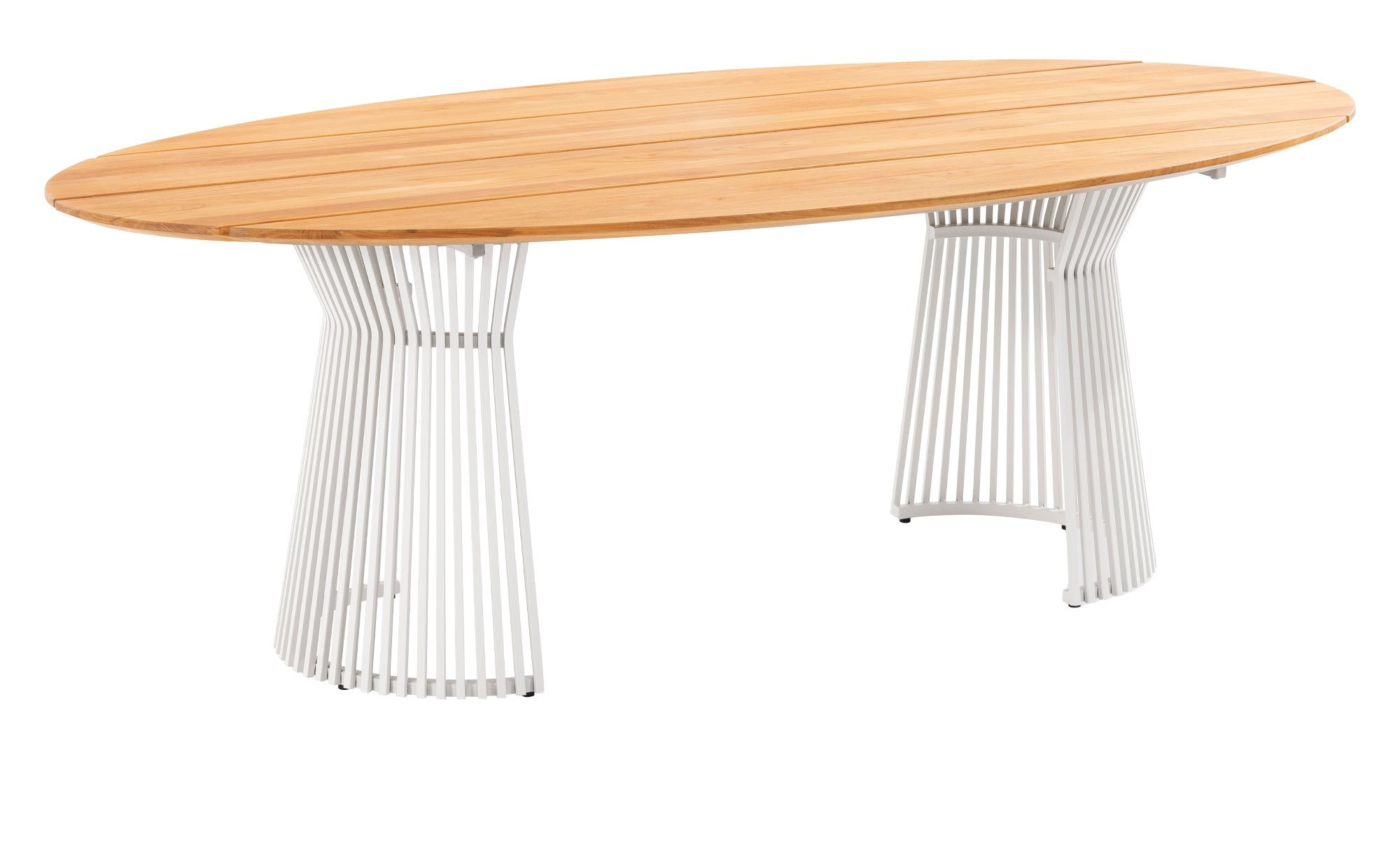 Die ovale Platte des ca. 220 x 76 x 115 cm großen Tischs besteht aus Teakholz und wurde in dessen natürlicher Farbe belassen. Zur Pflege und gleichzeitig als Schutz wurde das Material geölt. Besonders stilvoll ist die Facettenkante der Tischplatte, die ideal zum ansprechenden Erscheinungsbild des pulverbeschichteten Aluminiumgestells im Farbton Ivory passt.