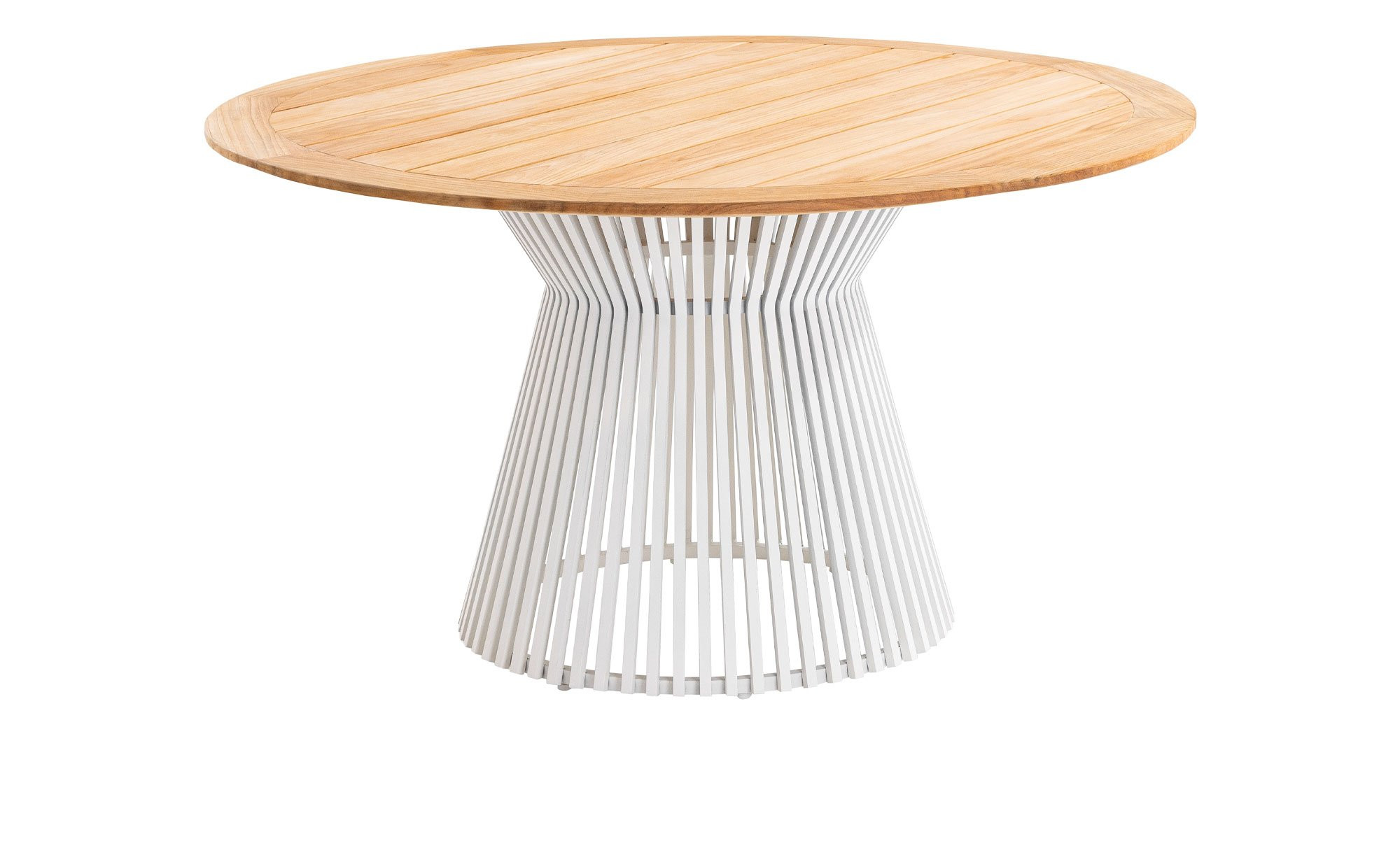 Die Tischplatte des ca. 140 x 76 x 140 cm großen Gartenmöbelstücks ist rund und wurde aus farblich naturbelassenem Teakholz mit geölter Oberfläche gefertigt. Ein besonderes Detail ist die fein gearbeitete Facettenkante, die der Platte zusätzlichen Charme verleiht. Das pulverbeschichtete Lamellen-Gestell aus Aluminium im Farbton Ivory bildet dazu einen stilvollen Kontrast.