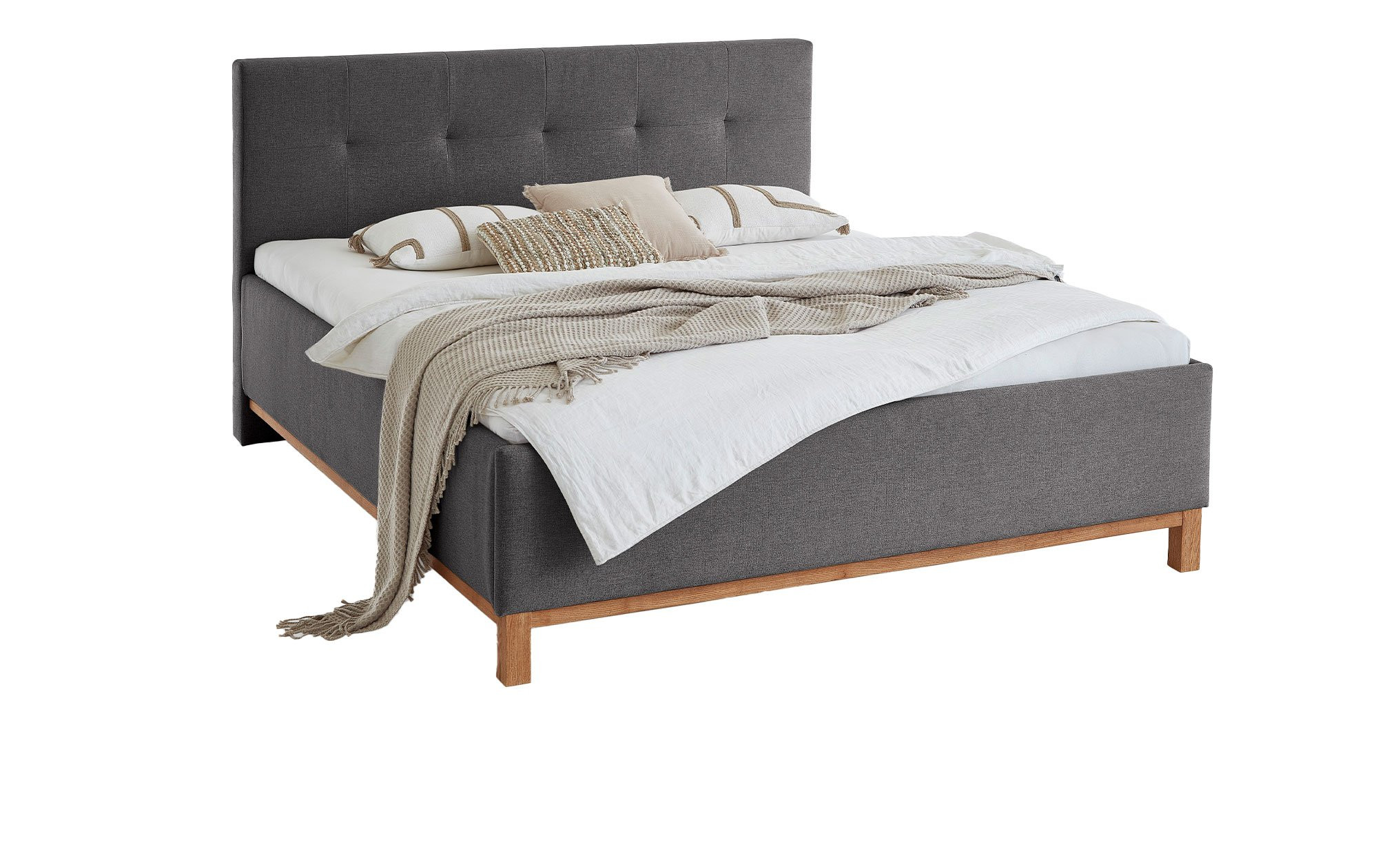Der ca. 186 x 112 x 213 cm große Artikel ist mit einem anthrazitfarbenen Bezug aus 100 % Polyester versehen und überzeugt durch ein stilvoll gestepptes Kopfteil inklusive USB-Anschluss. Eichenholzfüße unterstreichen den hochwertigen Gesamteindruck.