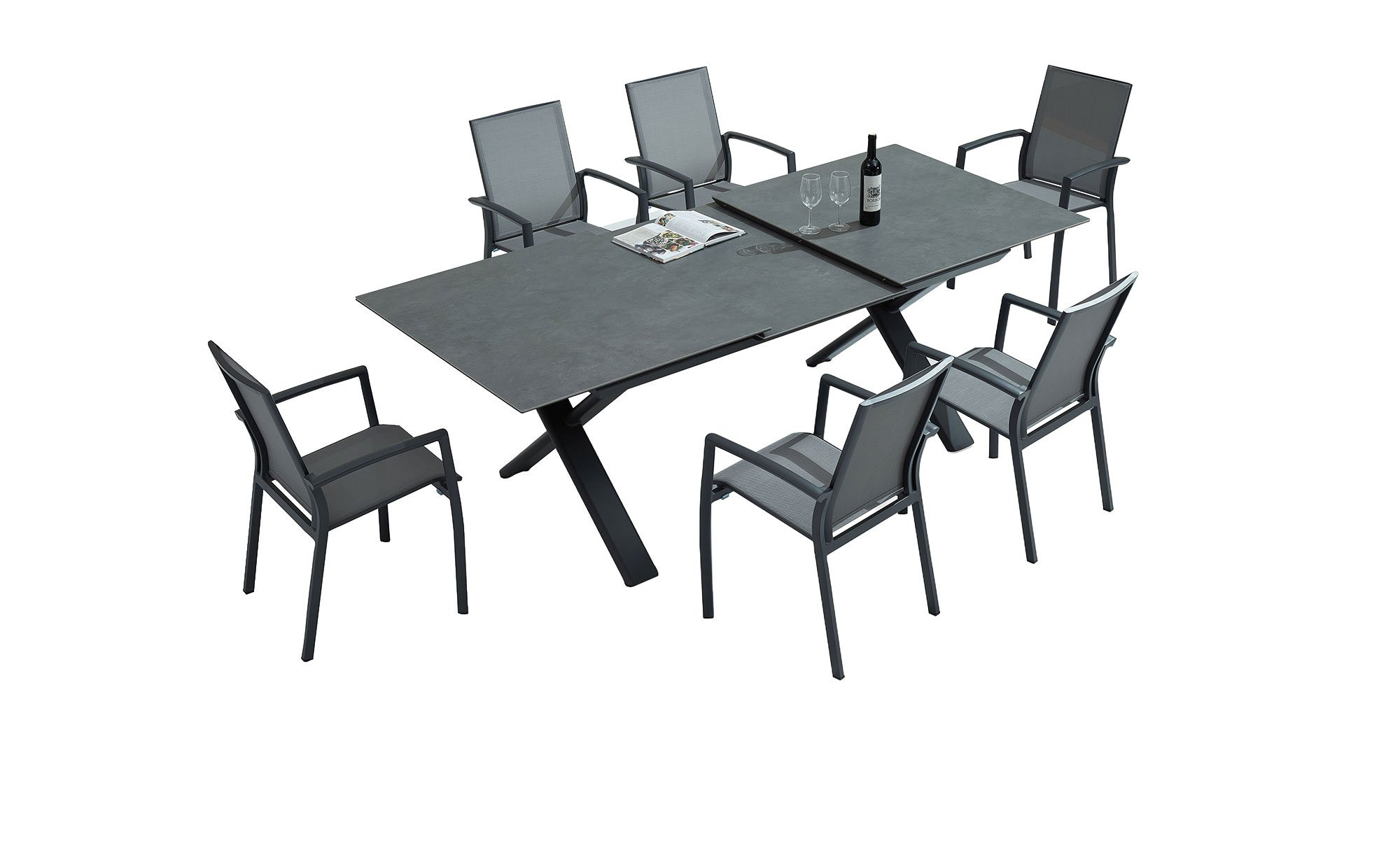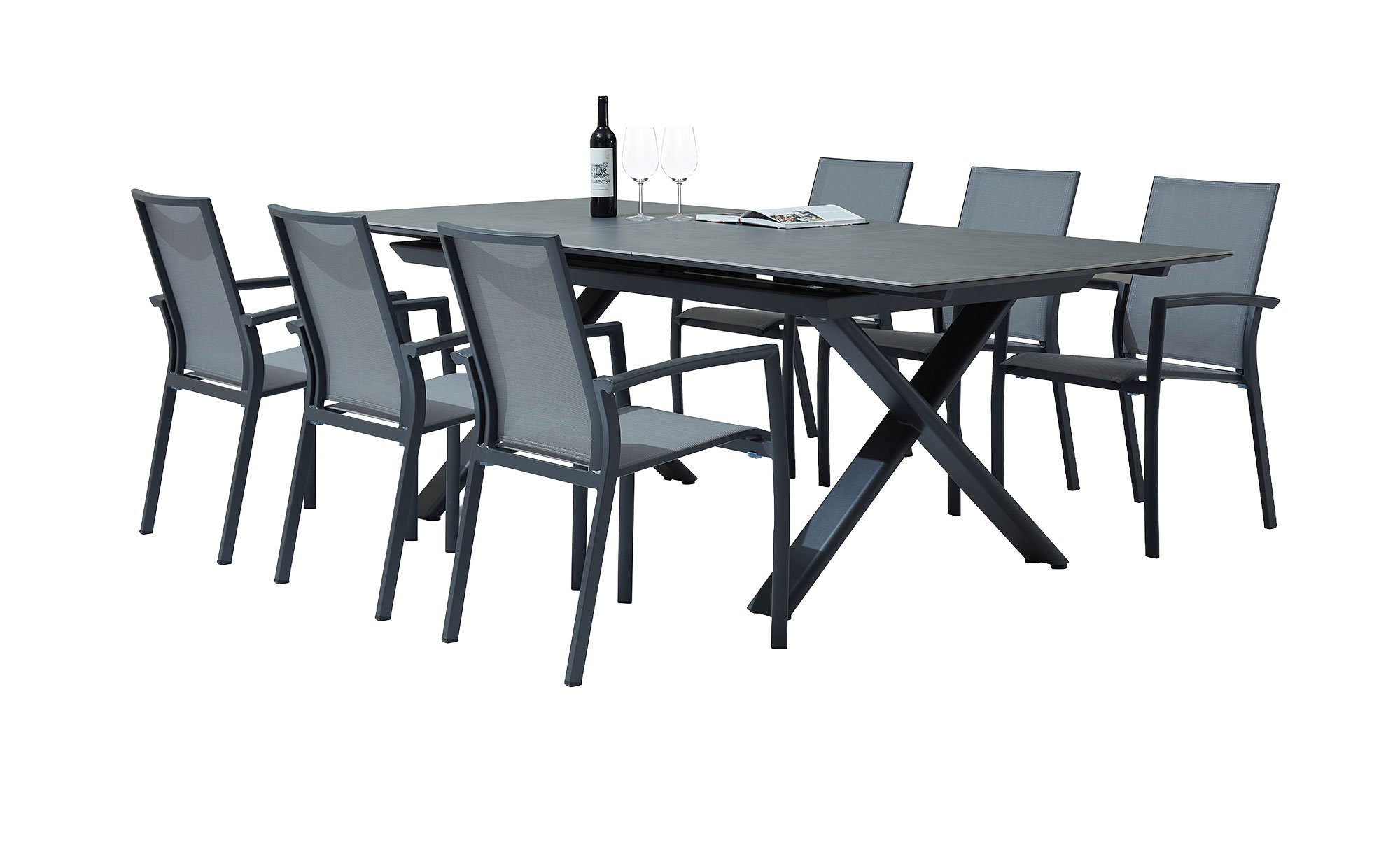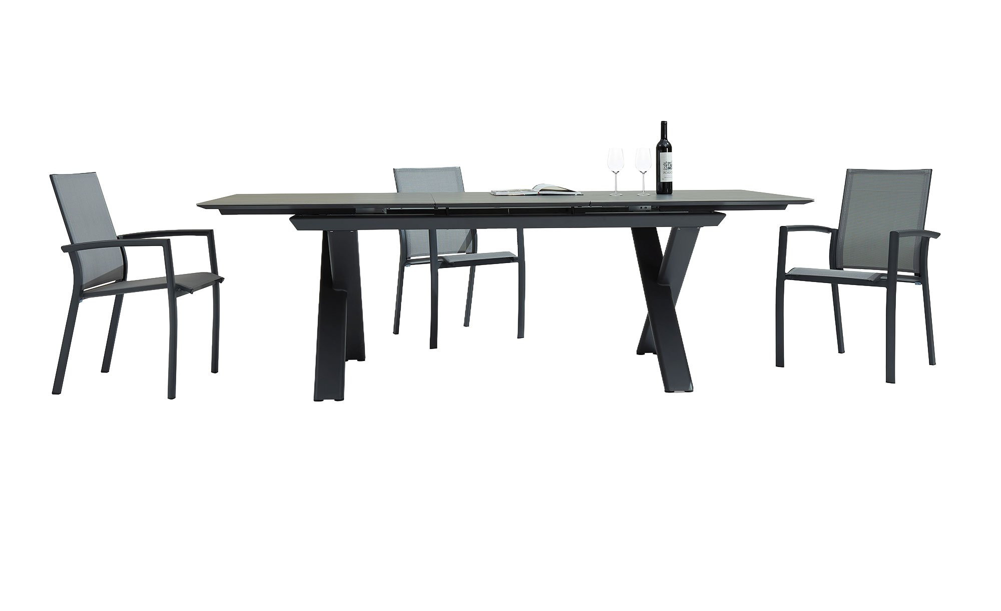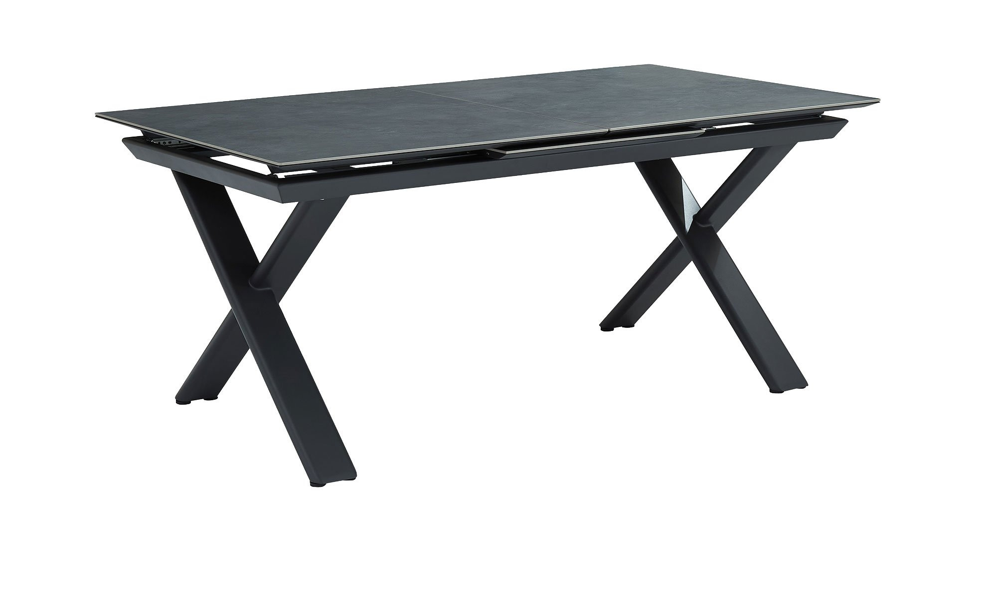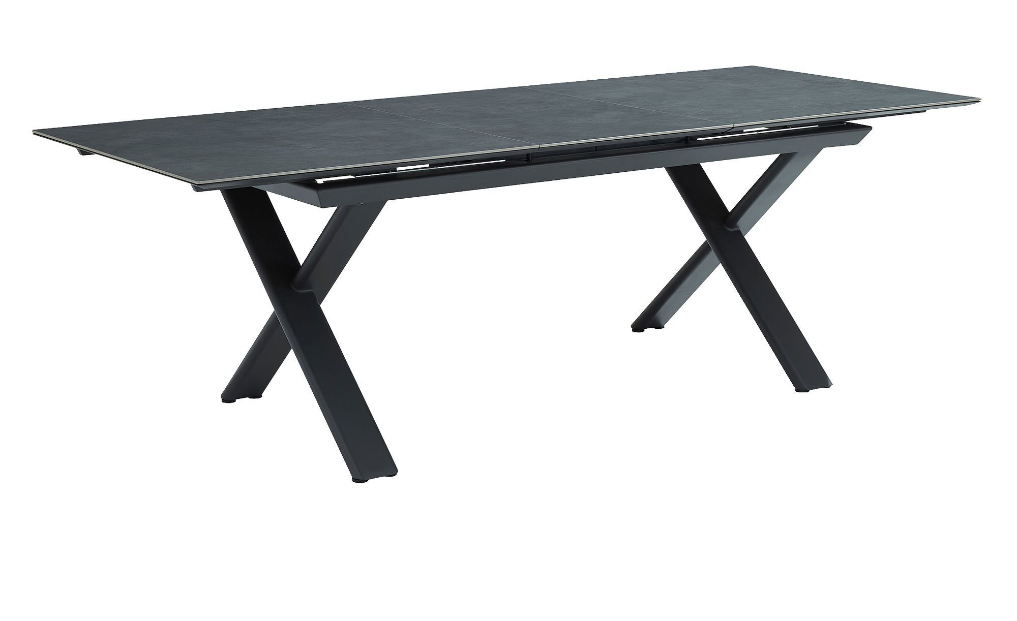 Ein stabiles X-Gestell aus pulverbeschichtetem Aluminium in Anthrazit sorgt für den sicheren Stand des Artikels von outdoor. Seine Beine bestehen aus ca. 120 x 40 mm umfassenden Rohren und tragen die rechteckige Tischplatte. Sie wurde aus dunkelgrauem Sinterstein gefertigt.