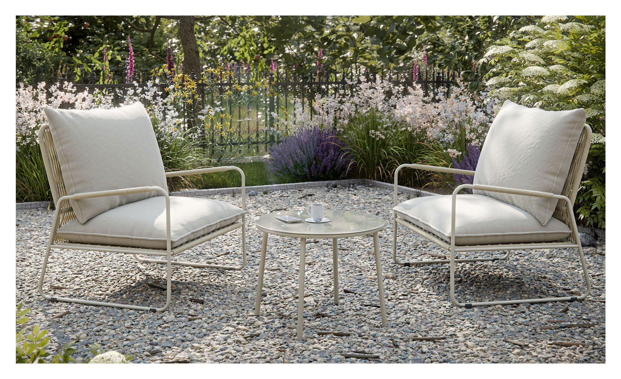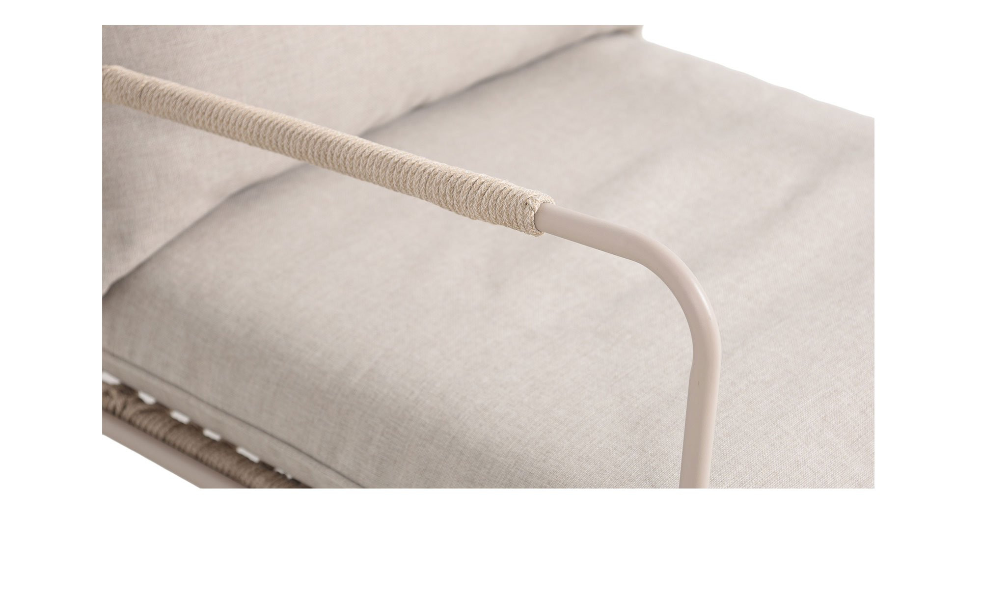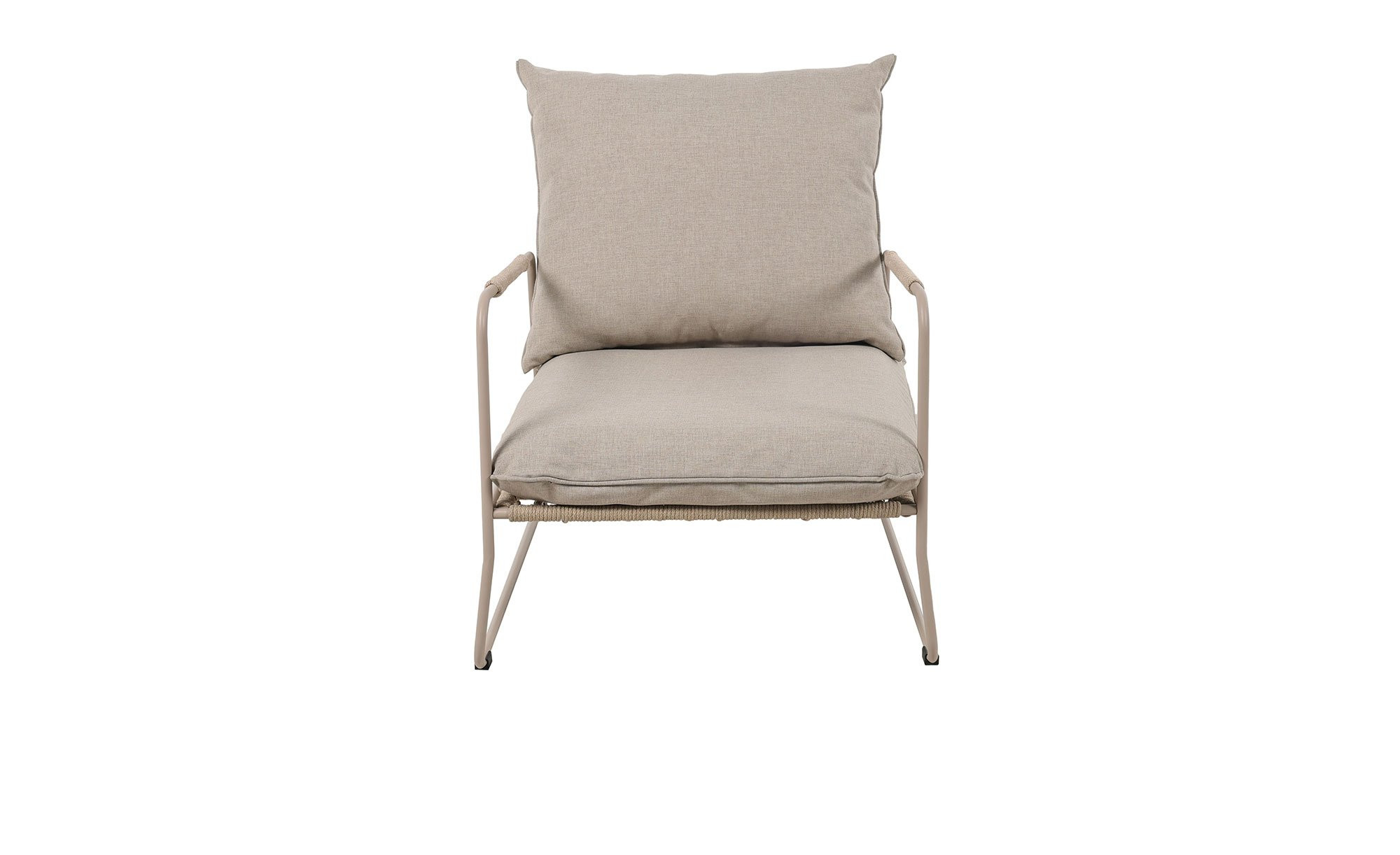 Als Basis verfügen die Artikel von outdoor über stabile Kufengestelle aus beigem, pulverbeschichtetem Stahl. Die Hauptrohre mit einem Durchmesser von ca. 16 mm gewährleisten eine besondere Stabilität, während Seilgeflechte aus Polyester an den Armlehnen, Sitz- und Rückenbereichen der ca. 65 x 80 x 86 cm großen Sessel ein natürliches Flair erzeugen.