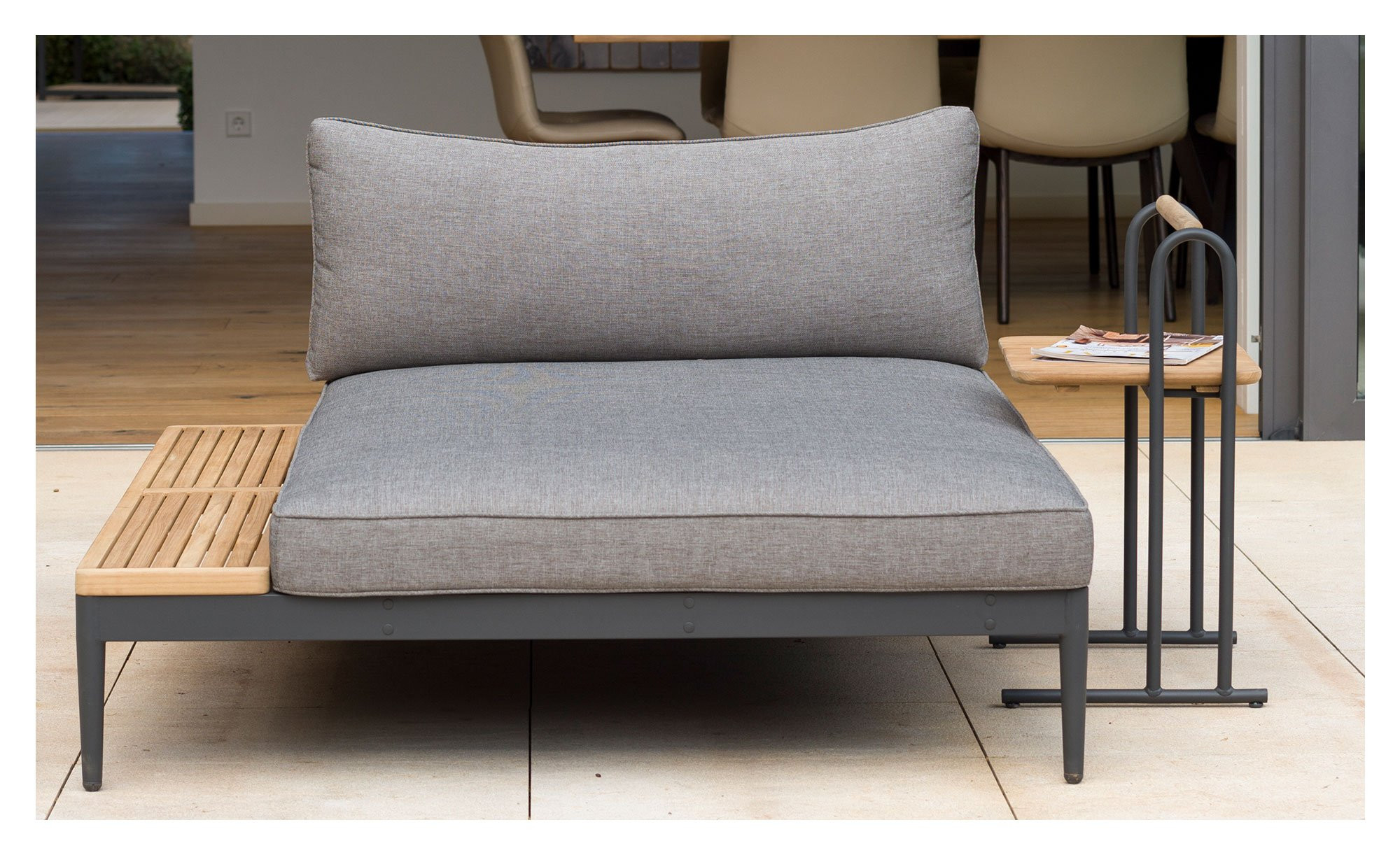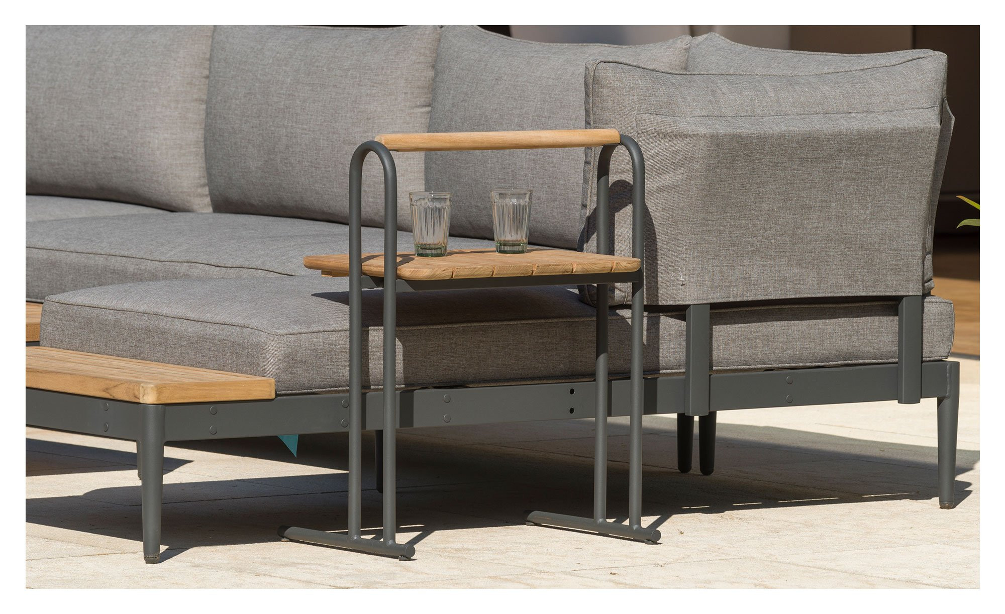 Sie möchten es sich unter freiem Himmel gemütlich machen und suchen eine Ablagefläche für Ihr Getränk, Handy oder Buch? Dann ist der Beistelltisch Topaz der Marke outdoor eine perfekte Wahl! Das ca. 52 x 68 x 37 cm große Möbelstück überzeugt durch ein stabiles und dennoch nicht zu wuchtiges Design. Sein magnesiumgraues Aluminiumgestell ist pulverbeschichtet und trägt zuverlässig die rechteckige Platte aus geschliffenem Teakholz.