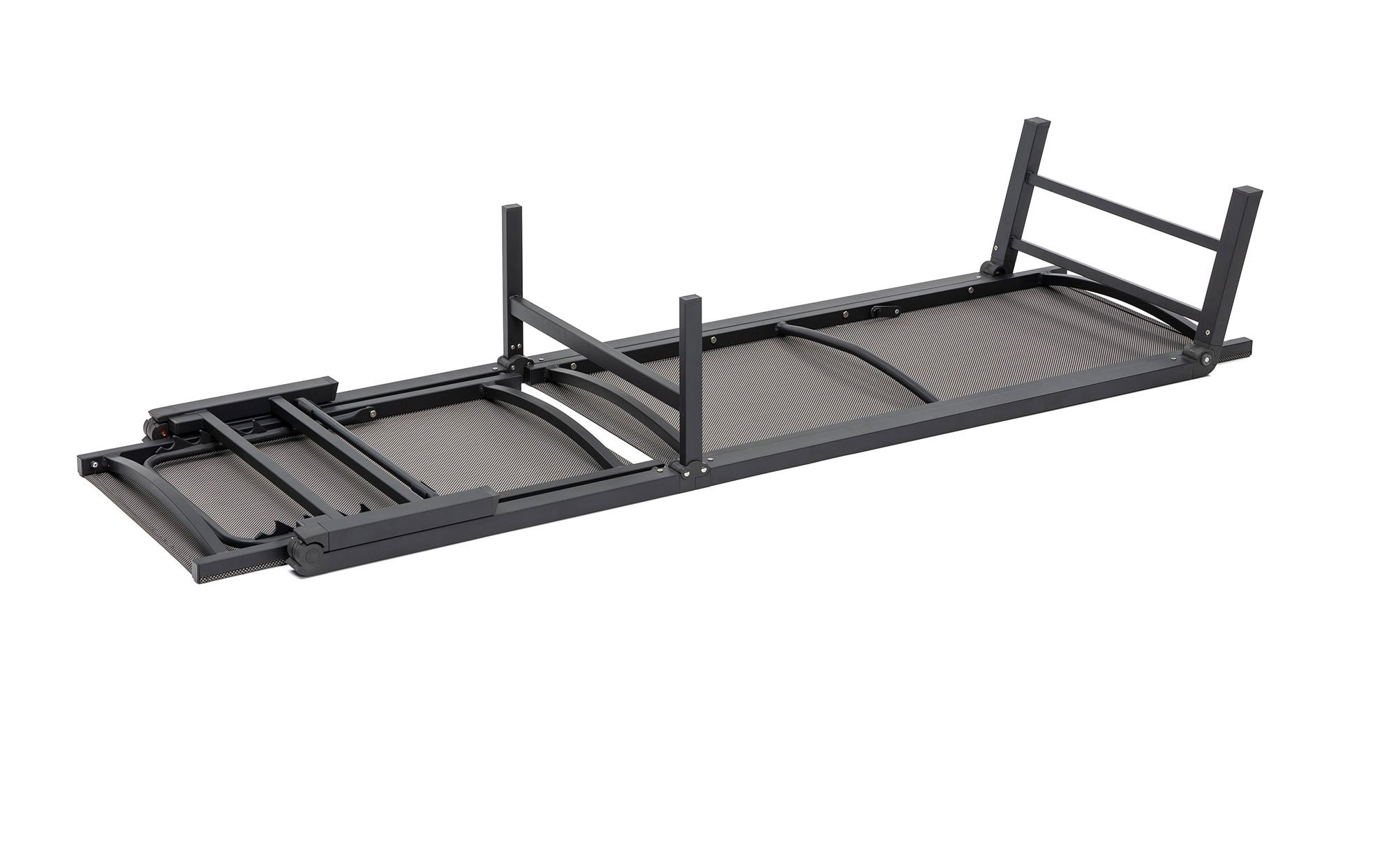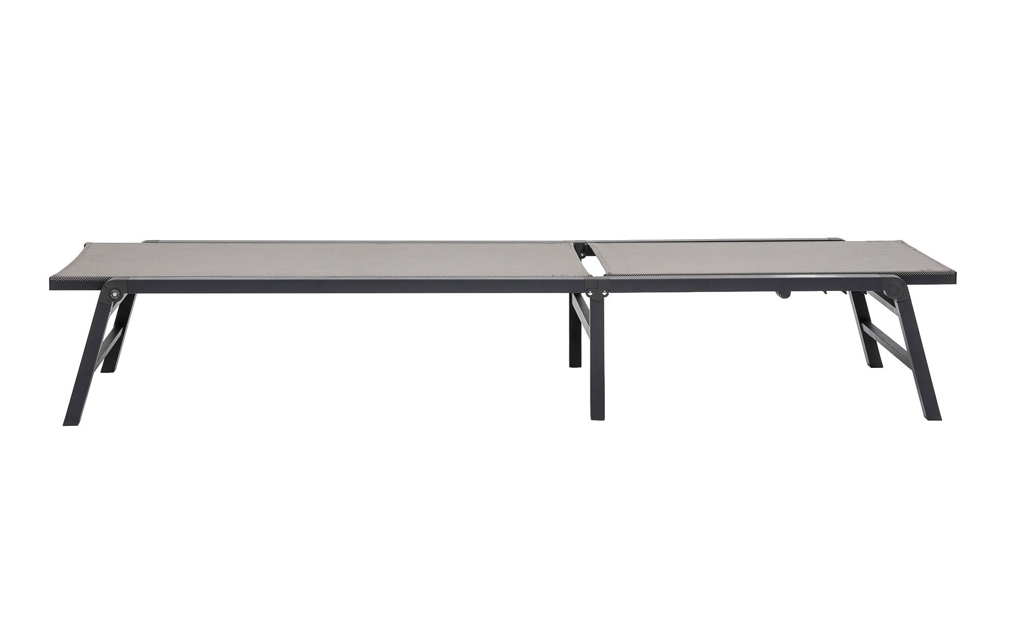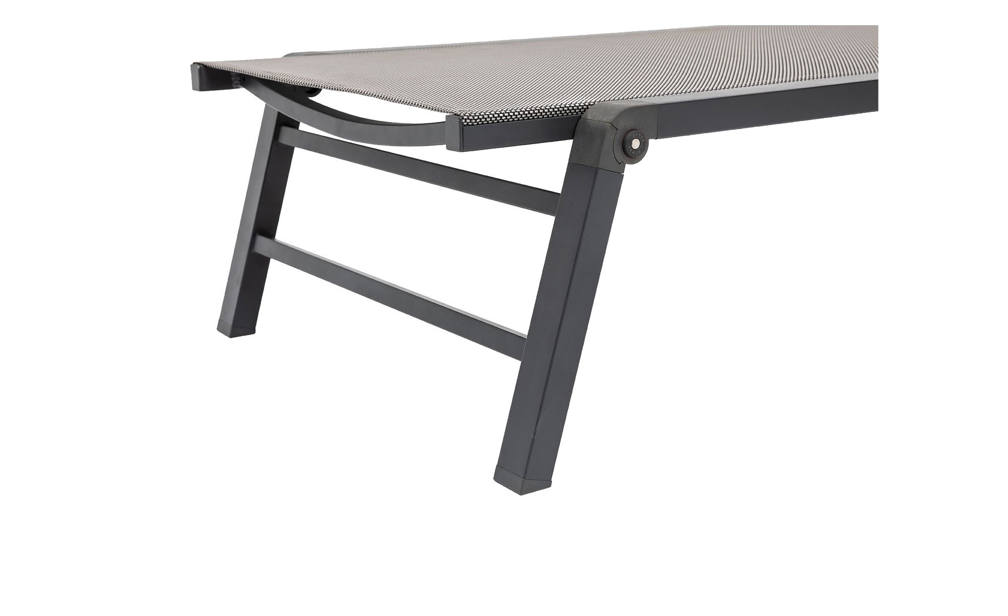 Das sechsfüßige Gestell des Artikels besteht aus einem stabilen Aluminium-Rahmen in Anthrazit mit Pulverbeschichtung. Zudem gibt es eine Liegefläche aus grauem Olefin.