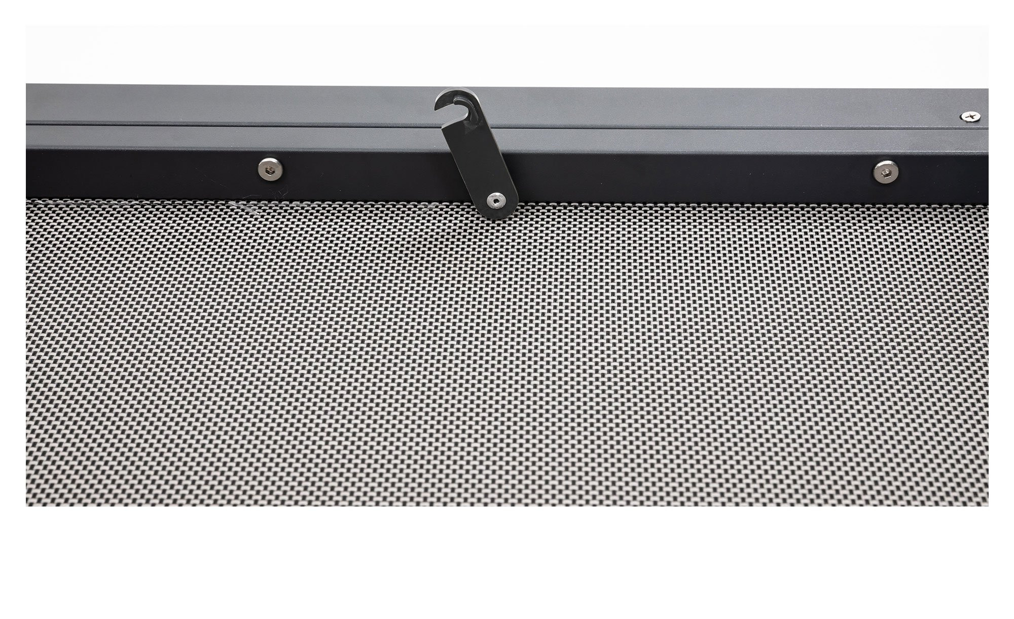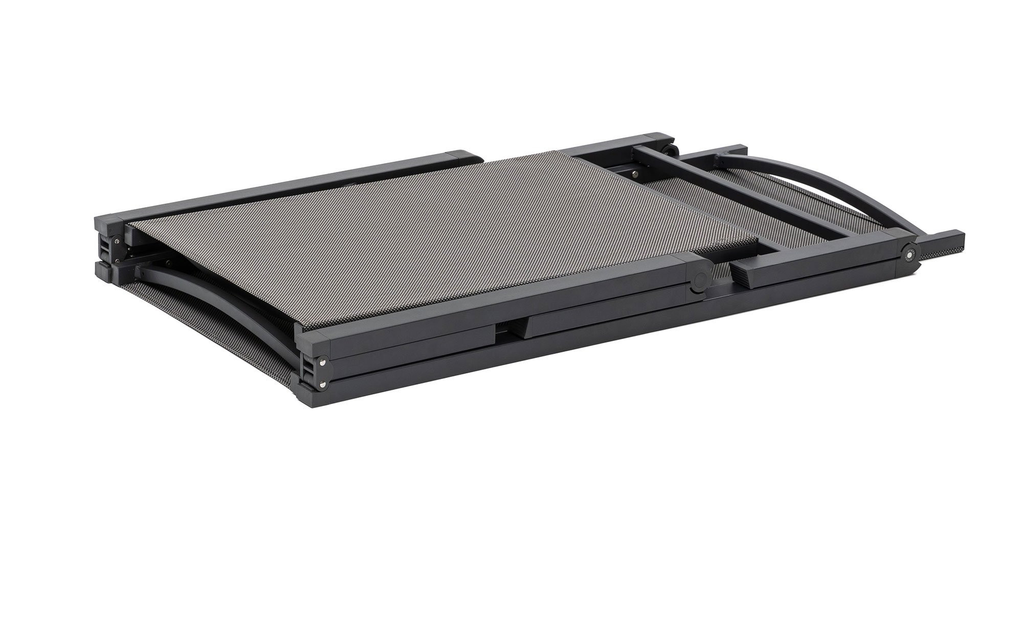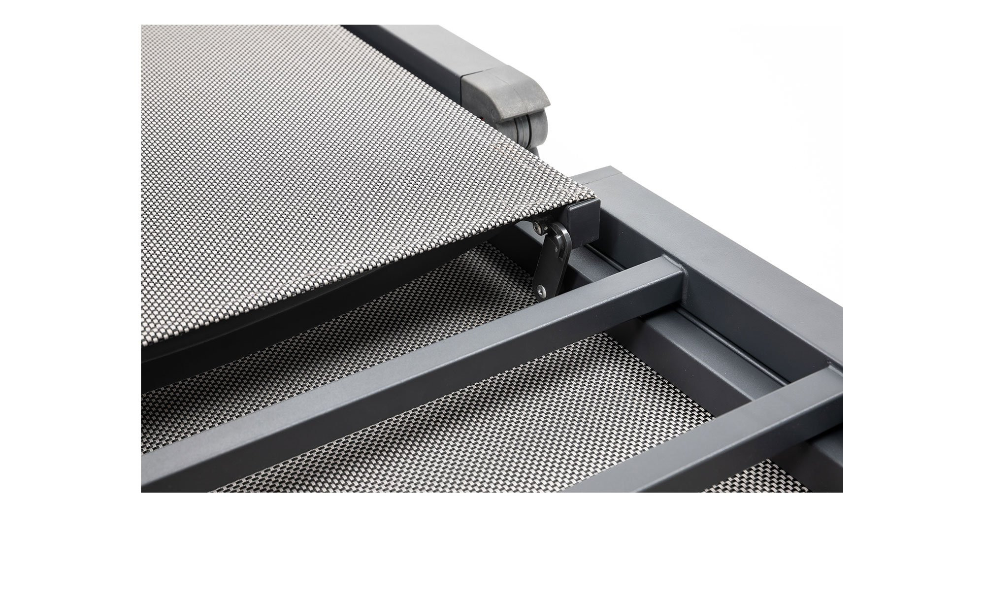 Das sechsfüßige Gestell des Artikels besteht aus einem stabilen Aluminium-Rahmen in Anthrazit mit Pulverbeschichtung. Zudem gibt es eine Liegefläche aus grauem Olefin.