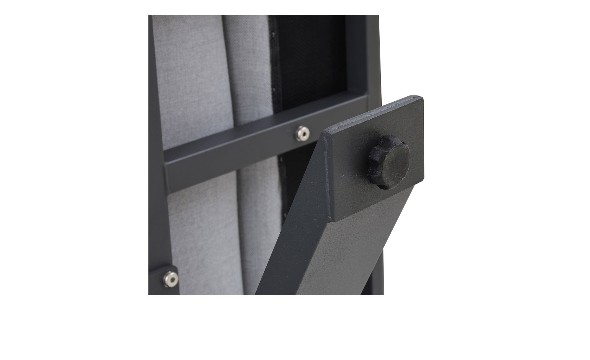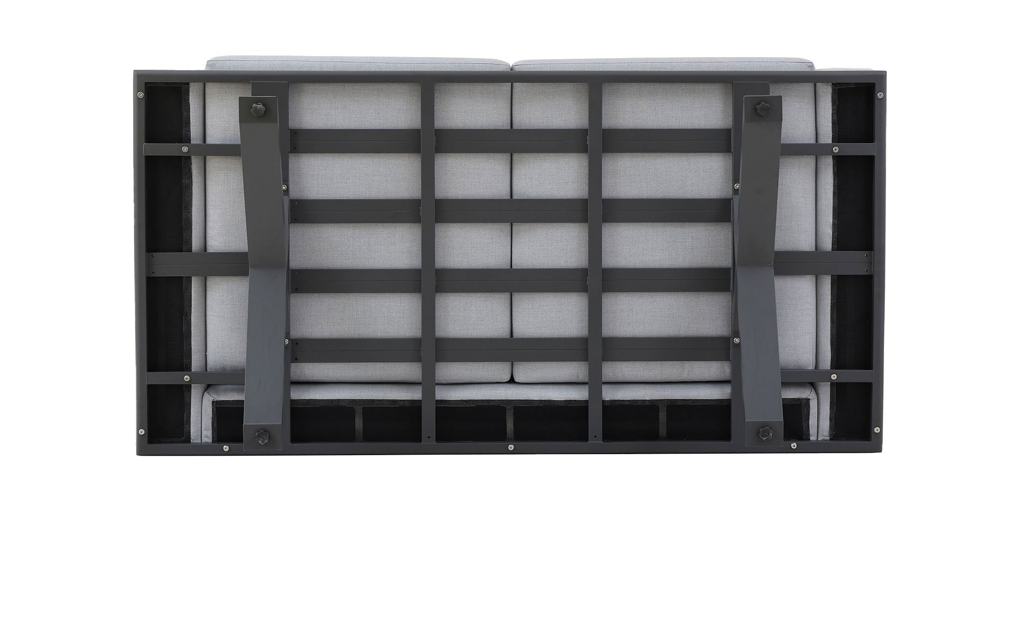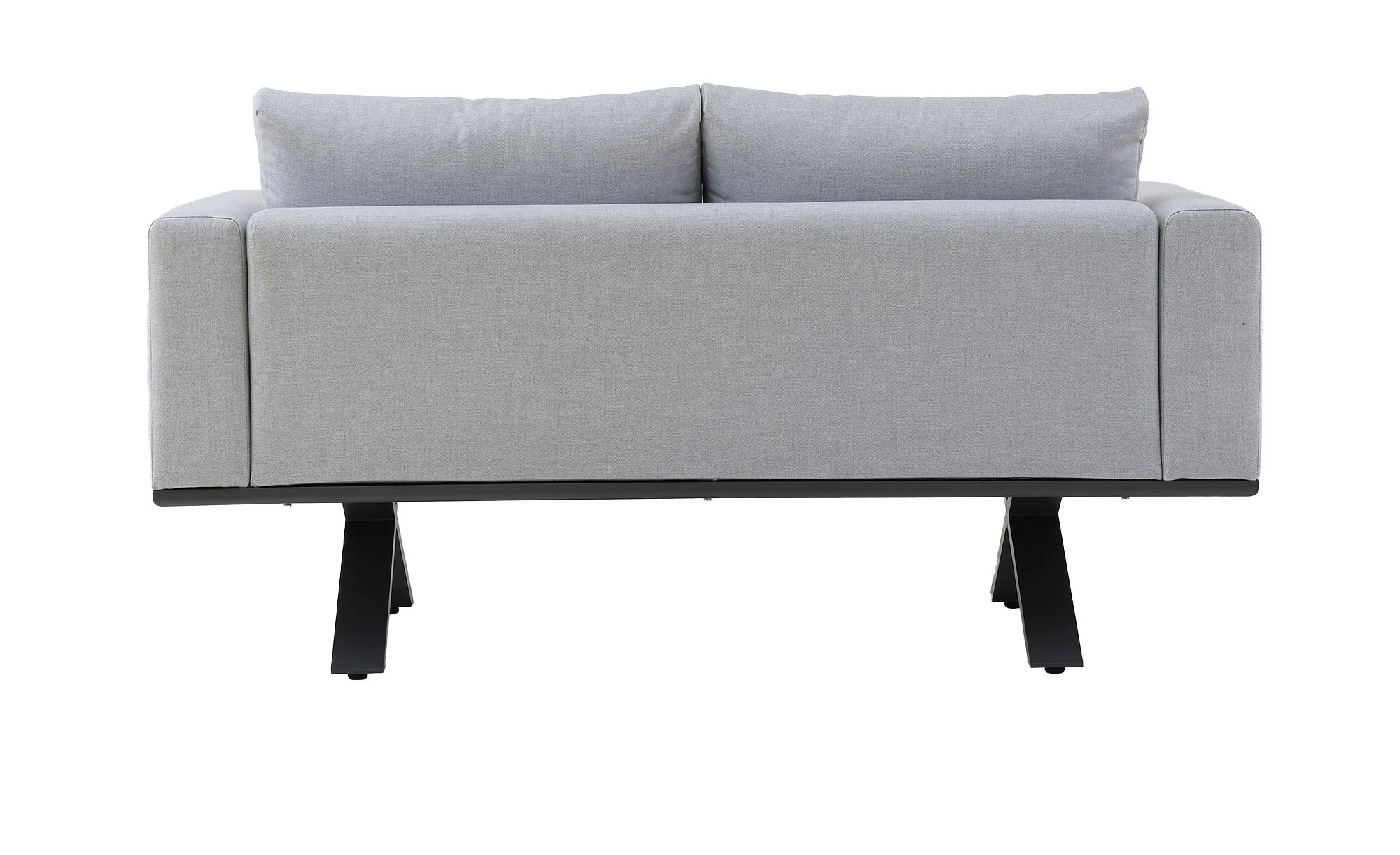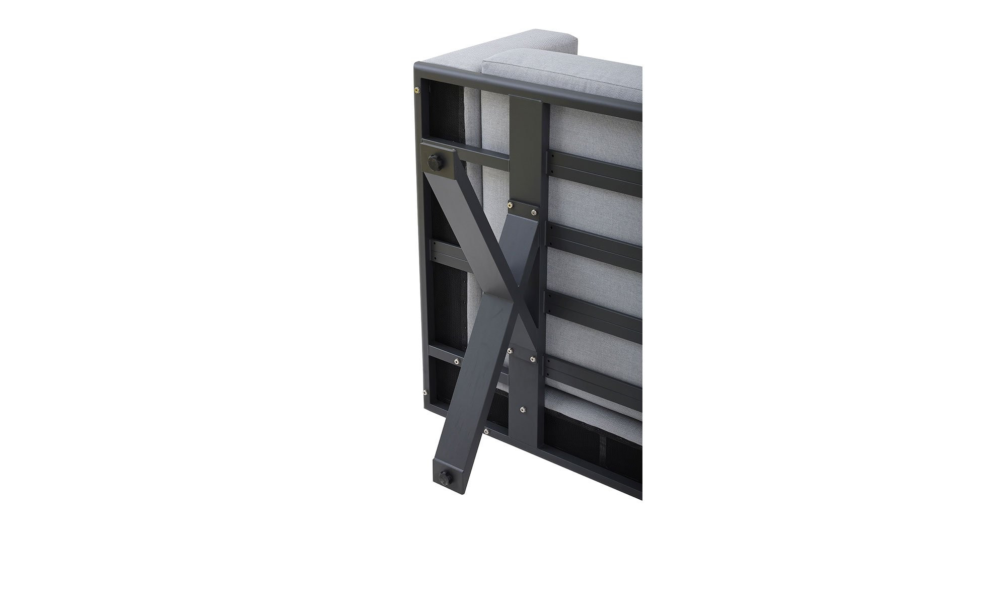 Ein stabiles X-Gestell aus pulverbeschichtetem Aluminium in Anthrazit trägt bei dem ca. 165 x 67 x 80 cm großen Artikel den Sitzbereich. Dieser wird von Armlehnen mit schnell trocknendem Schaum eingefasst und punktet durch ca. 15 cm starke Kissen. Ihr Spinnpolyester-Bezug zeigt sich in einem Grau-Anthrazit und passt damit ideal ins Bild.