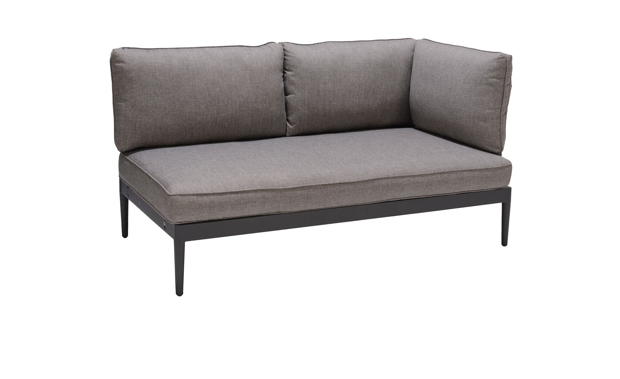 Zum outdoor Gartensofa Topaz gehören außerdem lose Sitz- und Rückenkissen. Die Auflagen sind mit grauem Olefin aus 100 % Polypropylen bezogen. Bei Bedarf lässt sich das atmungsaktive Material jederzeit abnehmen und waschen.