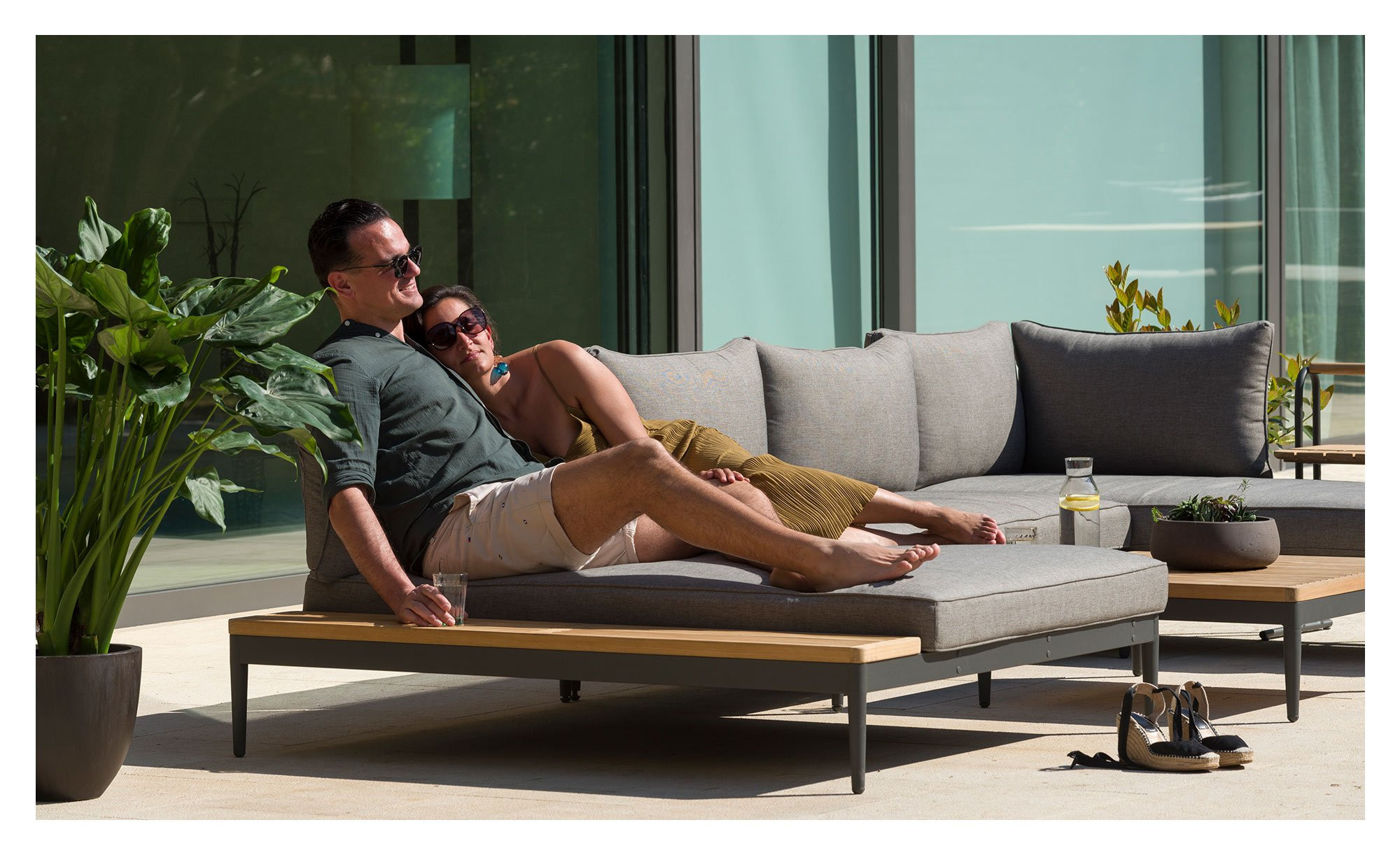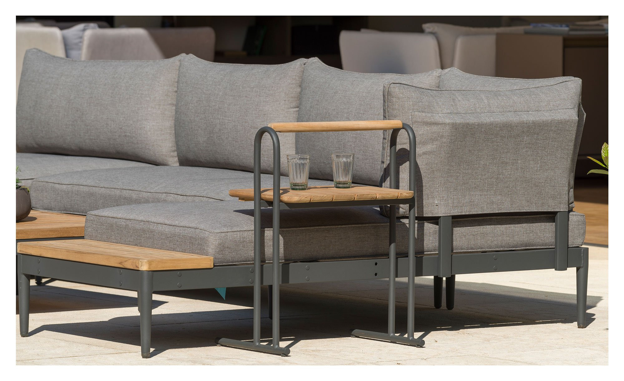 Mit einem pulverbeschichteten, rostfreien Gestell aus magnesiumgrauem Aluminium präsentiert sich das Gartensofa zugleich leicht und stabil. Seine Armlehnen sind beidseitig montierbar, sodass eine wechselseitige Nutzung ermöglicht wird.