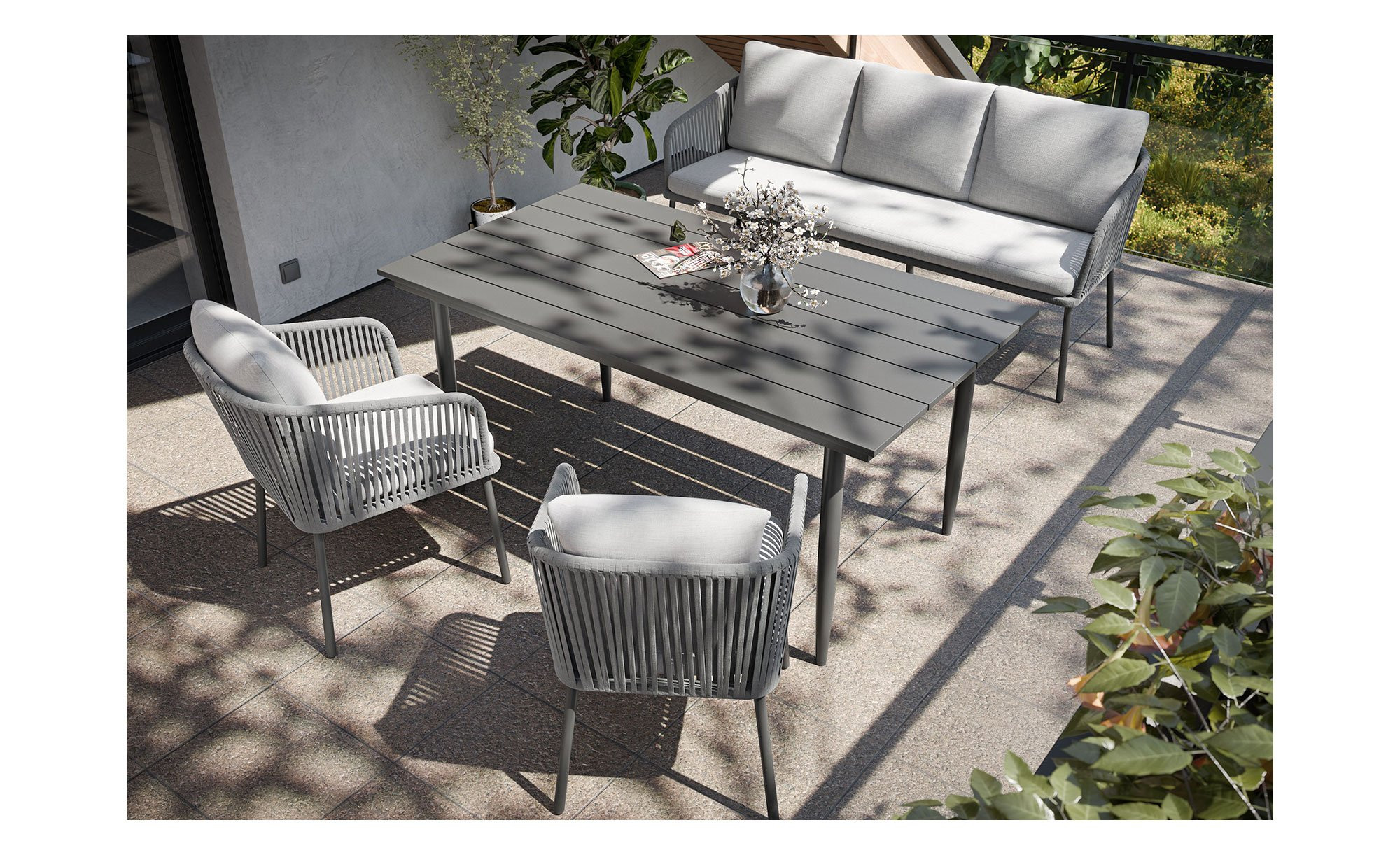 Das ca. 57 x 76 x 63 cm große Möbelstück verfügt über ein vierfüßiges Metallgestell aus schwarzem Stahl. Darum spannt sich ein modernes Seilgeflecht aus grauem Textilene. Auch eine Auflage aus ebenfalls grauem Polyester ist im Angebot enthalten.