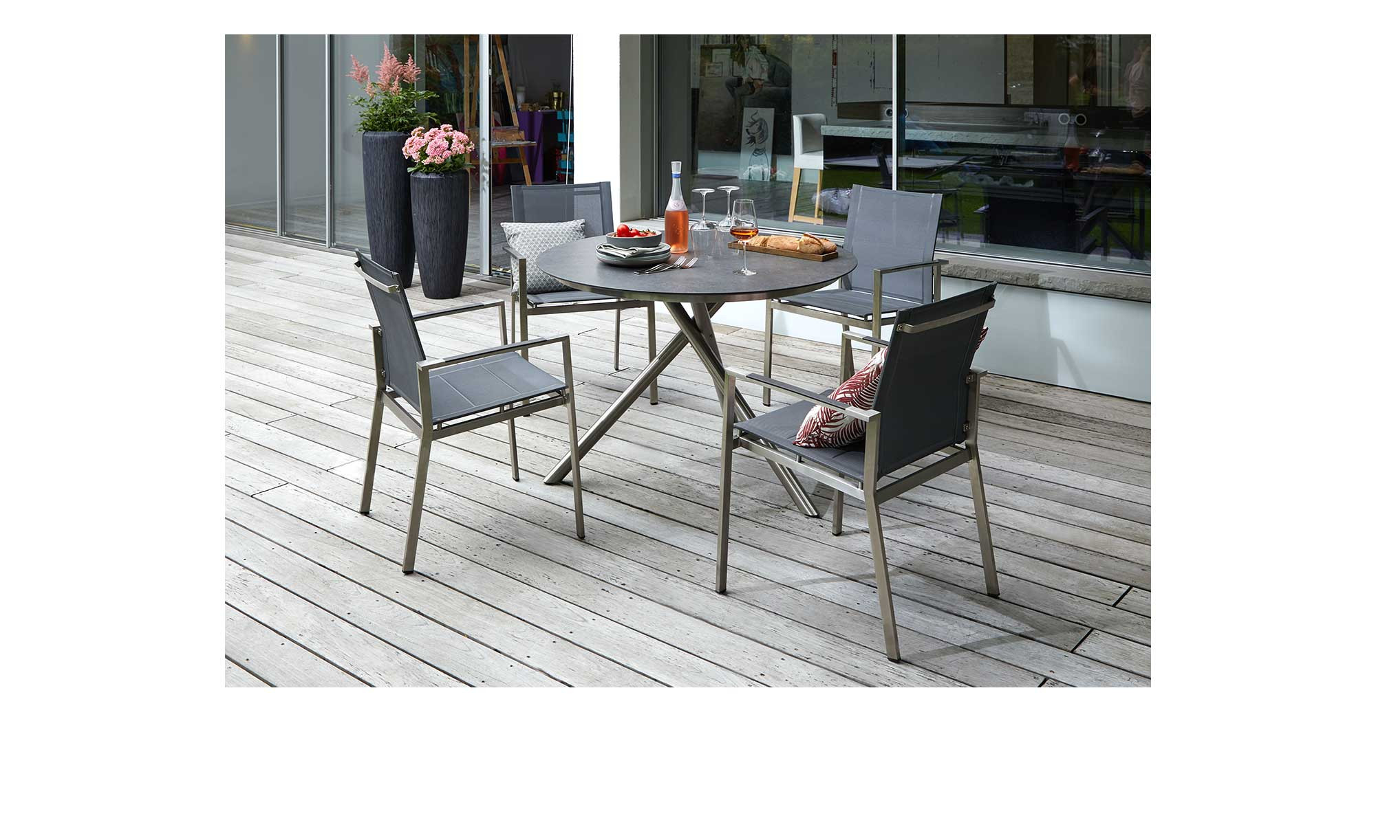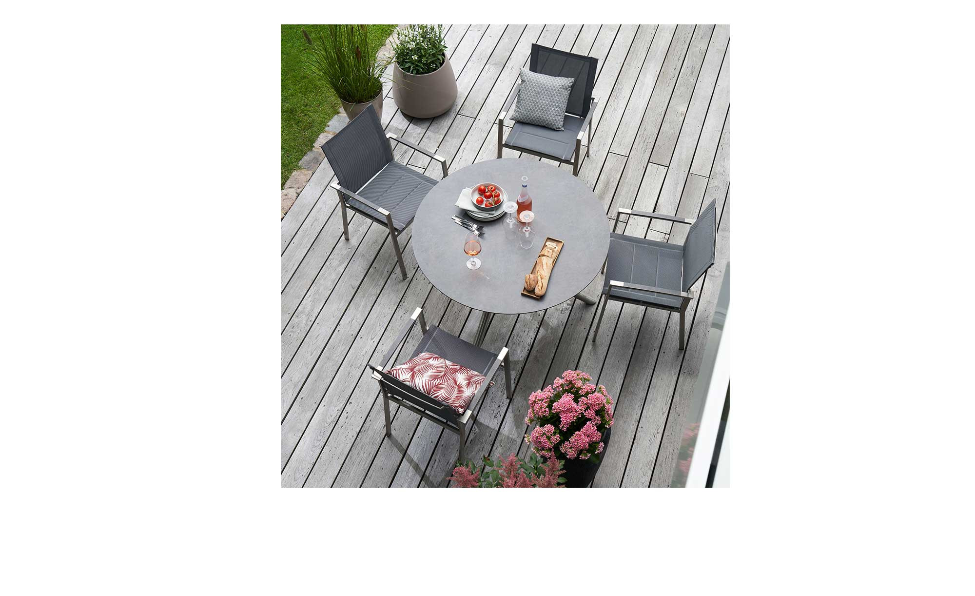 Der Gartentisch Alina I ist durch seine graue Farbgebung vielseitig kombinierbar.