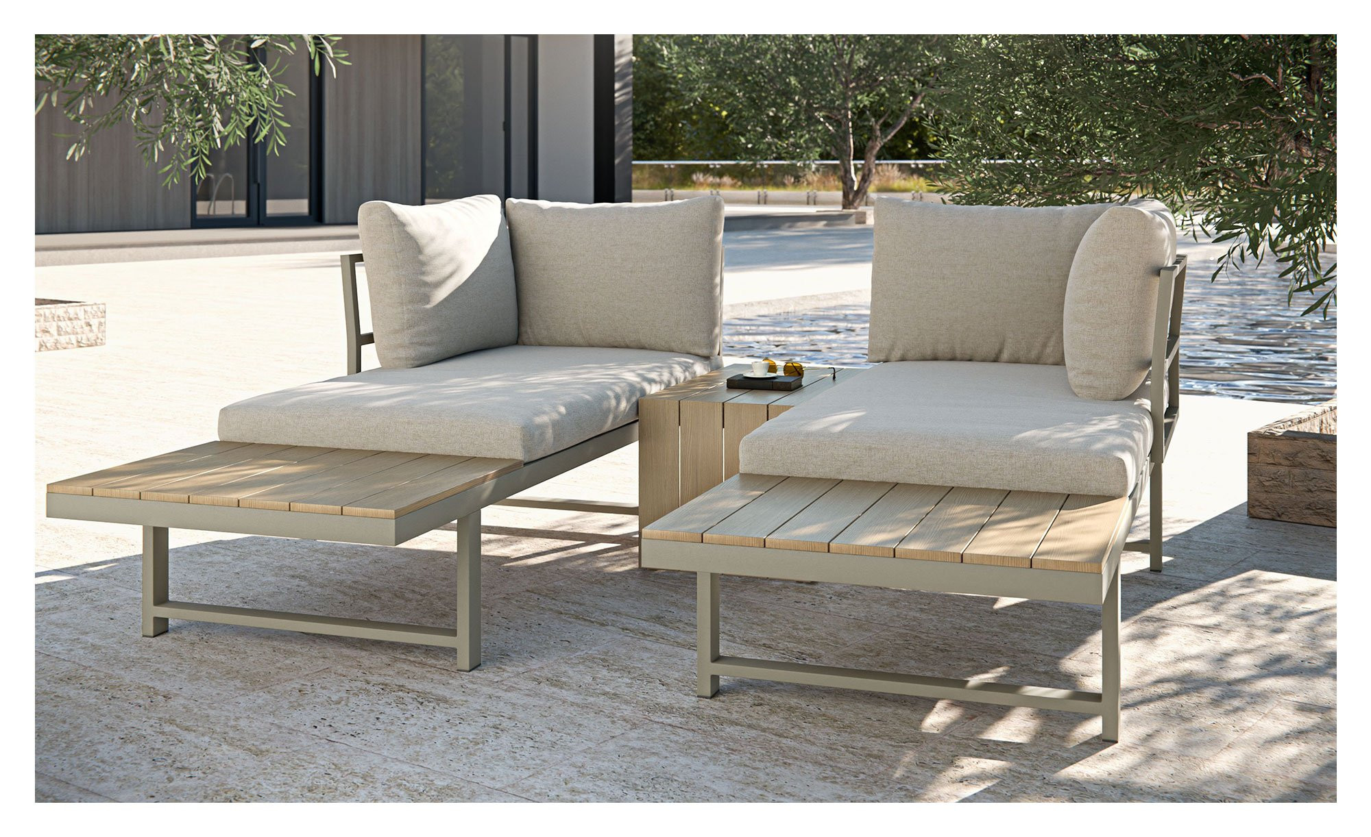 Das Set besteht aus einem Tisch und zwei 2-Sitzer Sofas mit Maßen von ca. 175 x 70 x 72 cm. An ihren aus Aluminium gefertigten Gestellen verfügen die Möbel über Kufenfüße und eine beige Pulverbeschichtung. Zusätzlich dürfen Sie sich auf Kunststoff-Latten in authentischer Holz-Optik freuen. Beim ca. 70 x 39 x 40 cm großen Tisch erwartet Sie zudem eine mit max. 70 kg belastbare Platte.
