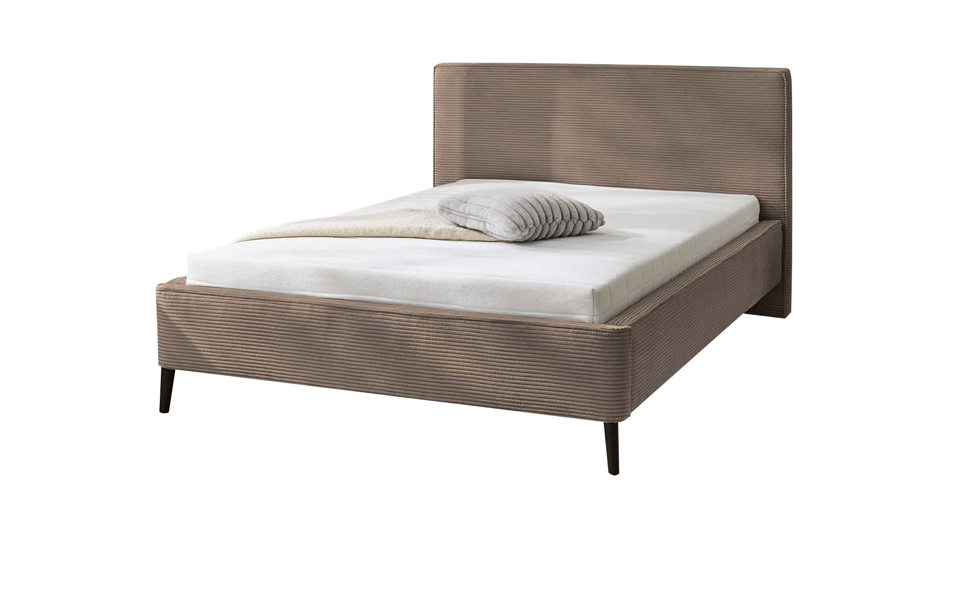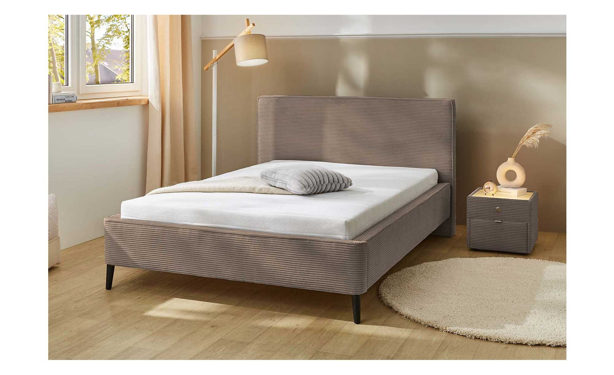 Mit Abmessungen von ca. 162 x 101 x 221 cm ist das Bett sehr geräumig. Es wurde mit einem weichen Cord-Stoff aus 100 % Polyester in der Farbe Taupe bezogen. Das Material zeigt sich mit über 50.000 Scheuertouren als äußerst strapazierfähig und langlebig. Schwarze Metallfüße bieten eine angenehme Bodenfreiheit von ca. 15 cm.