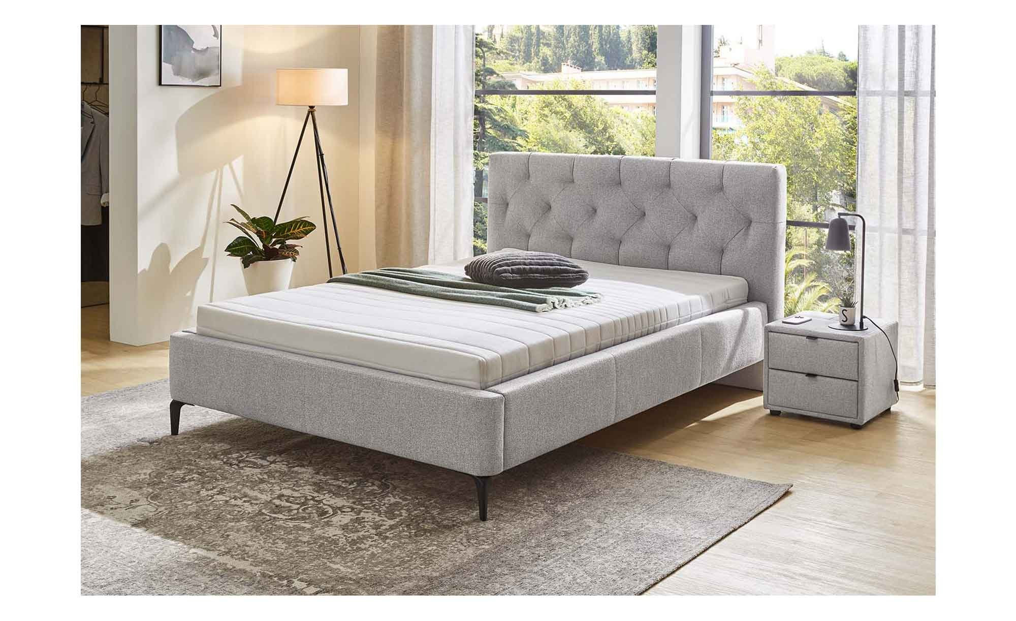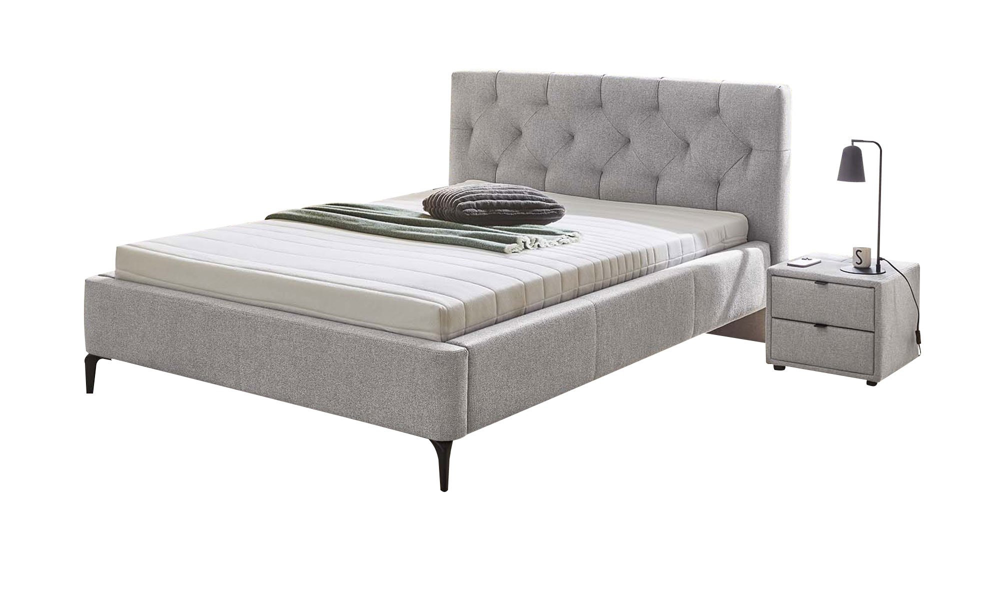 Bezogen ist das ca. 163 x 103 x 221 cm große Bett mit einem hellgrauen Flachgewebe aus 100 % Polyester. Über 50.000 Scheuertouren unterstreichen die Qualität und Haltbarkeit des Materials. Schwarze Metallfüße fügen sich ideal ins Gesamtbild und gewährleisten eine Bodenfreiheit von ca. 15 cm.