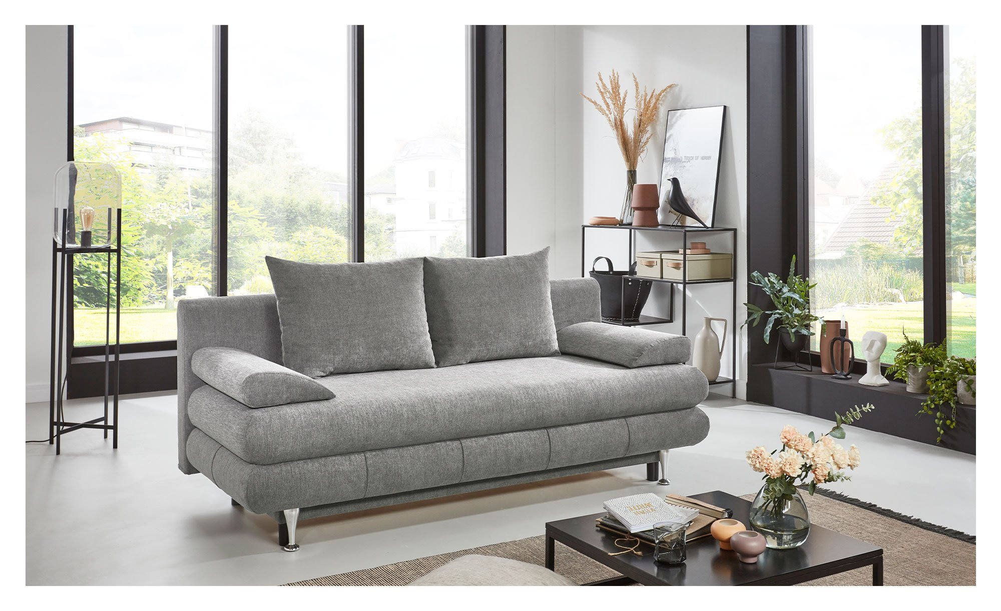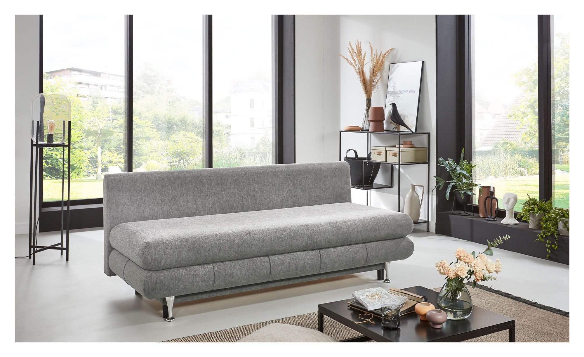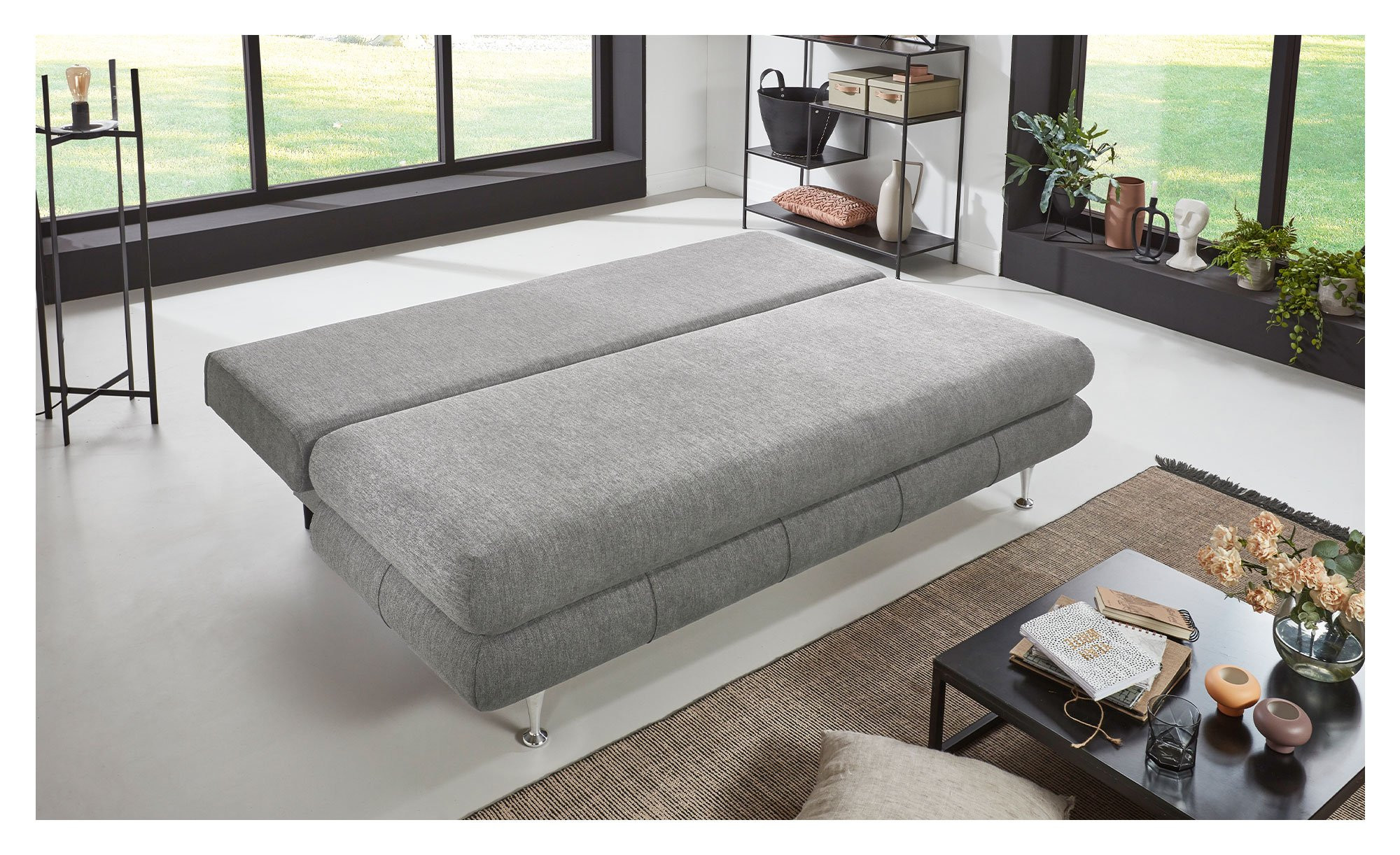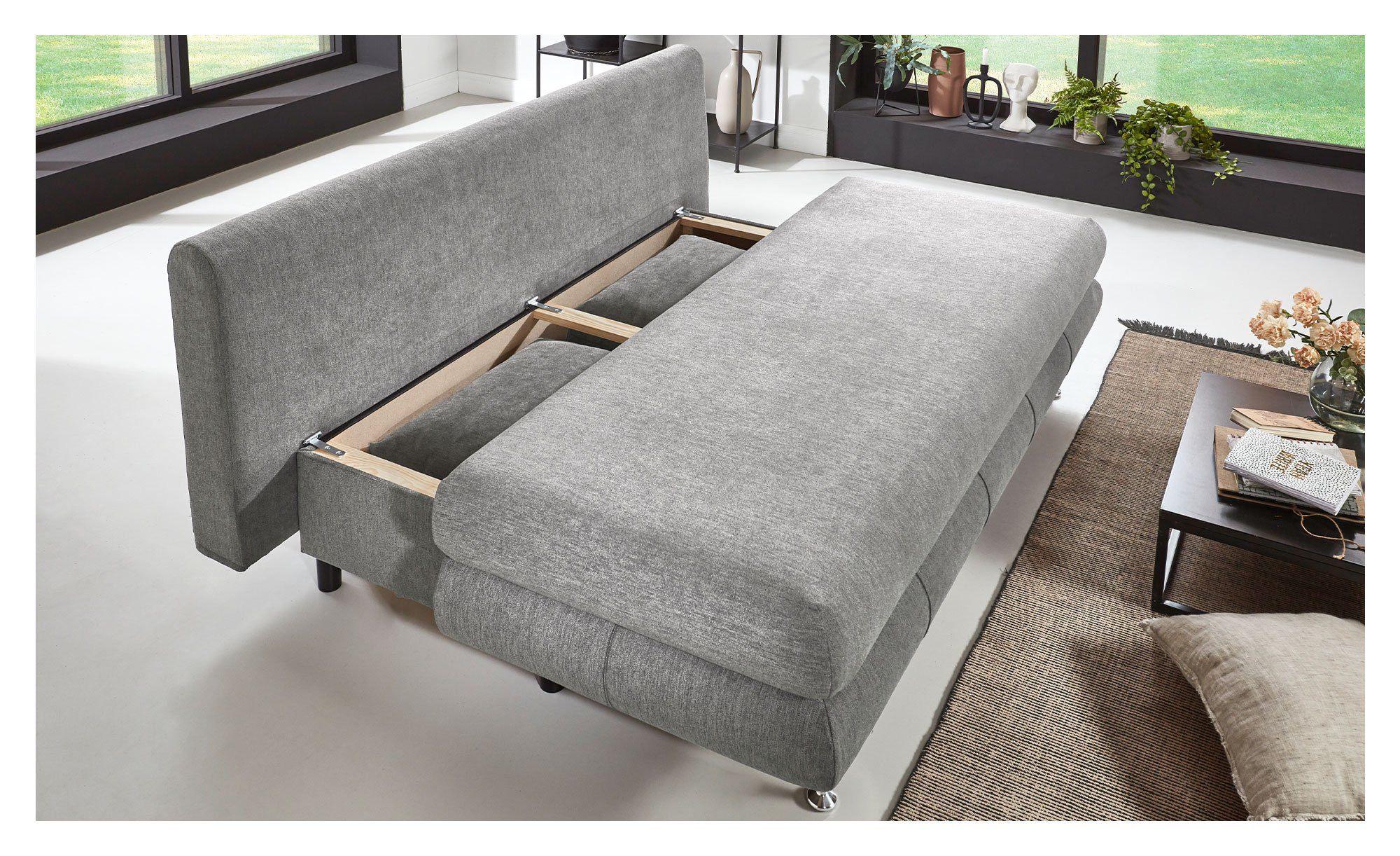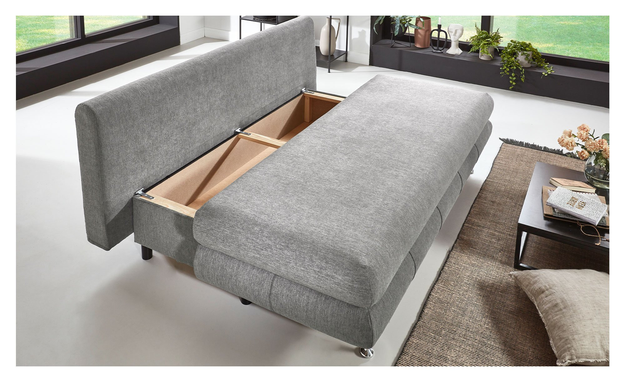 Bei Bedarf lässt sich das Sofa schnell und einfach zu einer ca. 140 x 188 cm umfassenden Liegefläche mit einer Liegehöhe von ca. 45 cm ausklappen. Neben dieser praktischen Schlaffunktion bietet es Ihnen außerdem einen Bettkasten mit wertvollem Stauraum.
