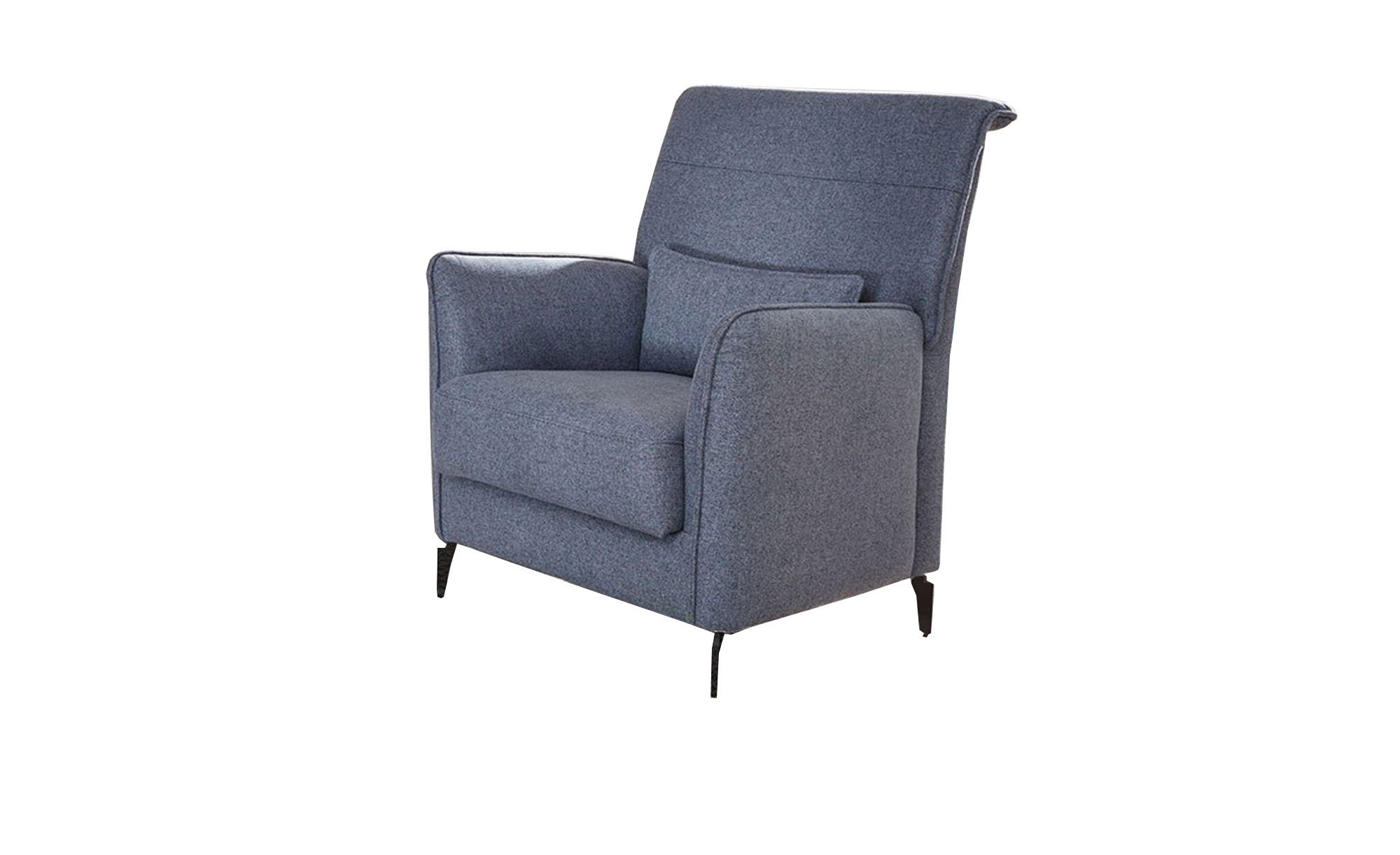 Als Bezug fungiert bei dem ca. 77 x 96 x 90 cm großen Möbelstück ein blauer Stoff, der auch den Rücken umspannt. Somit sind Sie bei der Platzierung vollkommen flexibel. Die schwarzen Füße mit Struktur sind ca. 12 cm hoch.
