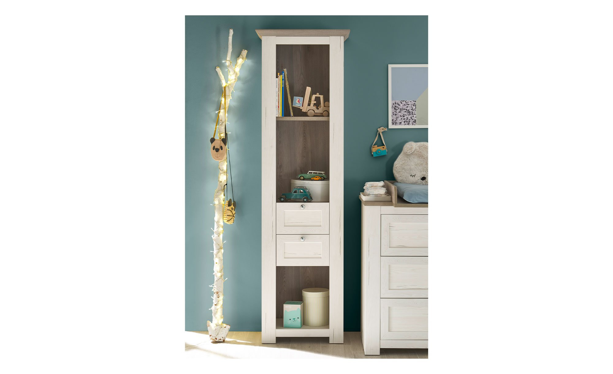 Das ca. 60 x 200 x 39 cm große Stauraumregal steht dank seiner stabilen Kunststofffüße in Schwarz sicher auf jedem Boden. Zwei praktische Schubkästen mit silbernen Zinkdruckguss-Griffen sowie drei offene Fächer bieten reichlich Platz für Bücher, Deko oder Alltagsgegenstände.