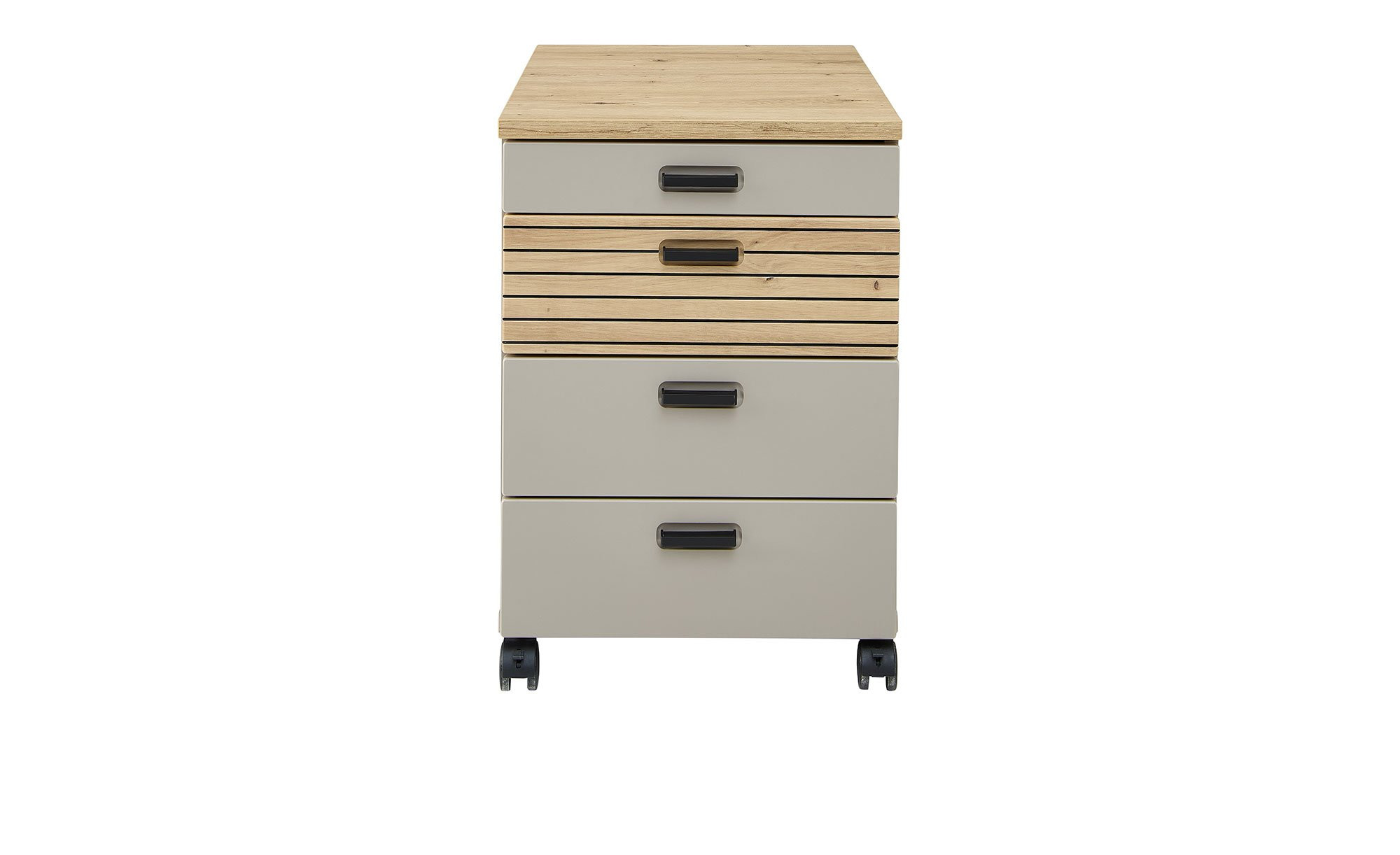 Front und Korpus sind aus Holzwerkstoff gefertigt und in einem Basalt-Ton gehalten. Für ein natürliches Gesamtbild sorgt die Absetzung mit ihrer Artisan Eiche Nachbildung, während matt schwarze Kunststoffgriffe das Design abrunden. Bei den Füßen haben Sie die Wahl: Entweder nutzen Sie vier schwarze Rollen (zwei gebremst, zwei ungebremst) oder entscheiden sich für einen Sockel in Basalt.