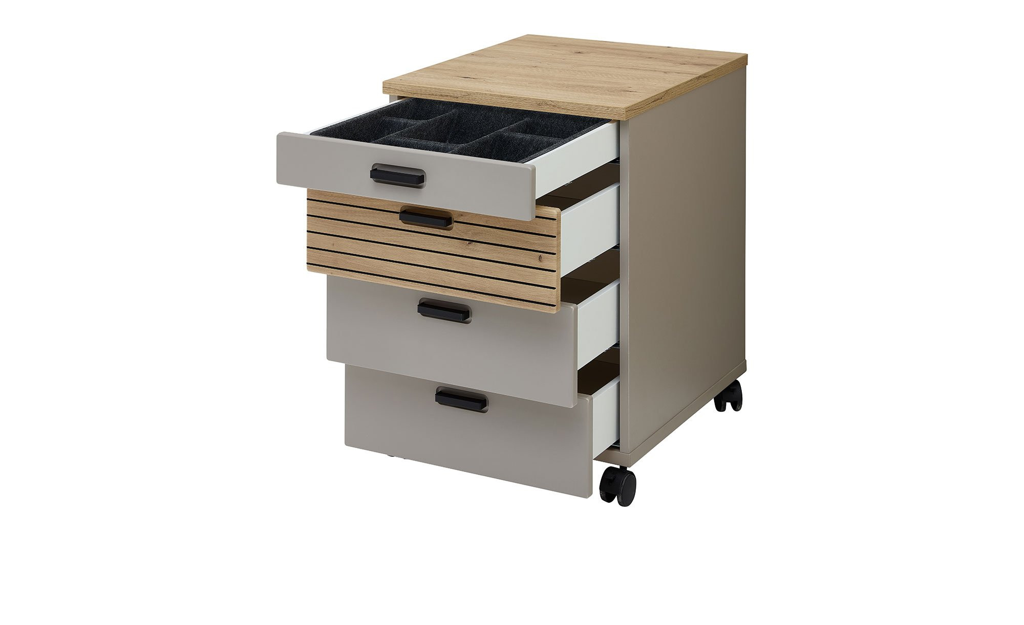 Dank vier Soft-Close-Schubladen, von denen die obere über eine graue Filzeinlage für Stifte verfügt, können Sie Ihre Büro-Utensilien übersichtlich im ca. 45 x 66 x 55 cm großen Rollcontainer Glenn verstauen.