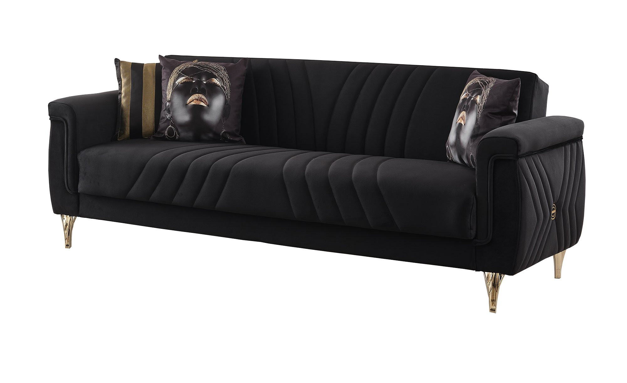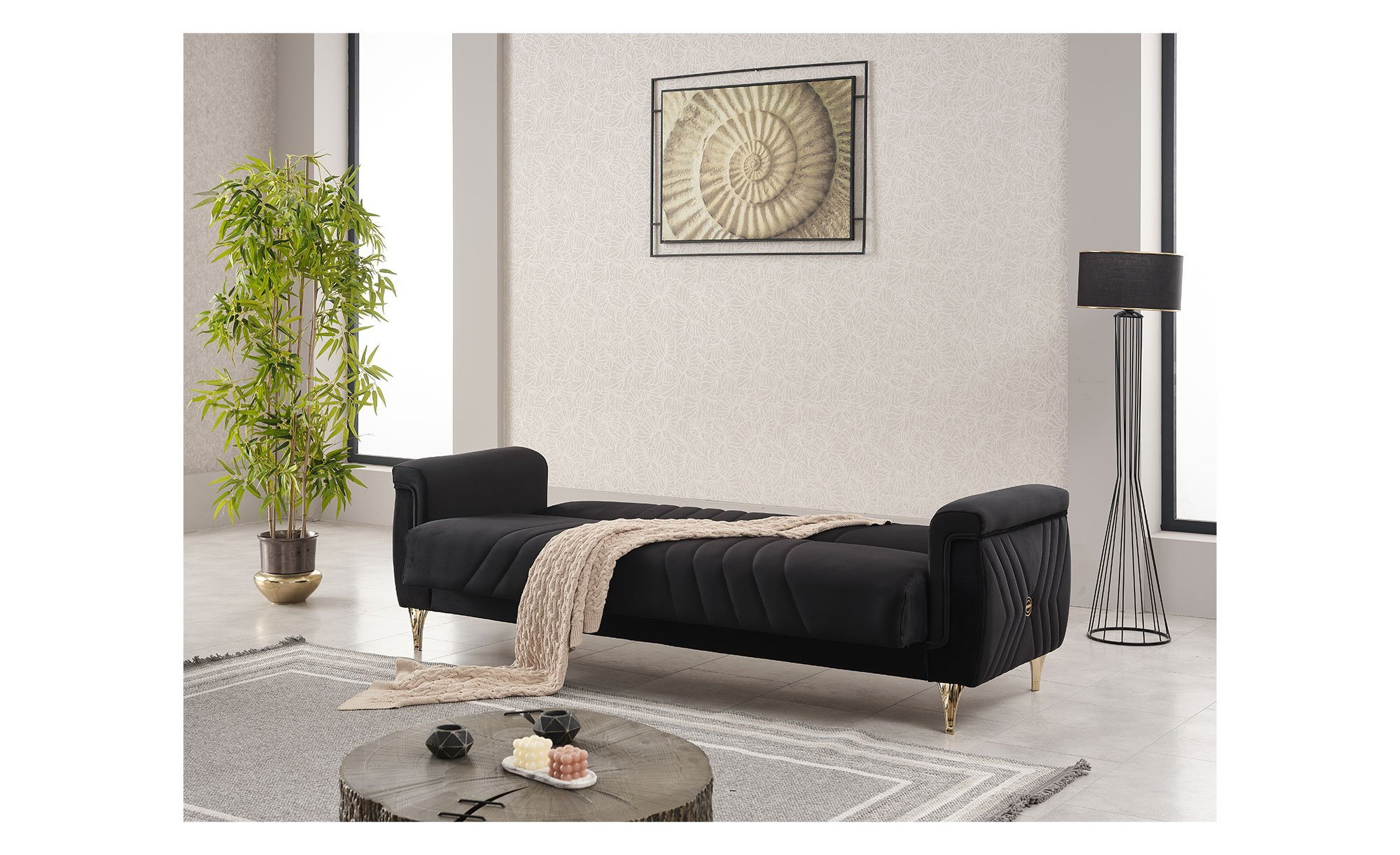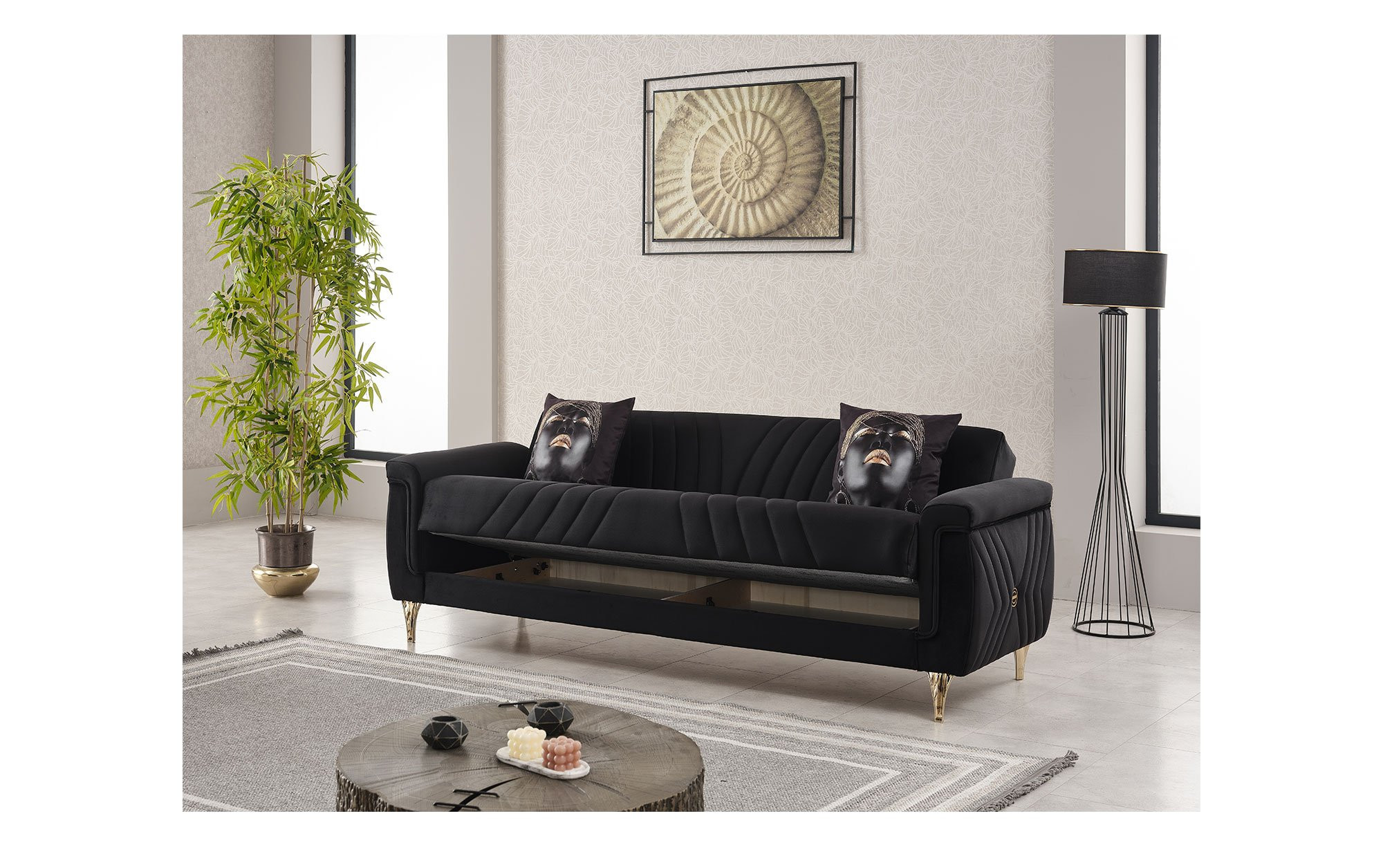 Ein anthrazitfarbiger Stoff-Bezug und silberne Metallfüße sorgen für eine moderne Basis des ca. 230 x 84 x 86 cm großen Möbelstücks. Hinzu kommen außerdem drei ansprechende Zierkissen, die schwarze und goldene Akzente setzen.