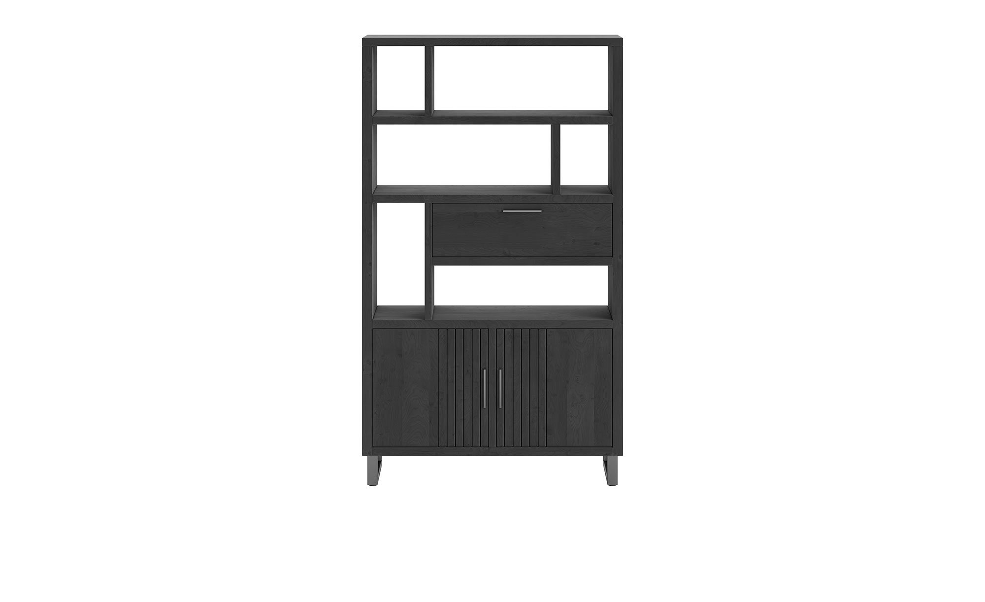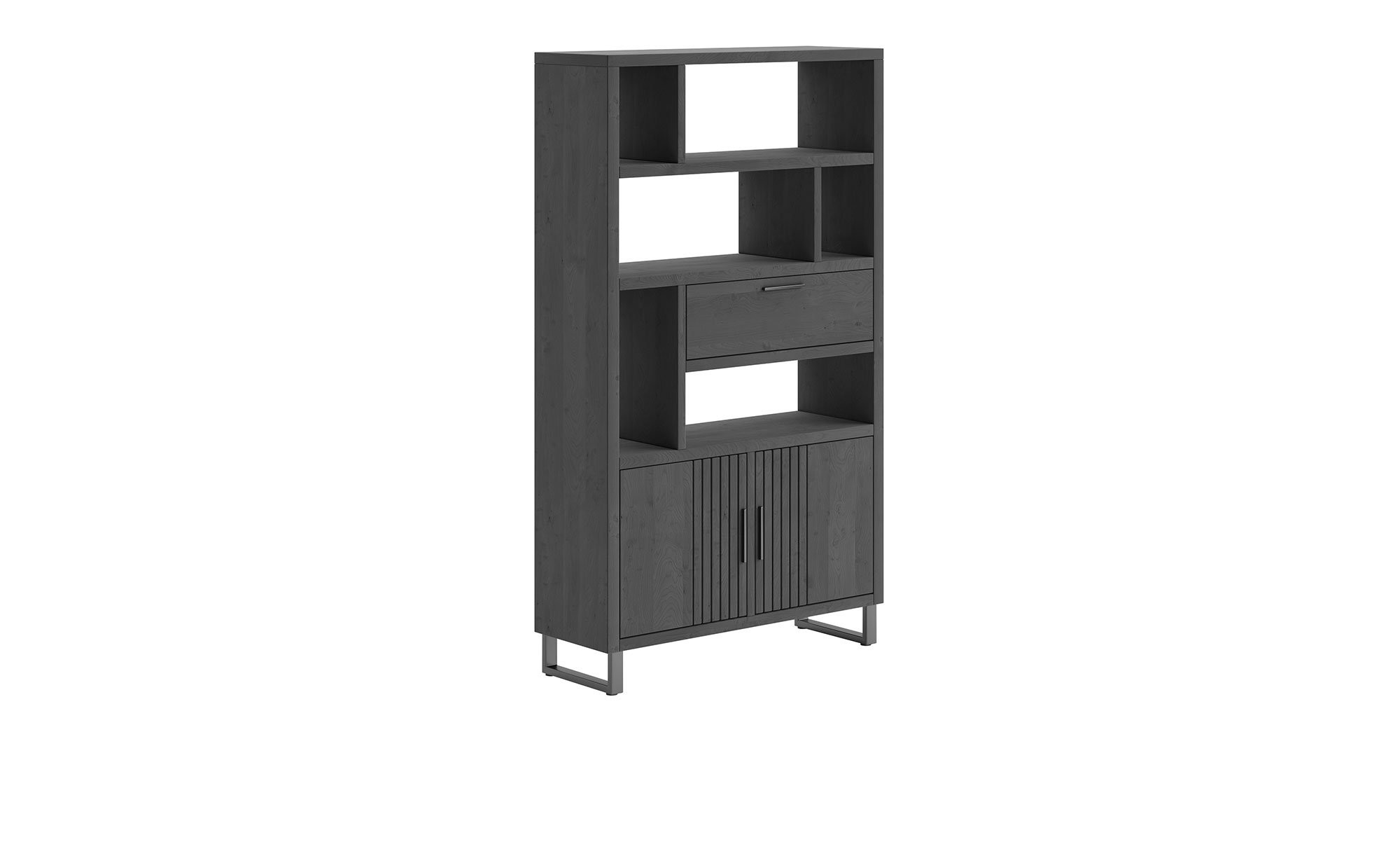 Mit Maßen von ca. 175 x 80 x 42 cm ist der Schrank Pavie ein vielseitiges Möbelstück, das sowohl praktisch als auch ästhetisch ist. Der Korpus und die Front des Schranks sind mit einem Eichenfurnier in der Farbe Schwarz - Castle Black lackiert, was ihm ein elegantes und zeitgemäßes Aussehen verleiht. Das Metall-Kufengestell ergänzt das Design perfekt und sorgt für Stabilität.