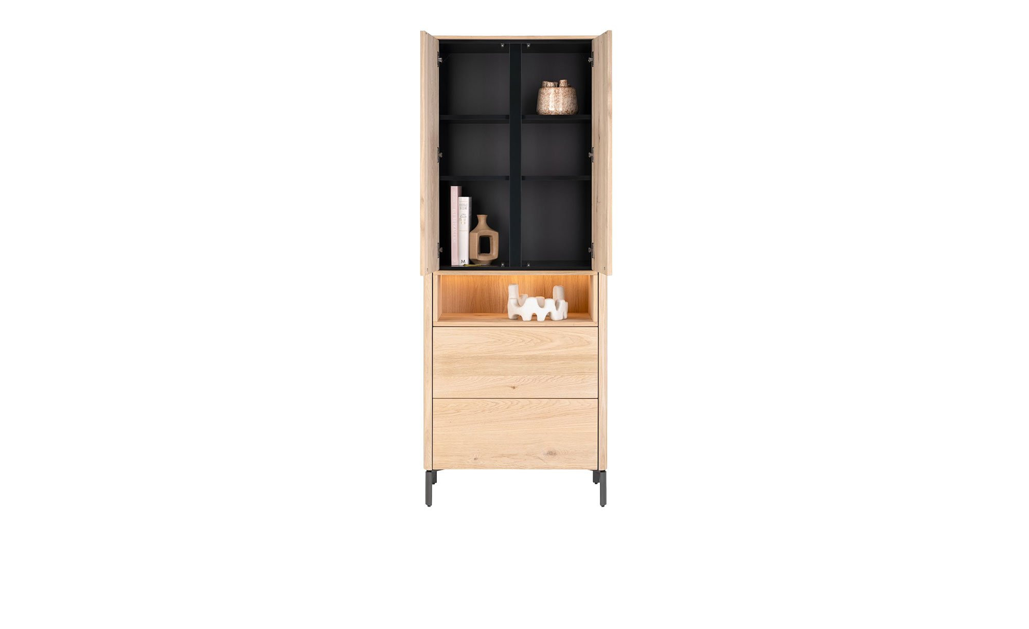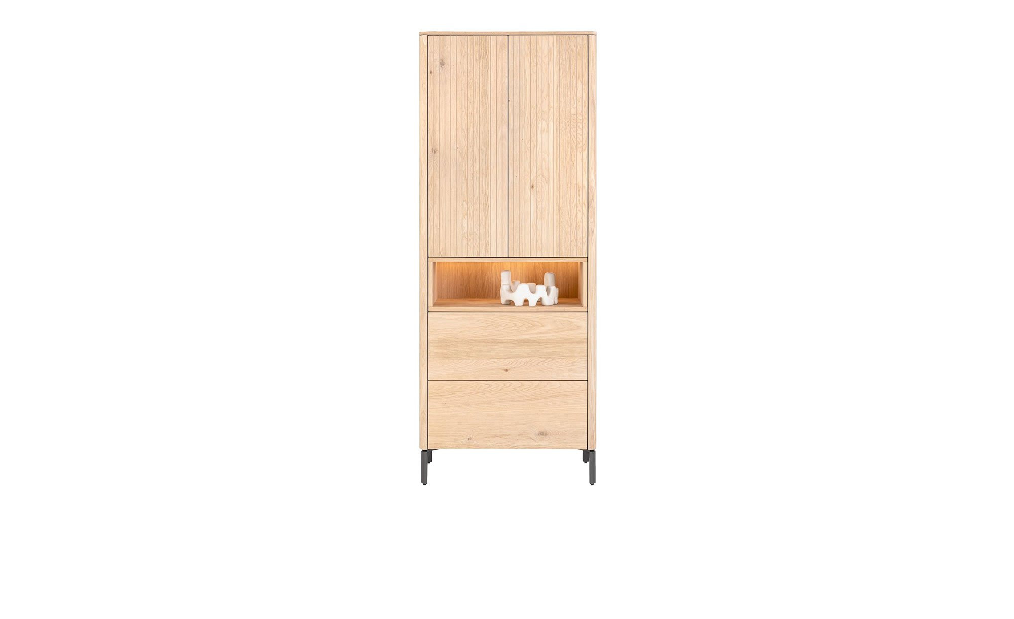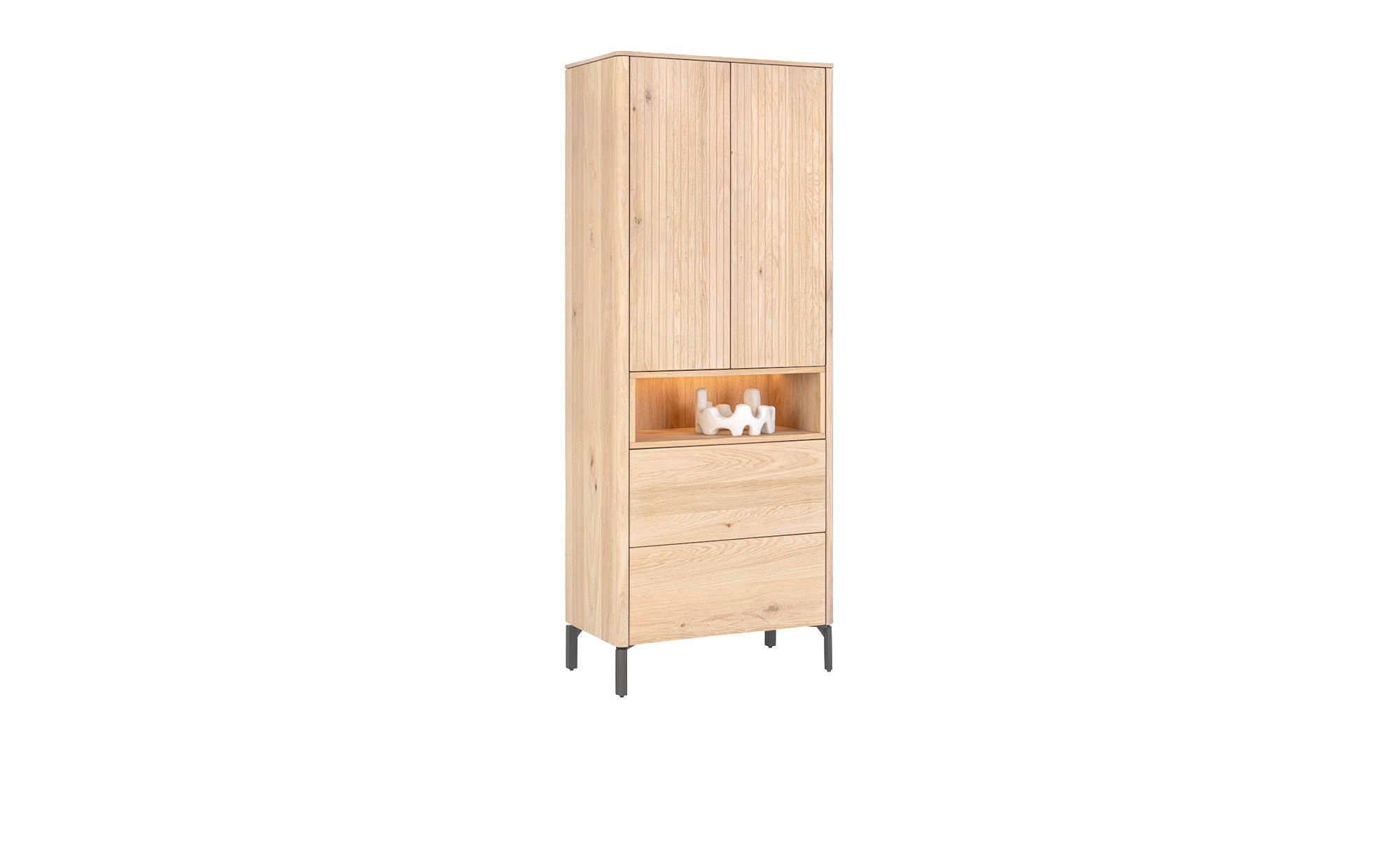 Hinter zwei Türen stehen Ihnen zwei Einlegeböden zur Verfügung. Zusätzlich gibt es ein offenes Fach, das durch eine LED-Beleuchtung besonders in Szene gesetzt wird. Zwei Schubladen ergänzen den Stauraum, der dank Push-to-Open-System komfortabel und nahezu geräuschlos genutzt werden kann.