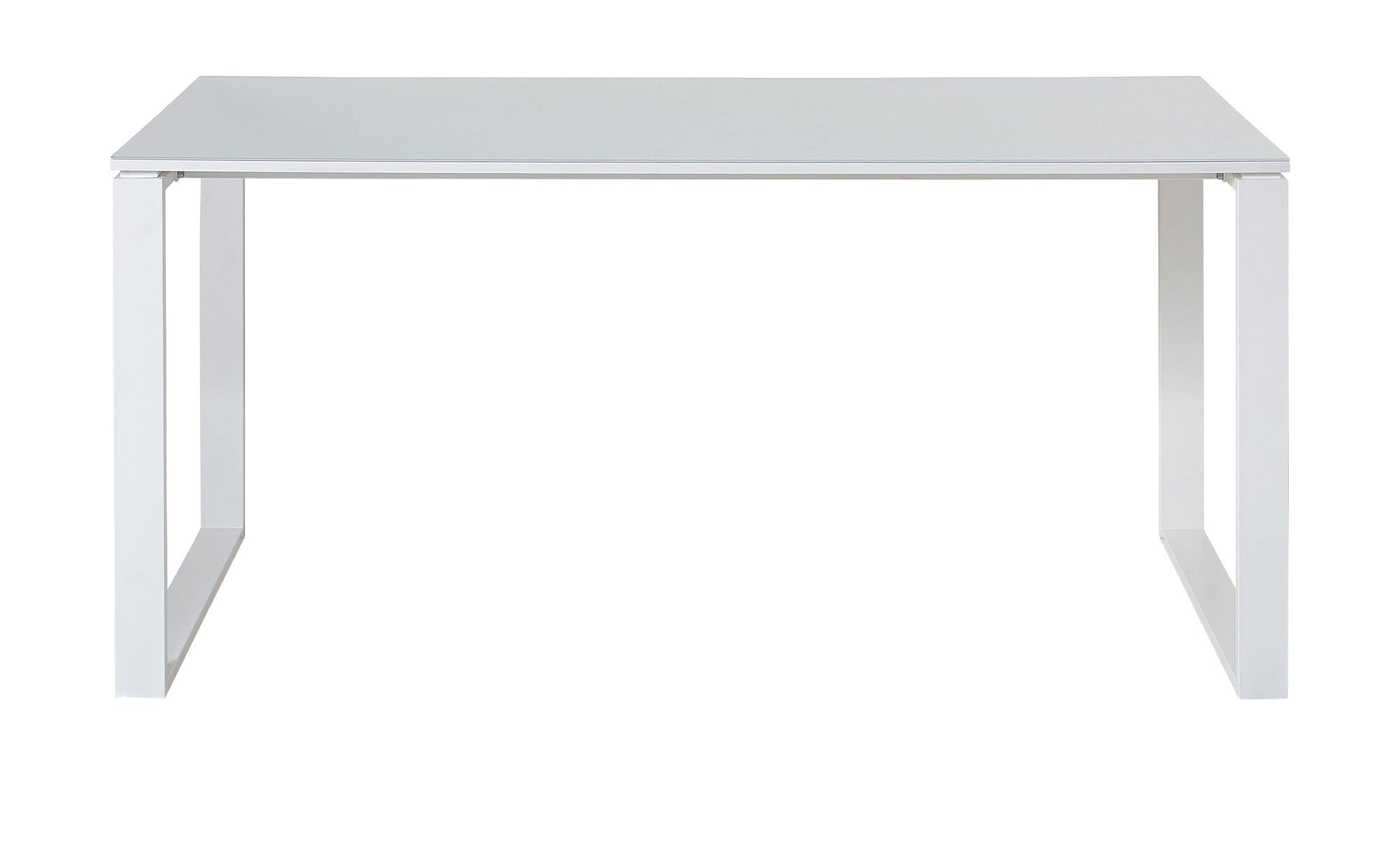 Ein weißes Metallgestell mit Pulverbeschichtung und Kufenfüßen trägt die rechteckige Tischplatte. Diese wurde aus Holzwerkstoff gefertigt und ist durch eine kratzfeste und widerstandsfähige Oberflächenbeschichtung aus Melaminharz vor Verschleiß geschützt. Darüber hinaus gibt es stoß- und schlagfeste ABS-Kanten.