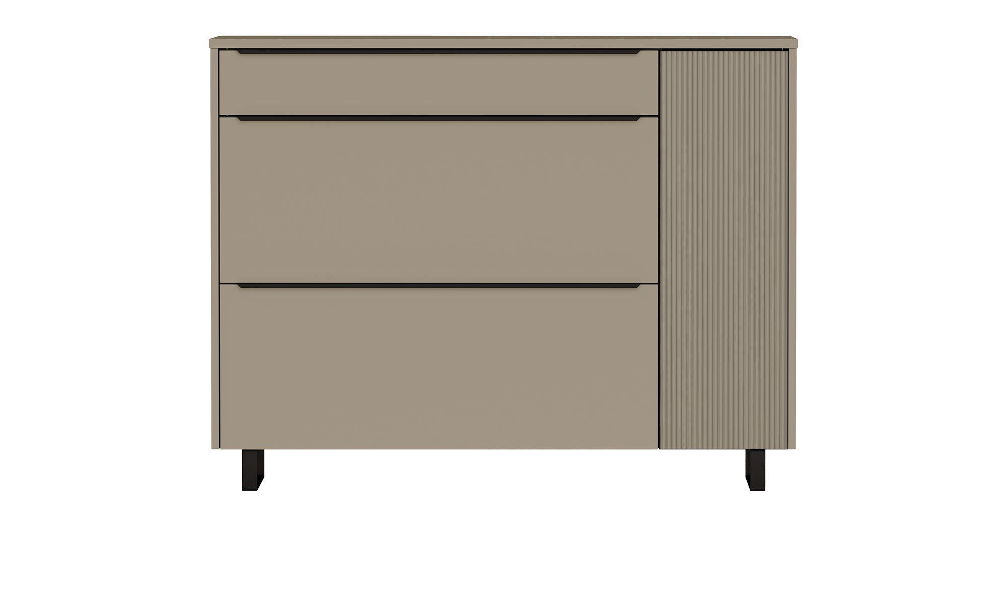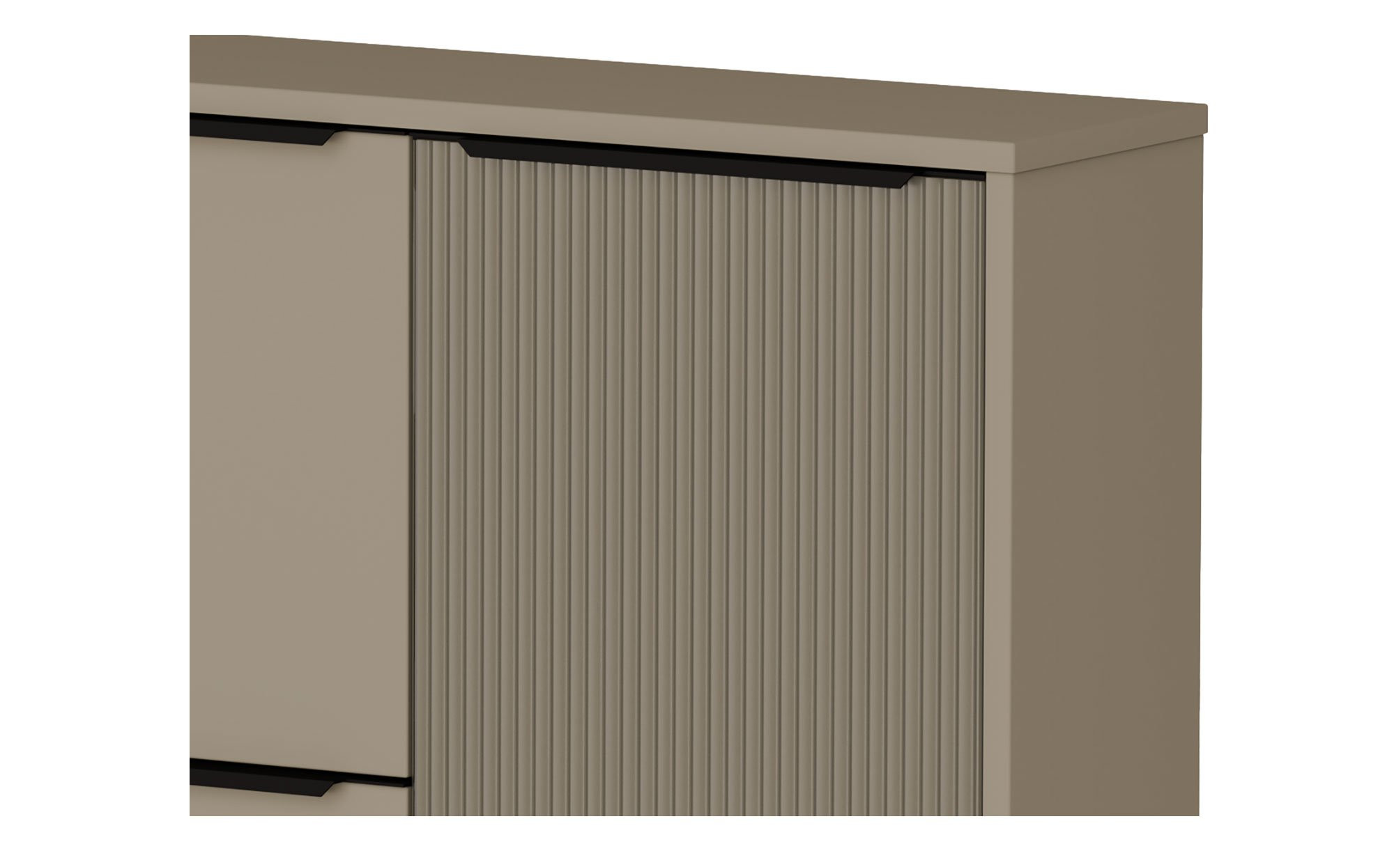 Gefertigt aus MDF sowie Holzwerkstoff und gestaltet in Taupe, überzeugt das ca. 137 x 105 x 34 cm große Möbelstück mit seiner modernen, eleganten Optik. Ein echtes Highlight ist die Tür mit ca. 4 mm starkem Rillenglas, ergänzt durch schwarze Aluminiumgriffe und stabile Kufenfüße aus Eisen.