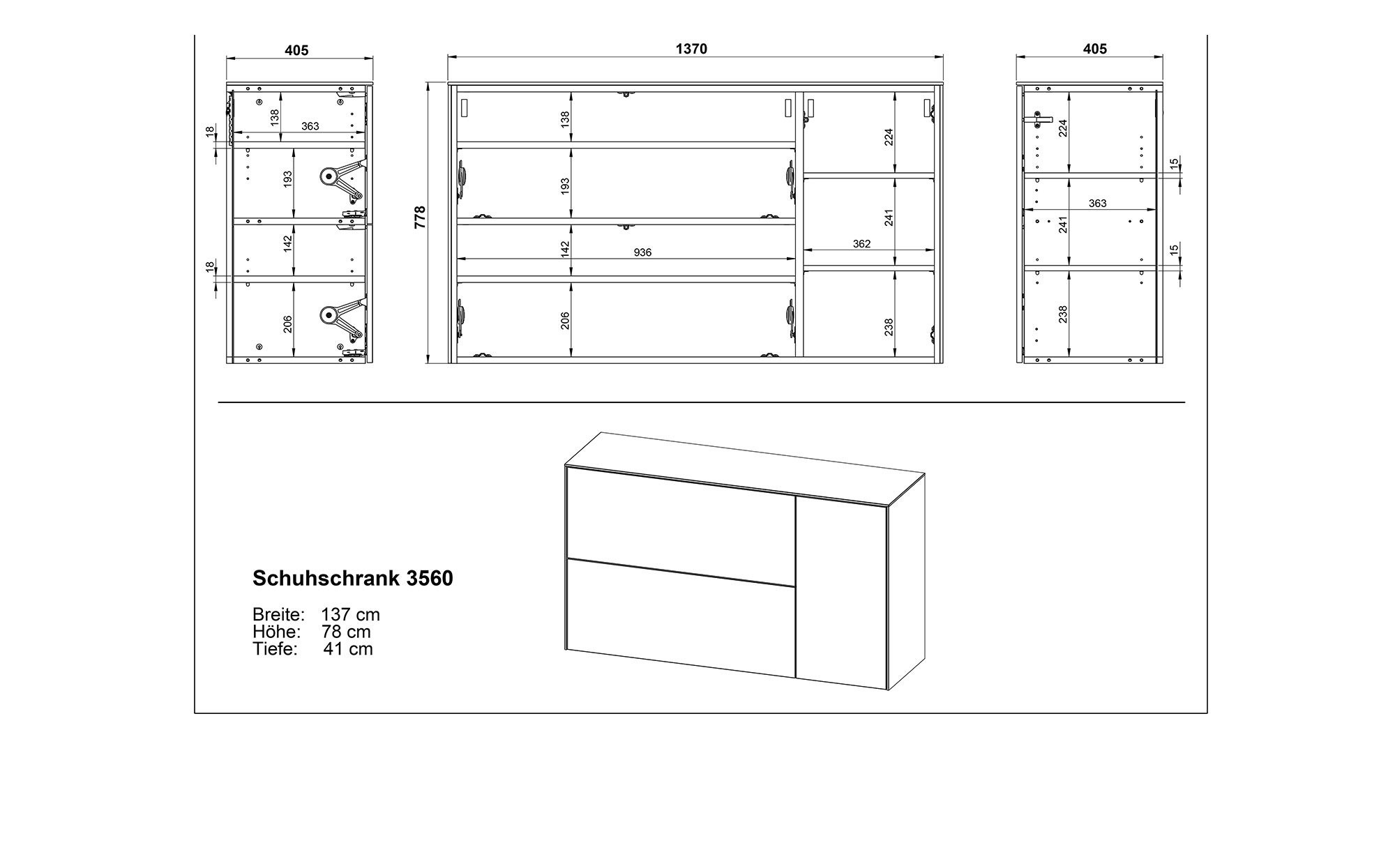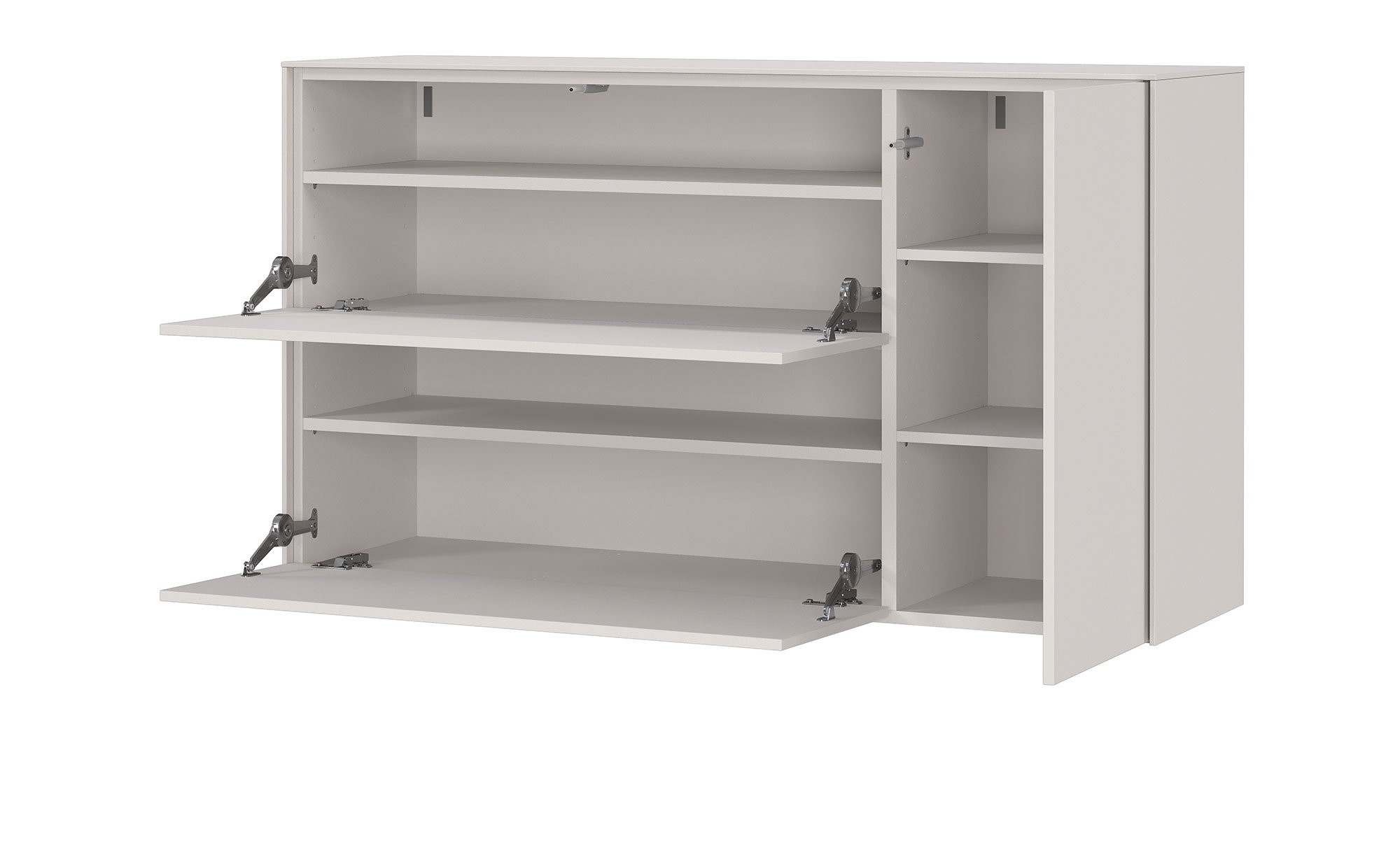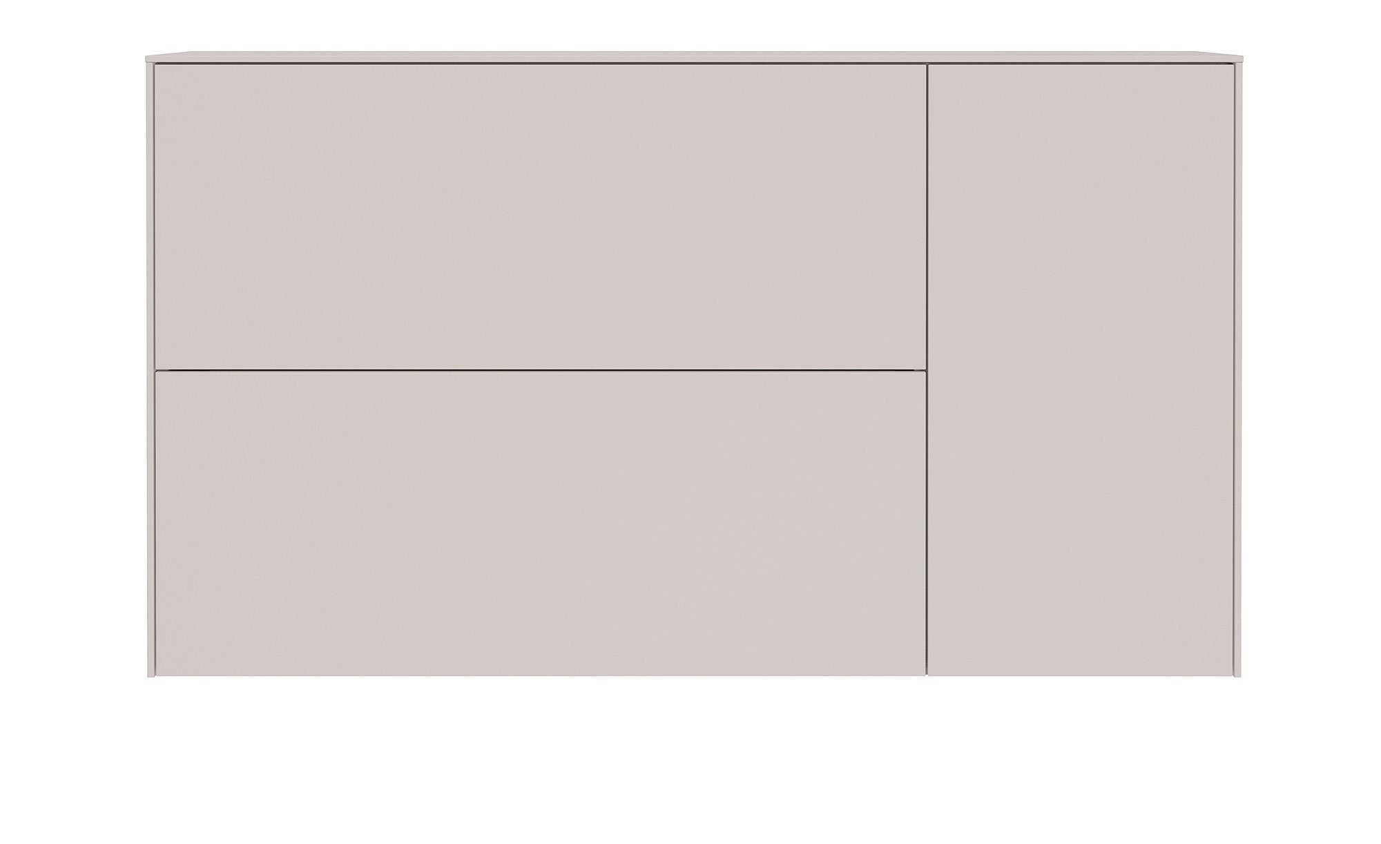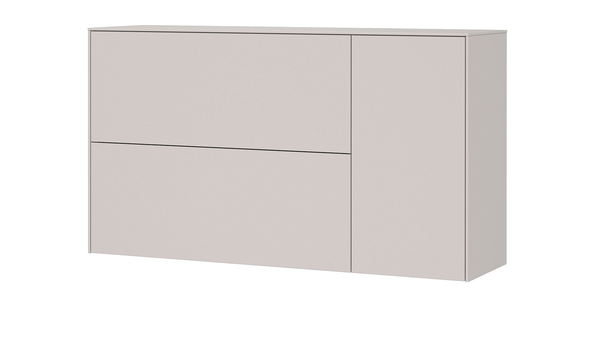 Das ca. 137 x 78 x 41 cm große Möbelstück aus Holzwerkstoff ist in einem edlen Kaschmir-Ton designt. Seine melaminharzbeschichteten Oberflächen sorgen für kratzfeste und widerstandsfähige Eigenschaften. Hinter einer Tür empfangen Sie zwei verstellbare Böden, außerdem wurden zwei Klappen integriert. Dank einer Push-to-open Technik ist für sanftes Öffnen und Schließen bei leichtem Druck gesorgt.