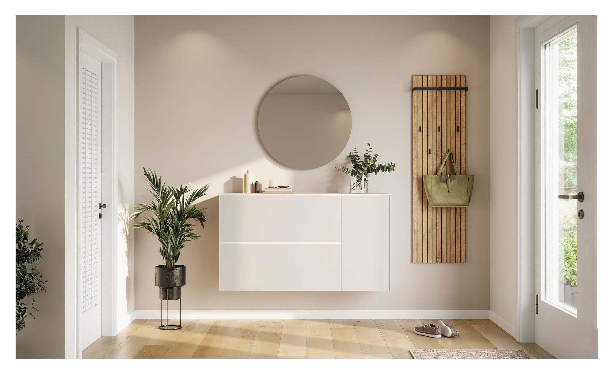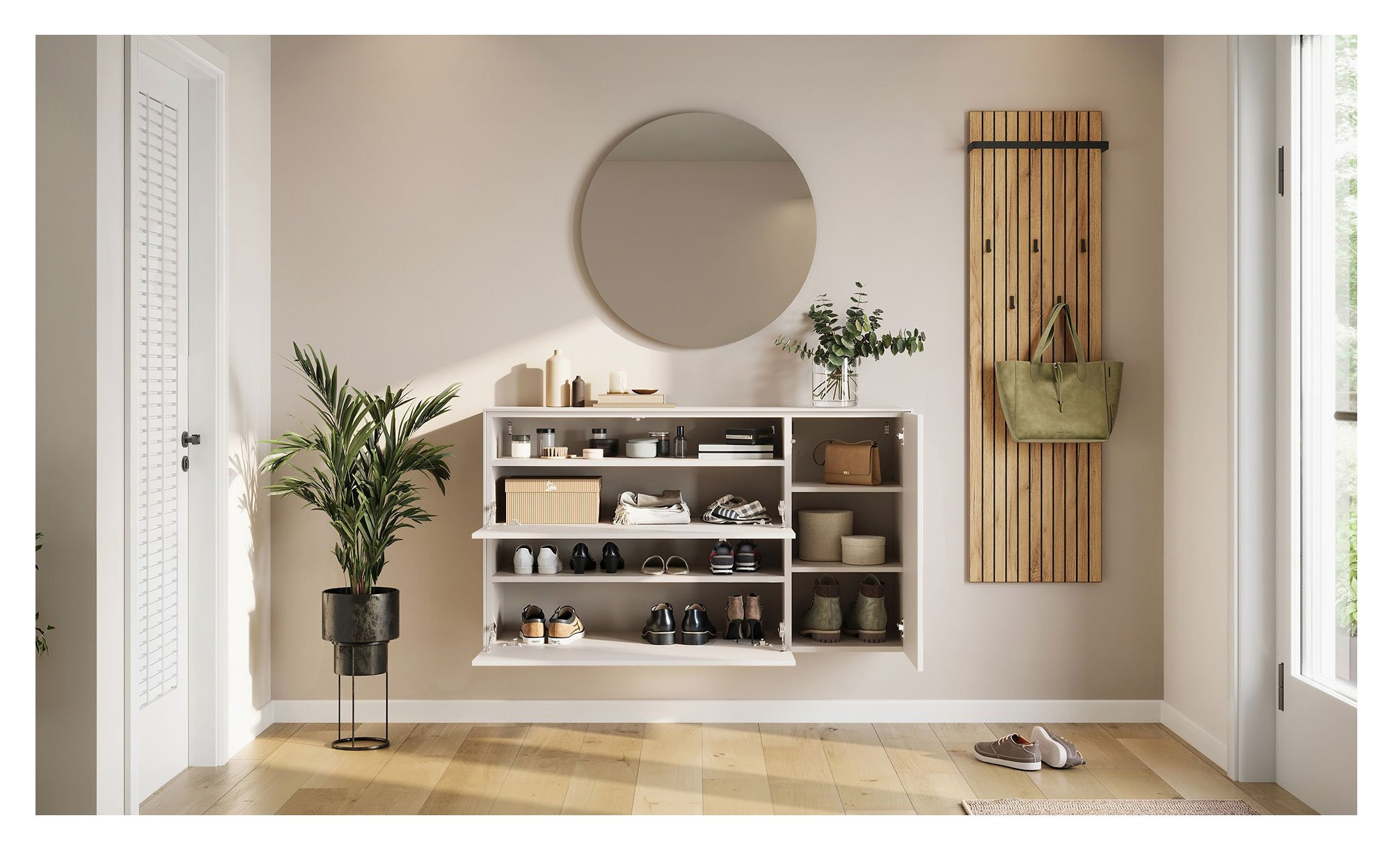 Auf zugleich stilvolle und platzsparende Weise versorgt Sie der für eine Wandmontage vorgesehene Schuhschrank hängend Luna in Ihrem Eingangsbereich mit Stauraum.