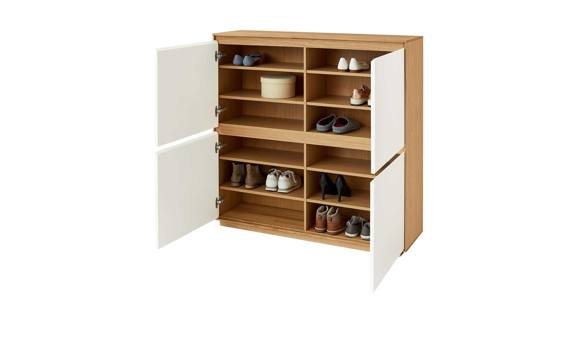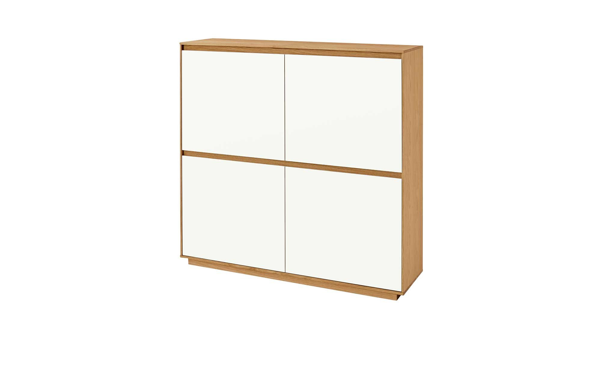 Zum ca. 127 x 124 x 34 cm großen Artikel gehören vier Türen mit angenehmem Soft-Close-System. Im Innern sorgen acht verstellbare Einlegeböden für Stauraum.