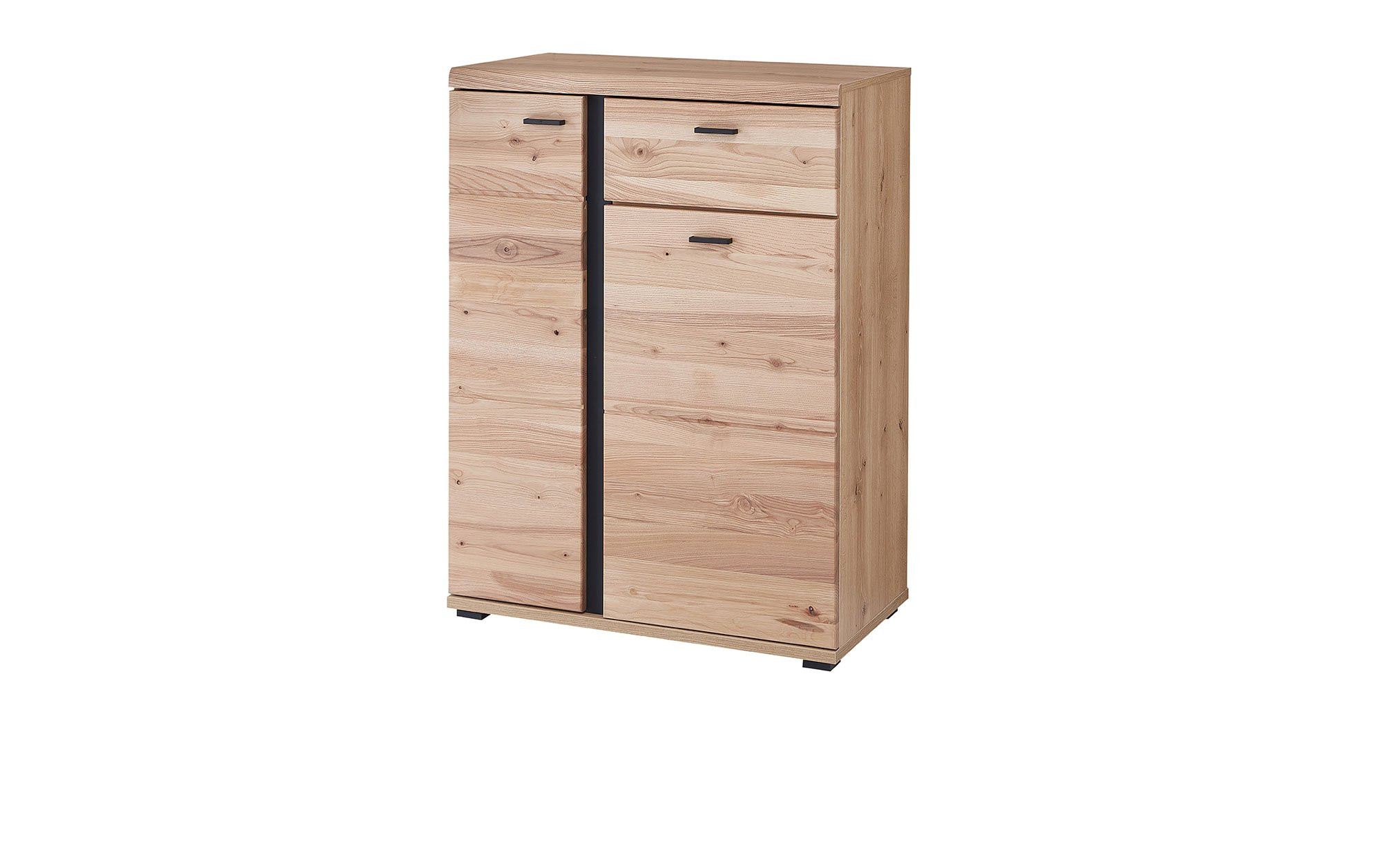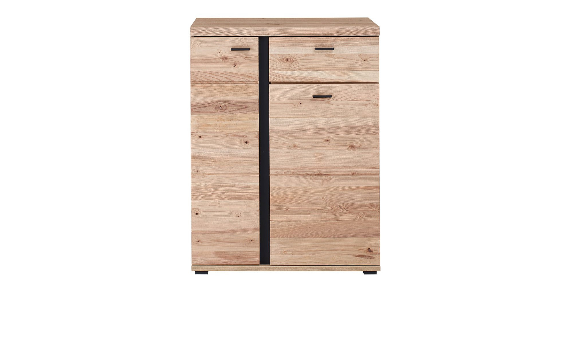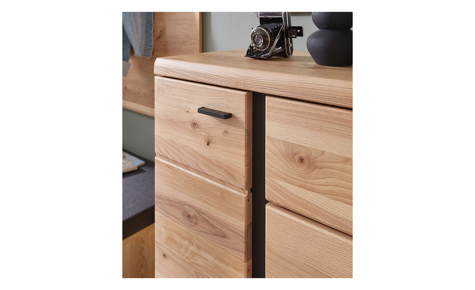 An seinem aus Holzwerkstoff bestehenden Korpus präsentiert das Möbelstück ein naturnahes Old Artisan Oak-Dekor. Die Front des ca. 80 x 107 x 40 cm großen Schranks besteht hingegen aus massiver Altesche in Form einer durchgehenden Lamelle mit gebürsteter Oberfläche. Während das Innendekor ebenfalls in Eiche-Optik gehalten ist, bilden die Absetzung, die Metallgriffe und die Füße aus Kunststoff mit ihrer schwarzen Farbe einen gelungenen Kontrast.