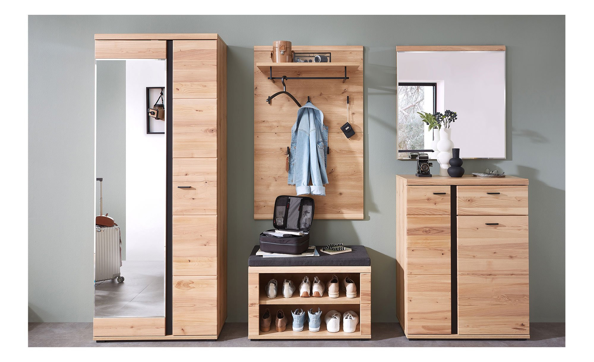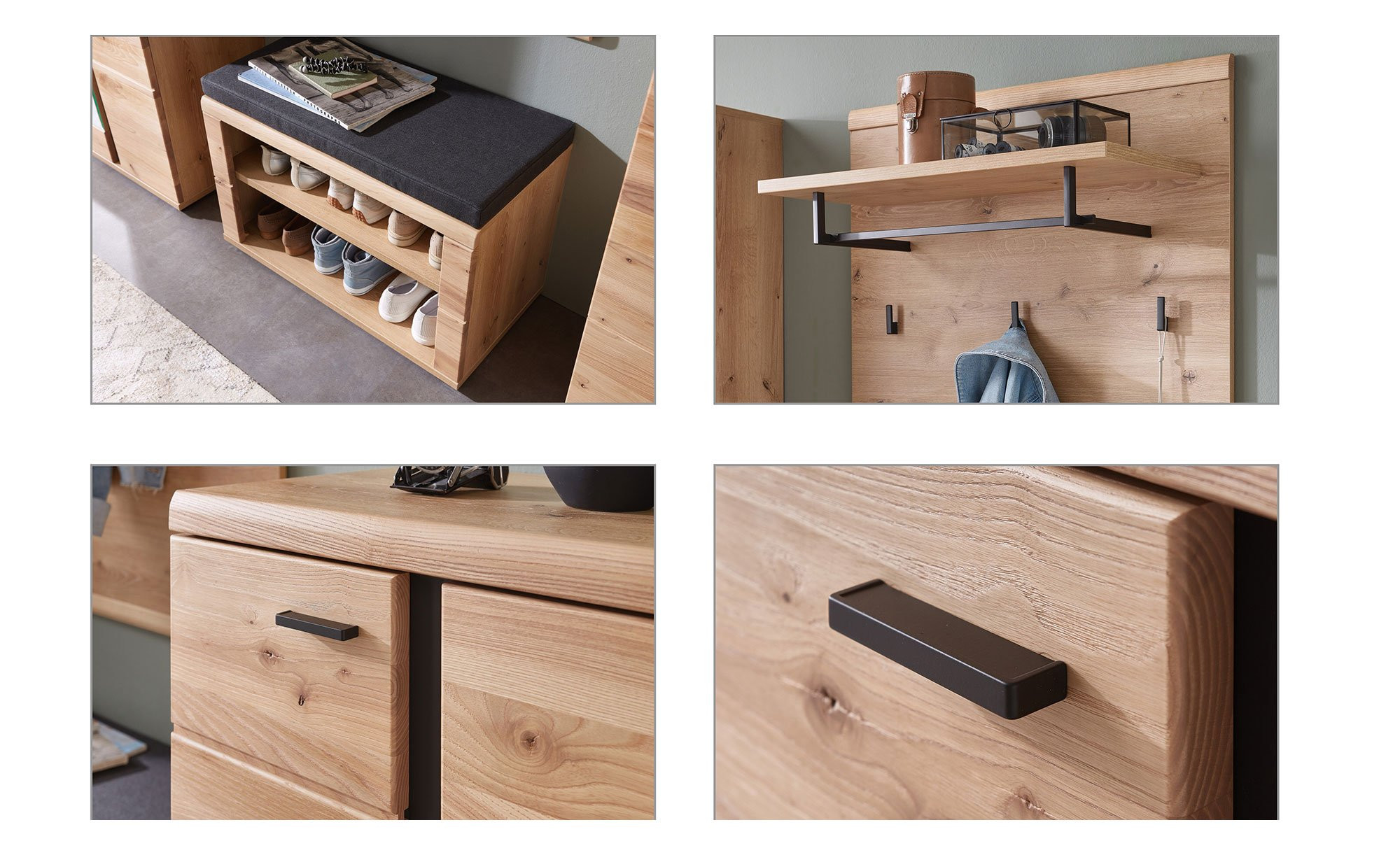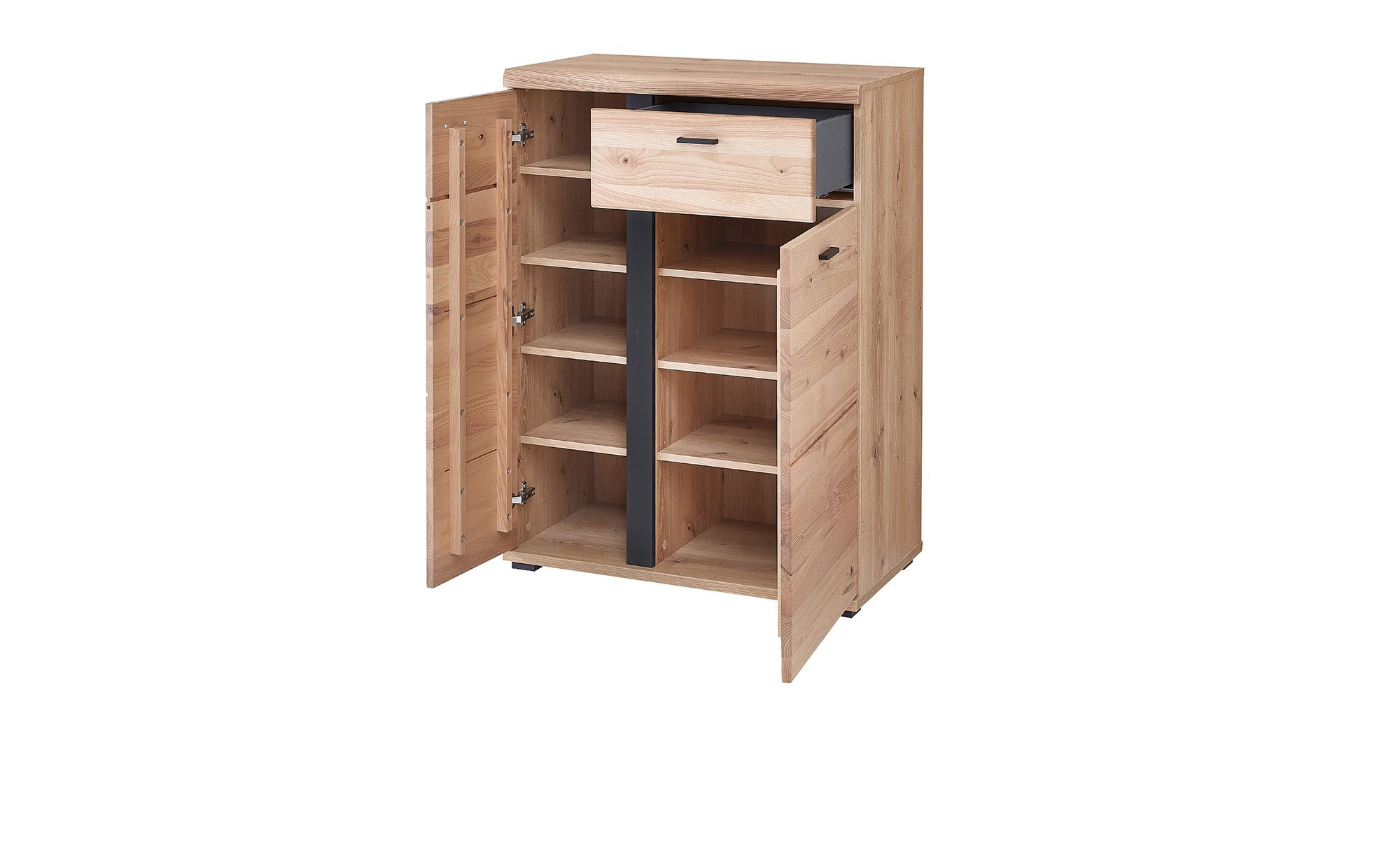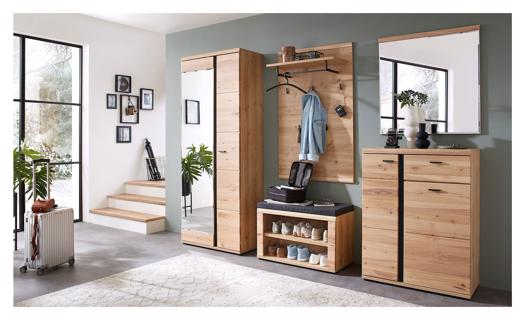 An seinem aus Holzwerkstoff bestehenden Korpus präsentiert das Möbelstück ein naturnahes Old Artisan Oak-Dekor. Die Front des ca. 80 x 107 x 40 cm großen Schranks besteht hingegen aus massiver Altesche in Form einer durchgehenden Lamelle mit gebürsteter Oberfläche. Während das Innendekor ebenfalls in Eiche-Optik gehalten ist, bilden die Absetzung, die Metallgriffe und die Füße aus Kunststoff mit ihrer schwarzen Farbe einen gelungenen Kontrast.