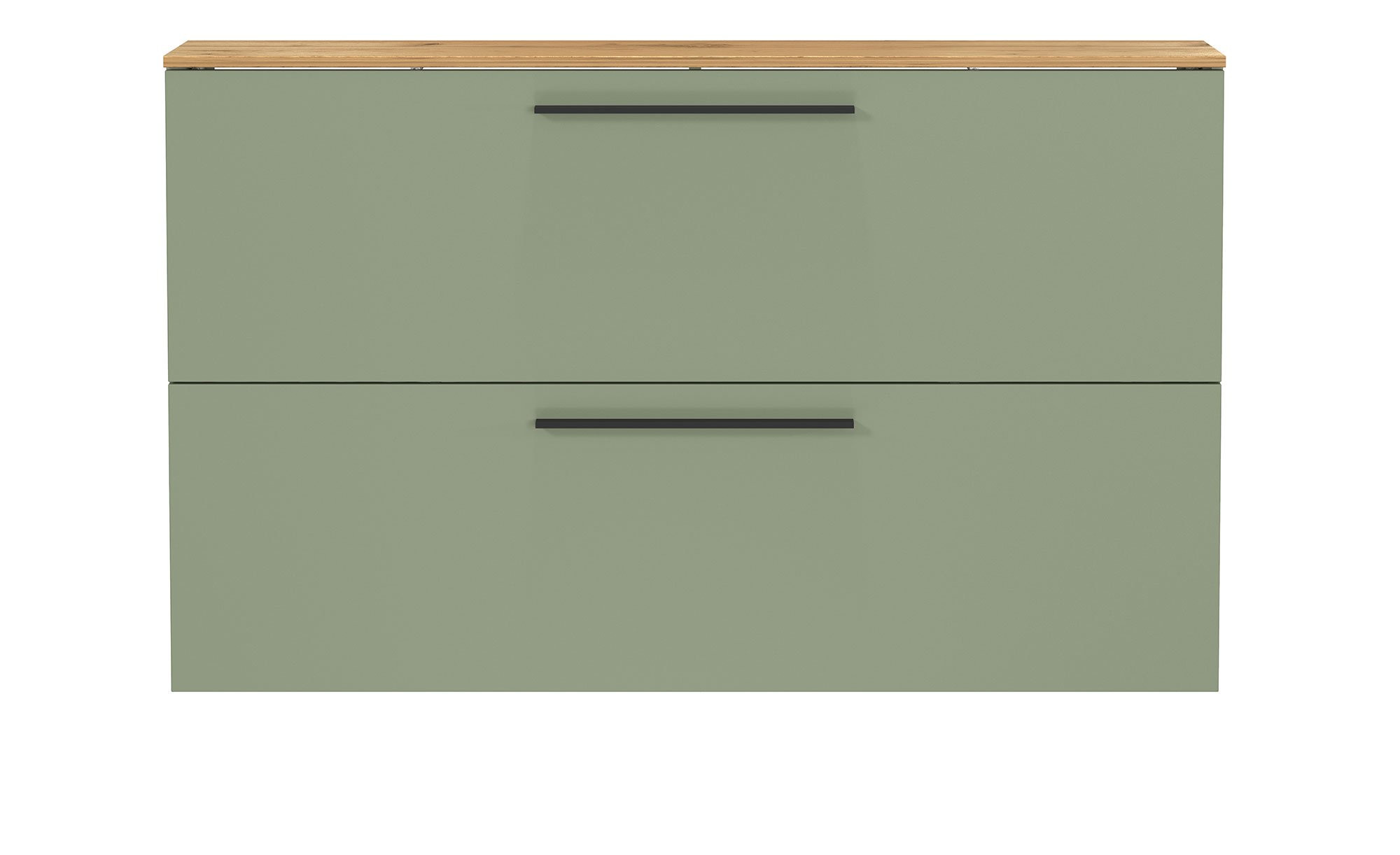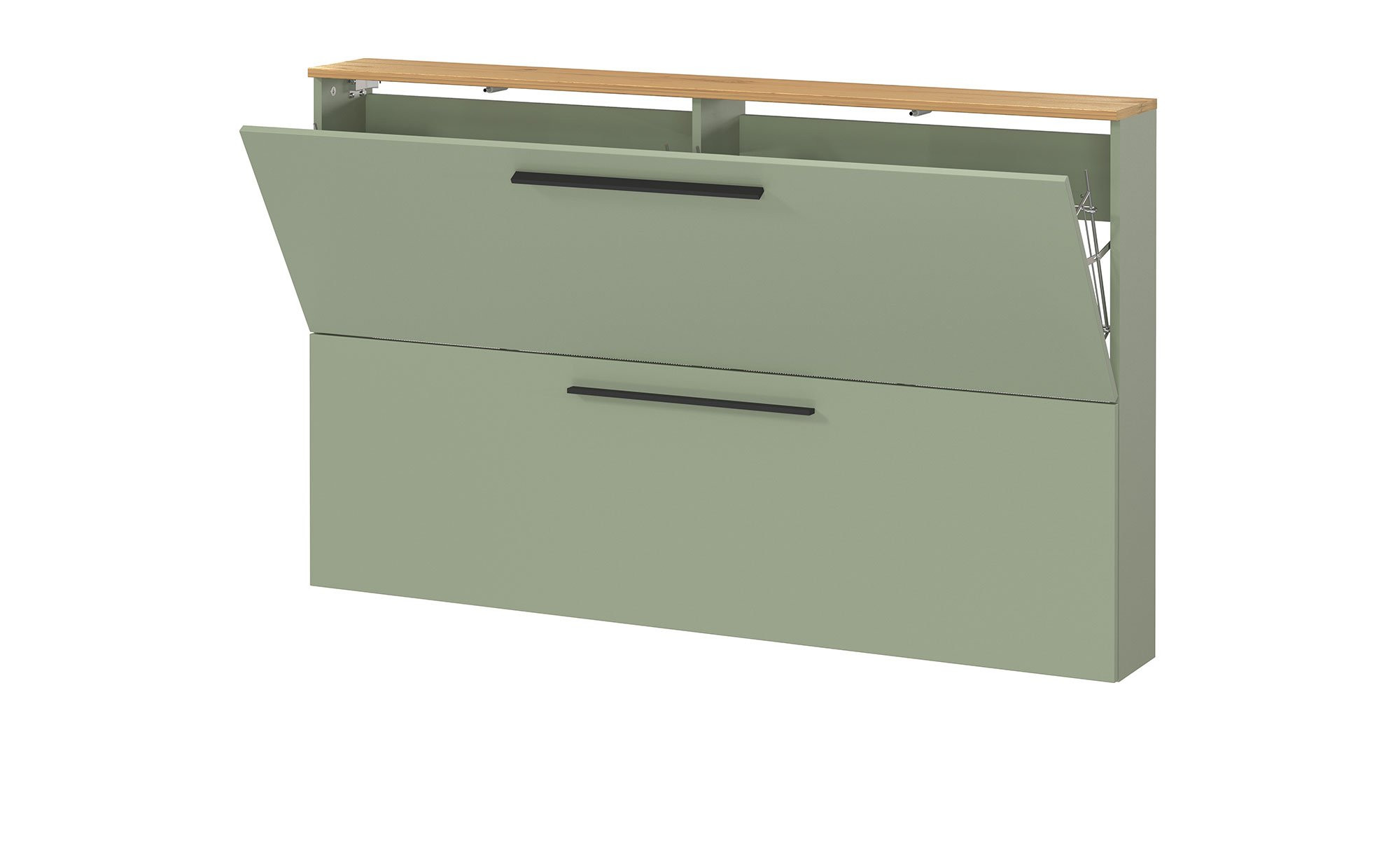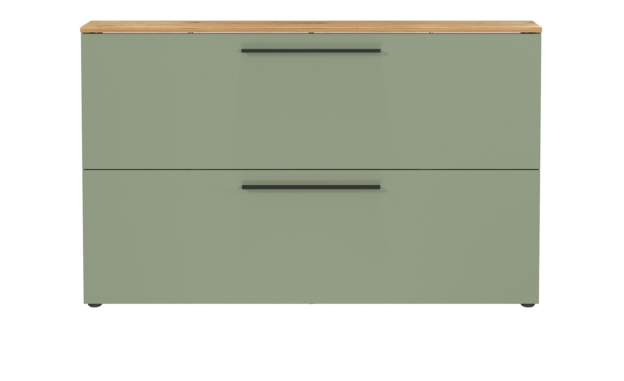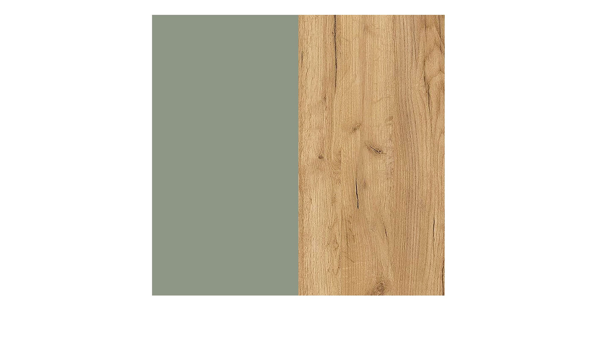 Front und Korpus des ca. 140 x 85 x 19 cm großen Möbelstücks bestehen aus Holzwerkstoff in einem natürlichen Taupegrün. Auch das Innendekor ist in diesem Ton gehalten, zudem fügt sich die Absetzung mit ihrem Navarra Eiche-Dekor ideal ins Bild. Eine kratzfeste und widerstandsfähige Oberflächenbeschichtung aus Melaminharz beugt schnellem Verschleiß vor.