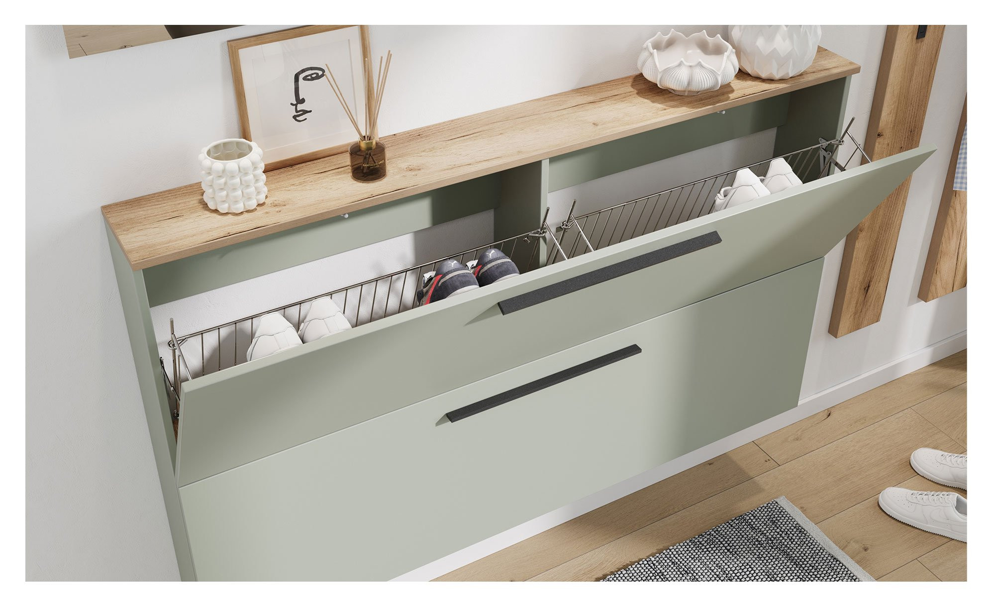 Neben den schwarzen Kunststofffüßen wurden ebenfalls schwarze Griffe aus pulverbeschichtetem Metall integriert. Mit ihrer Hilfe öffnen Sie die beiden Klappen. Dahinter erwarten Sie vier Metallschuhkörbe zur ordentlichen Unterbringung.