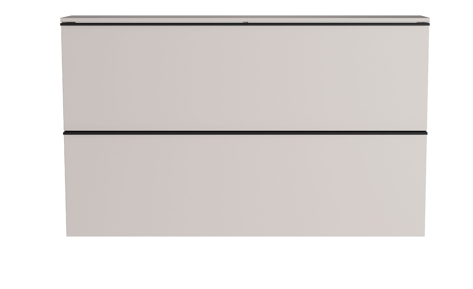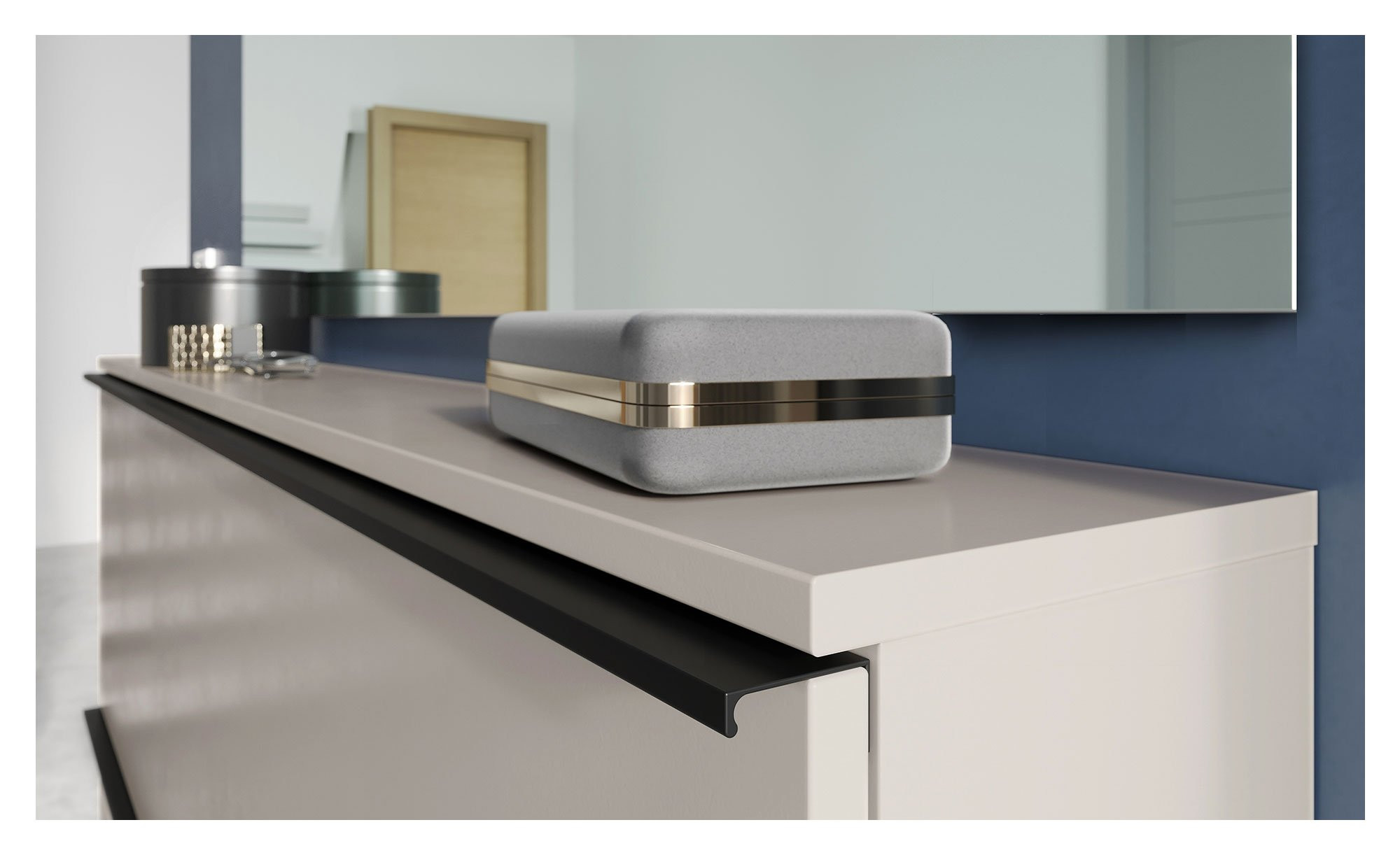 Front und Korpus des ca. 140 x 85 x 19 cm großen Möbelstücks bestehen aus Holzwerkstoff im Farbton Kaschmir und sind durch eine Melaminharzbeschichtung vor Kratzern, Schmutz und allgemeinem Verschleiß geschützt. Zudem wurden hochwertige ABS-Kanten integriert. Durch eine zusätzliche Verspiegelung an der Vorderseite und schwarze Metallgriffe wird der edle Charme unterstrichen.