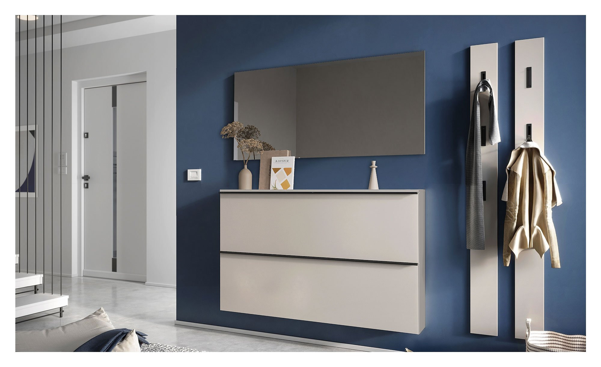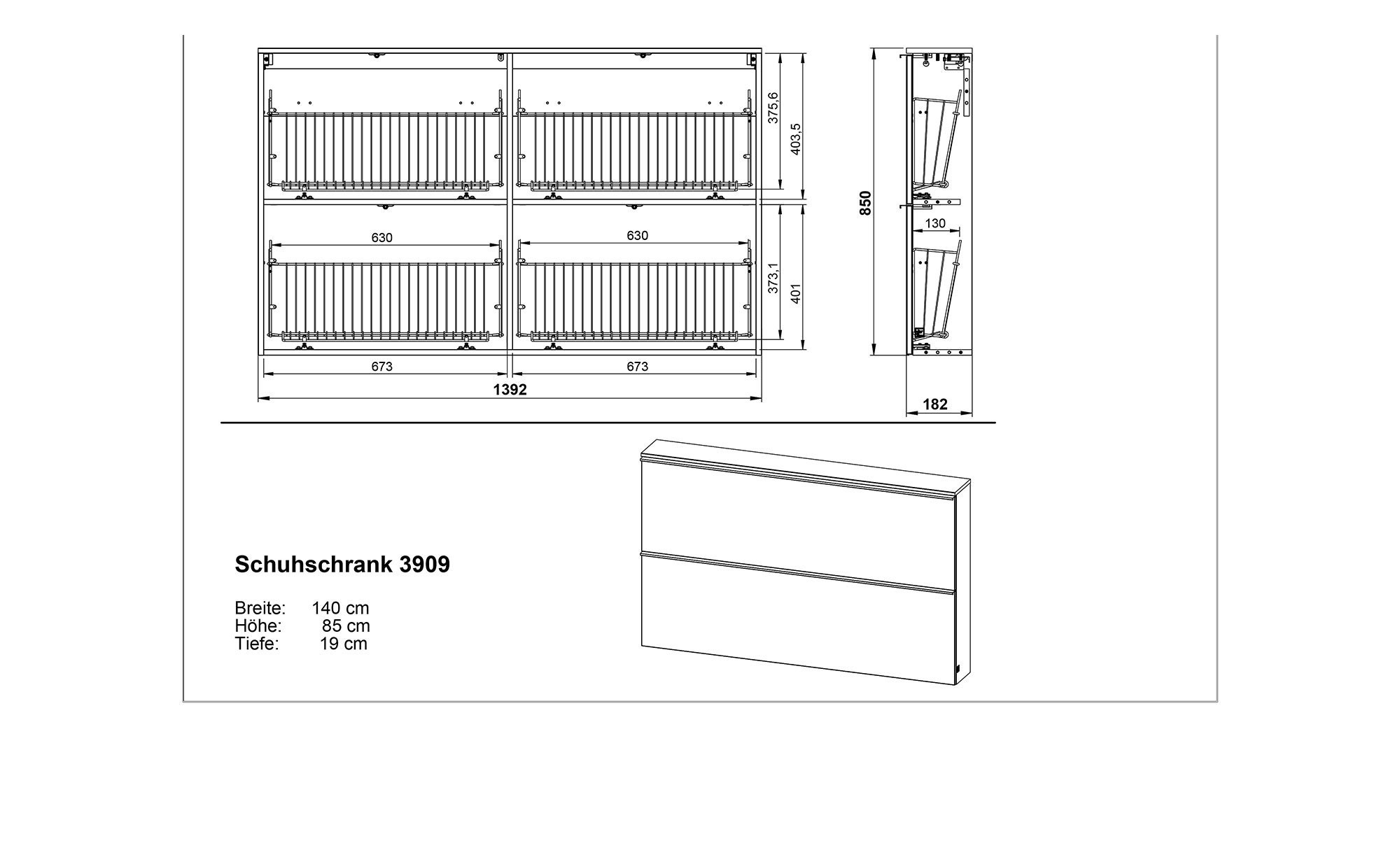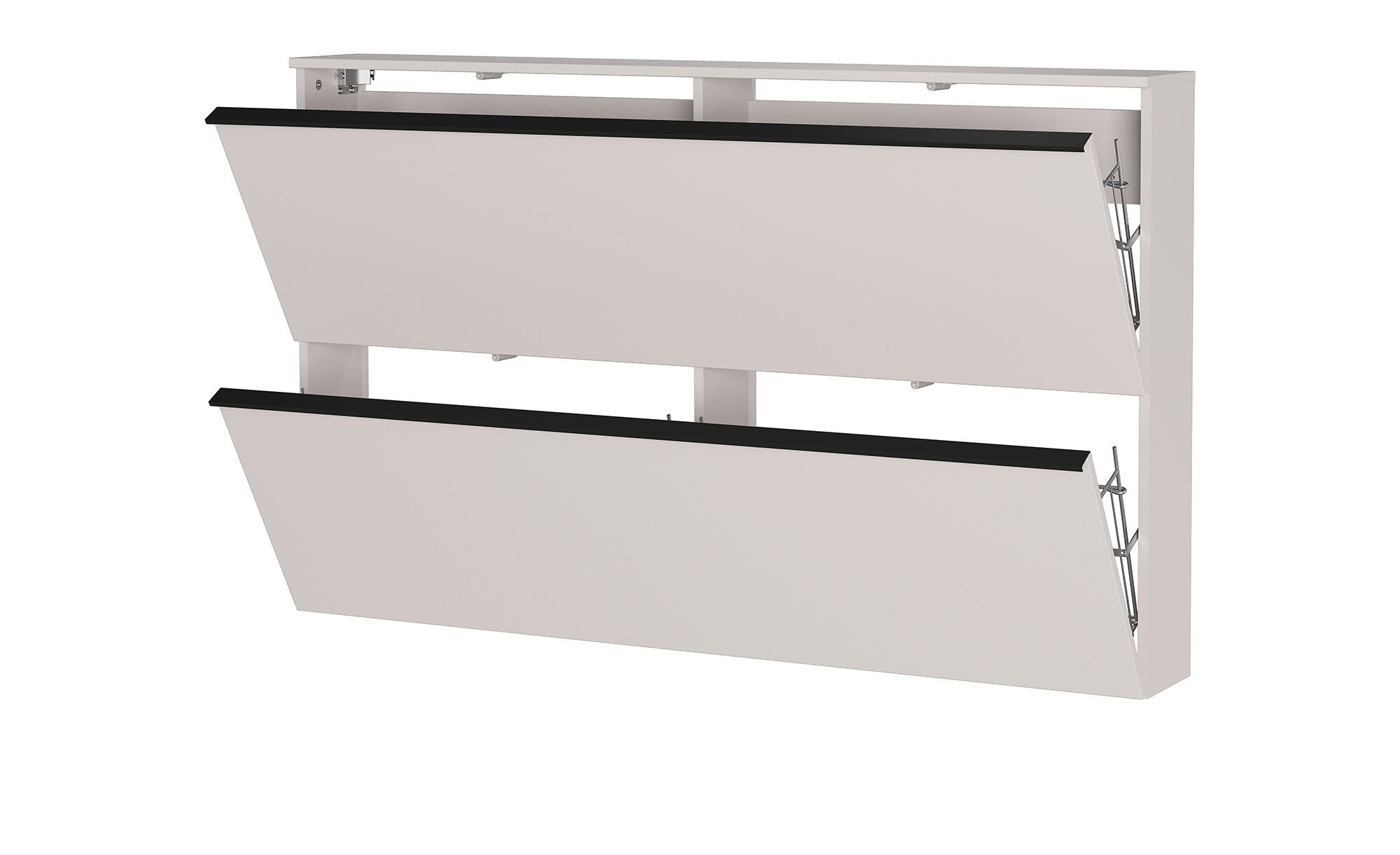 Der Schuhschrank ist für eine hängende Montage vorgesehen und mit zwei gedämpften Klappen ausgestattet. Dahinter befinden sich vier jeweils mit max. 10 kg belastbare Schuhkörbe. Bis zu 12 Paar Schuhe lassen sich so ordentlich und platzsparend unterbringen.