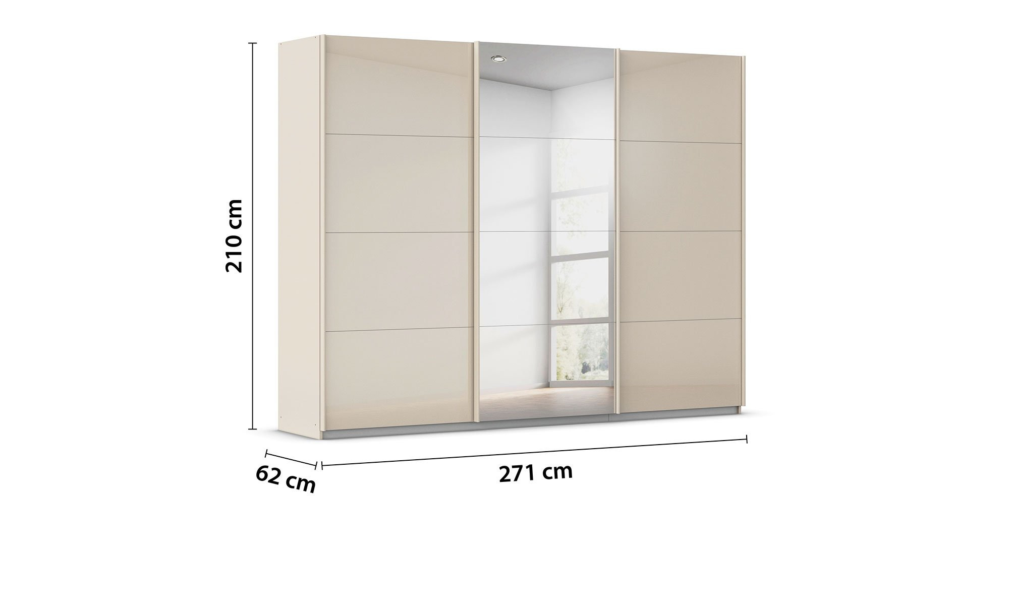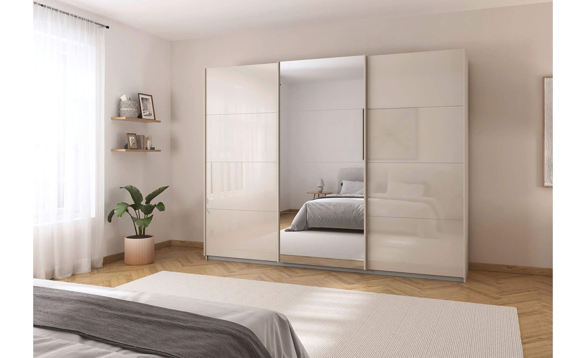 Von den insgesamt drei Schwebetüren ist eine komplett verspiegelt, die anderen beiden sind mit Glasoberflächen versehen. Dahinter erwarten Sie jeweils drei Böden und drei Kleiderstangen, sodass Sie Ihre Garderobe und andere Accessoires geordnet unterbringen können.