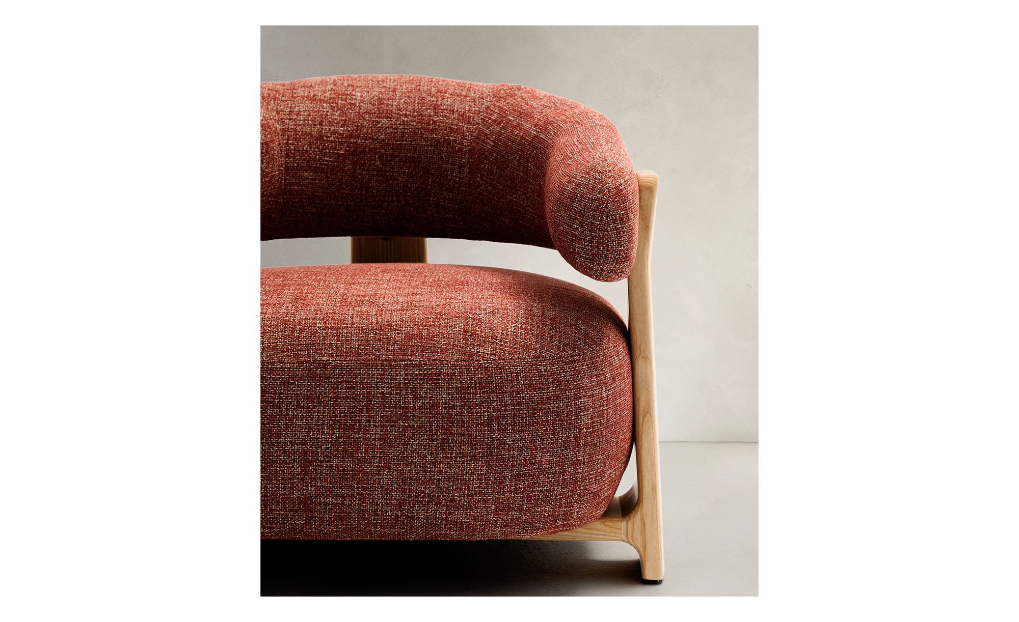 Ein aus 100 % Polyester bestehender Chenille-Stoff im Farbton Terrakotta umspannt das ca. 87,5 x 67 x 83,5 cm große Möbelstück. Zudem erwartet Sie ein Gestell aus natürlichem, massivem Eschenholz mit ca. 6 cm hohen Füßen.