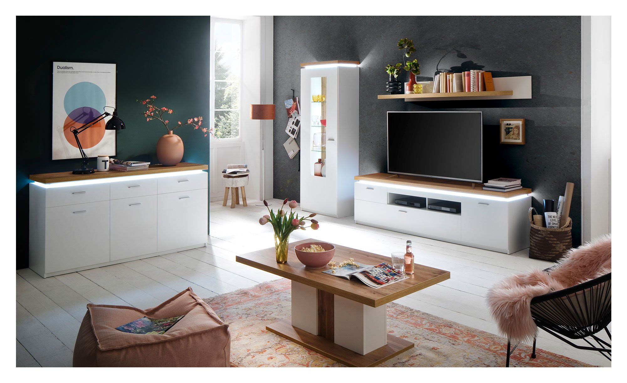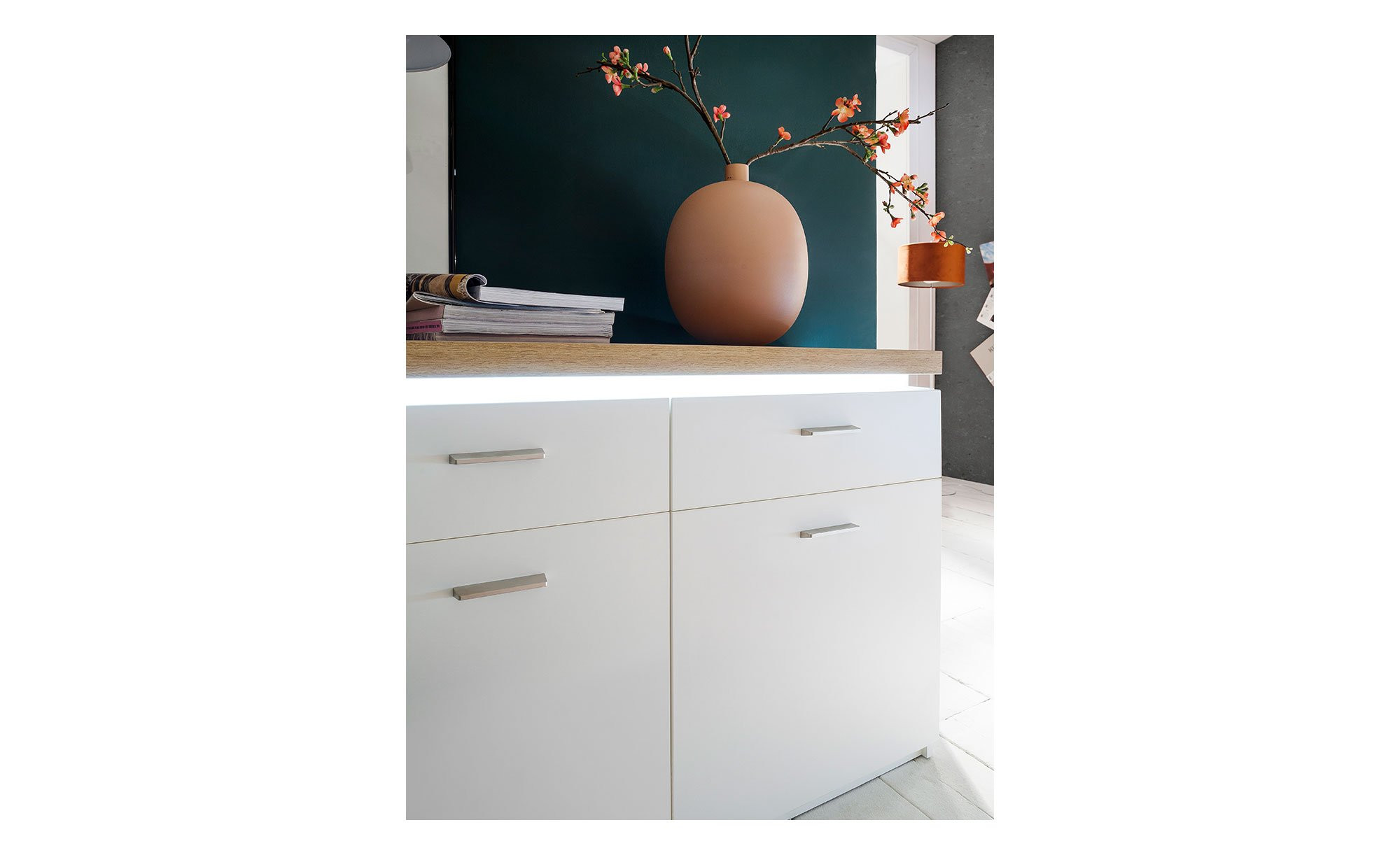 Das Sideboard Celine verbindet zeitloses Design mit praktischer Funktionalität und sorgt für ein hochwertiges Ambiente in Ihrem Wohn- oder Essbereich. Korpus, Fronten und Innenleben präsentieren sich in klassischem Weiß, während die Deckplatte im Wotan Eiche Dekor einen warmen, natürlichen Kontrast setzt. Dank integrierter LED-Beleuchtung wird die Absetzung zusätzlich hervorgehoben und macht das ca. 156 x 83 x 44 cm große Möbelstück zu einem echten Blickfang. Die melaminharzbeschichteten Oberflächen sind besonders kratzfest und pflegeleicht, wodurch das Sideboard ideal für den Alltag geeignet ist.