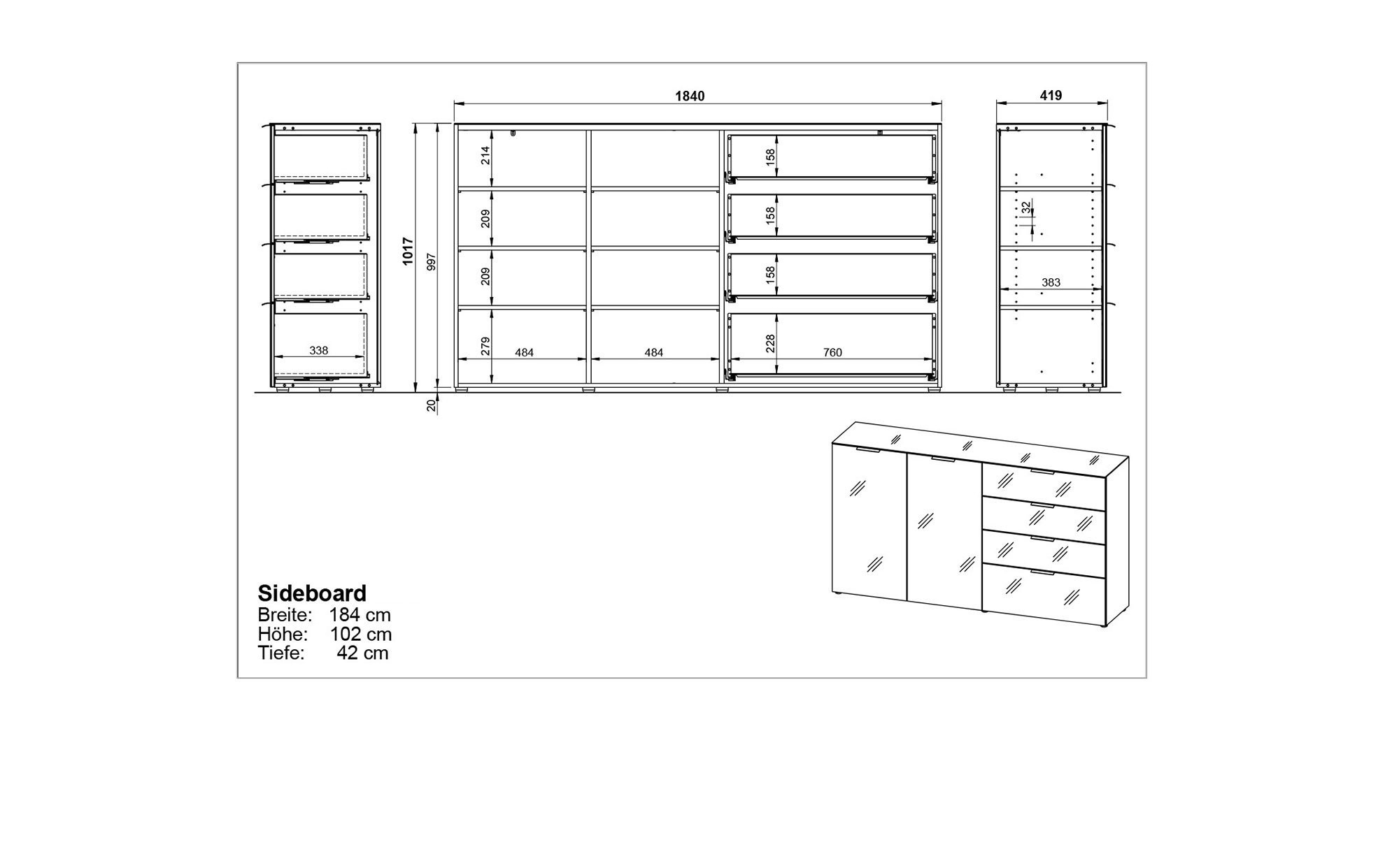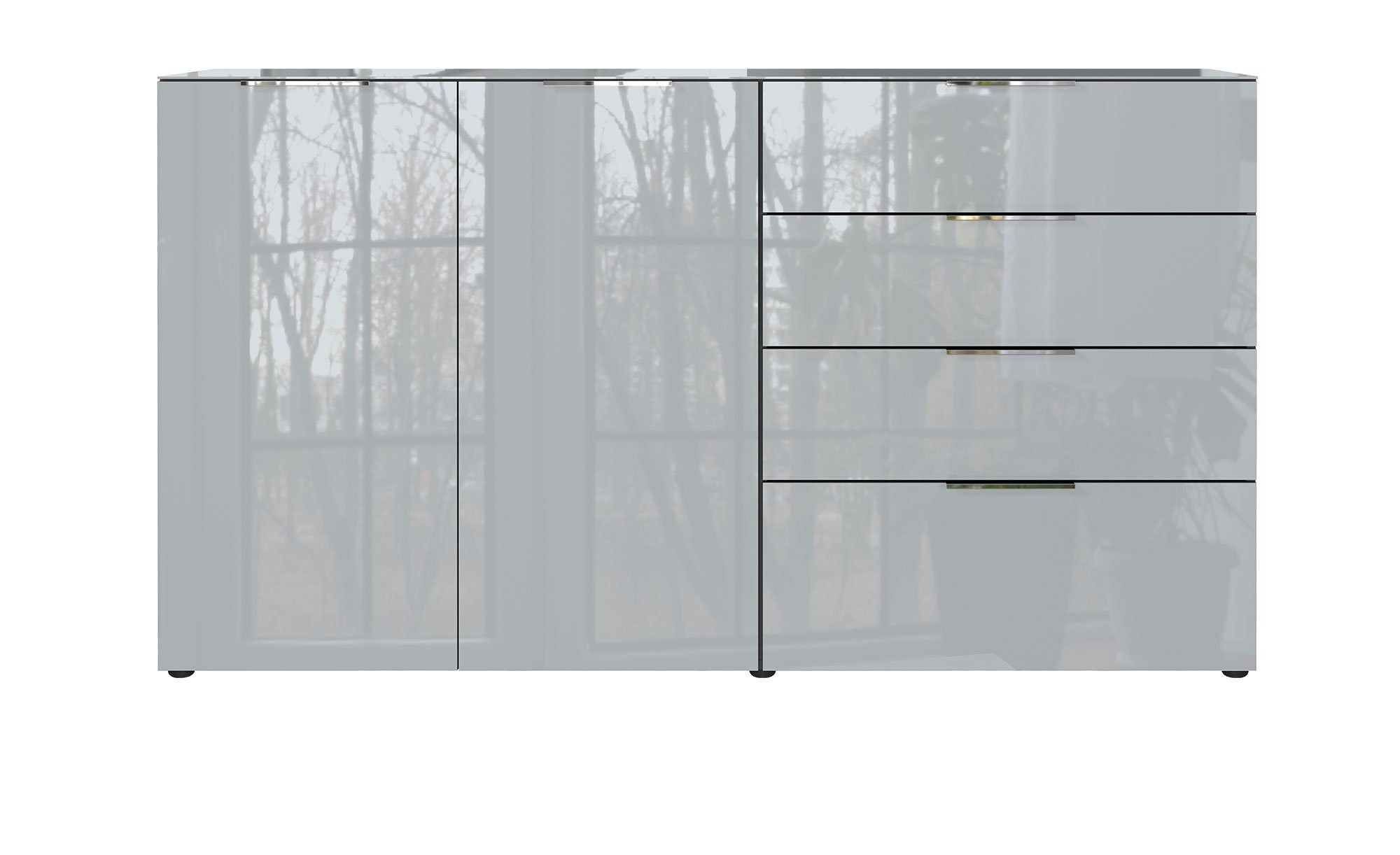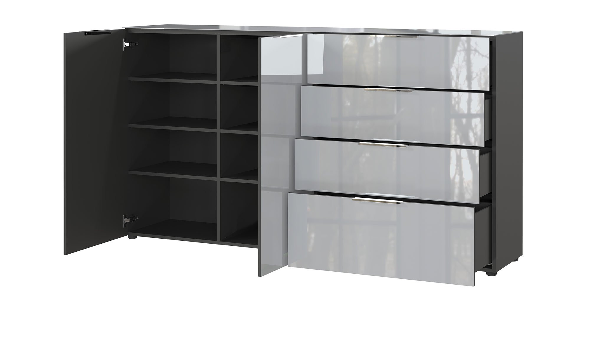 Das ca. 184 x 102 x 42 cm große Sideboard verfügt über schwarze Kunststofffüße und stilvolle Metallgriffe in Chrom-Optik. Diese ermöglichen das bequeme Öffnen der beiden gedämpften Türen und der vier Soft-Close-Schubkästen. Im Innenbereich bieten sechs Böden und acht Fächer jede Menge Stauraum.