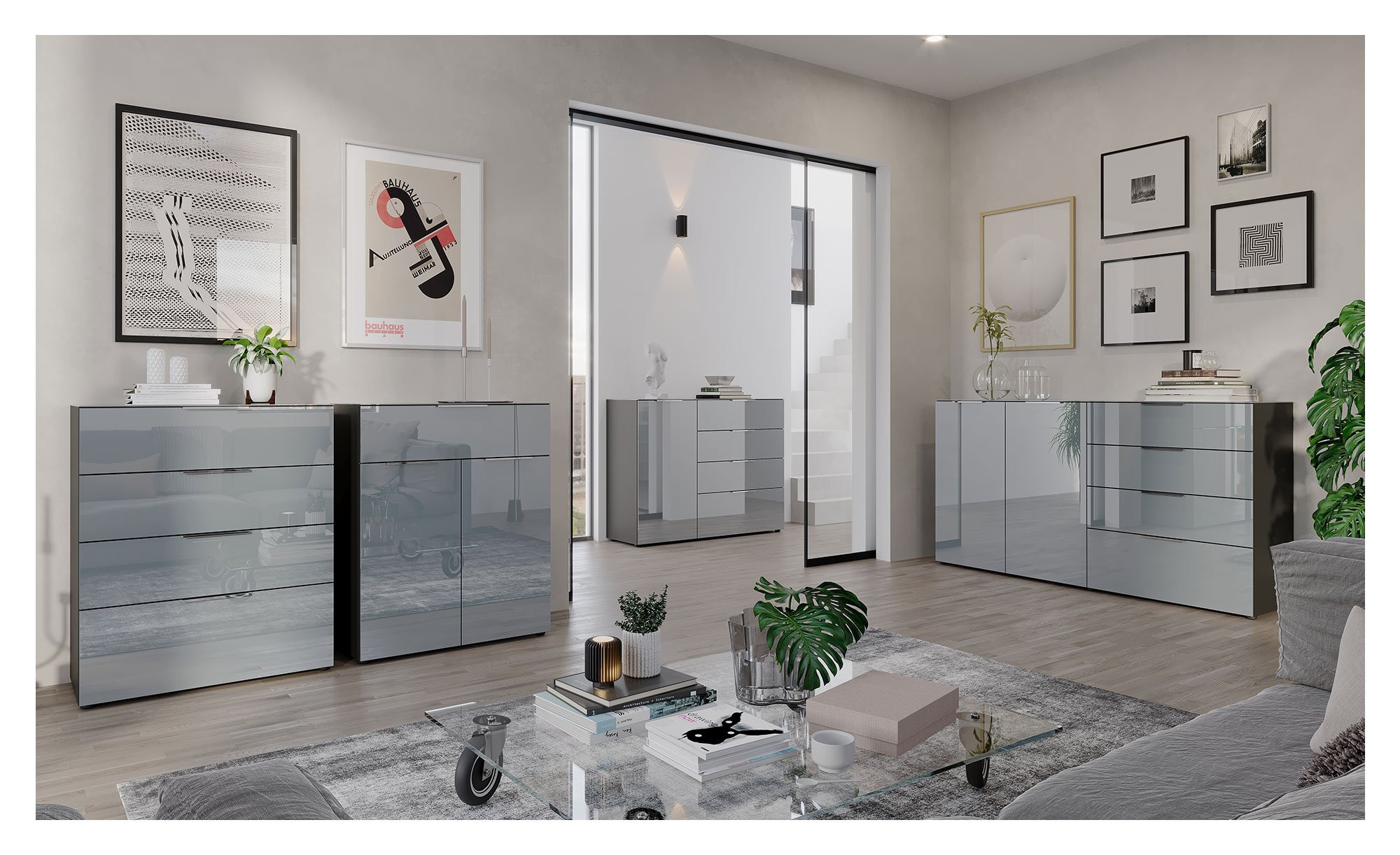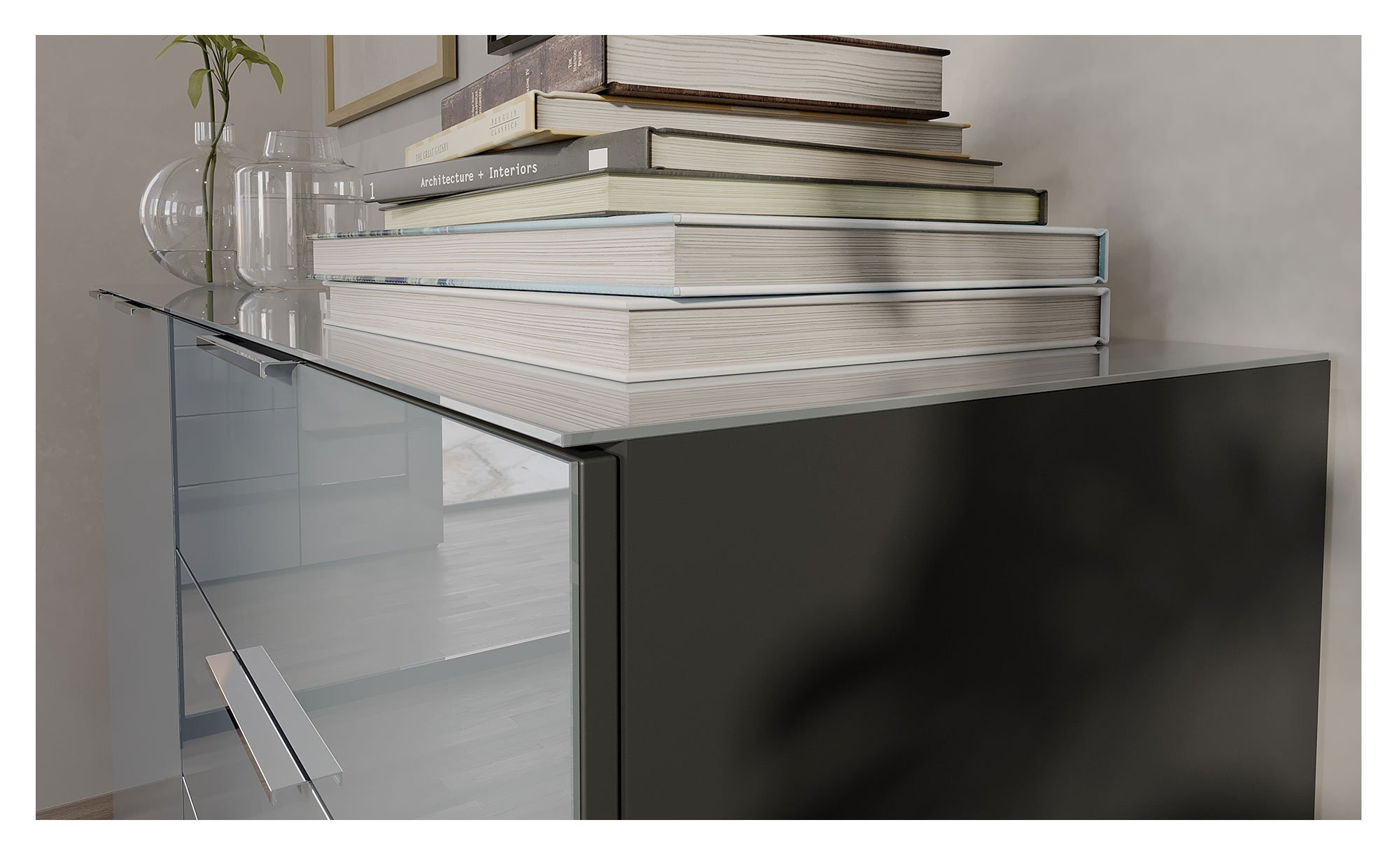 An der silbergrauen Front des Artikels erwartet Sie eine Einscheibensicherheitsglas-Oberfläche, die durch ihre hohe Widerstandskraft überzeugt. Der Korpus ist in einem eleganten Graphitfarbton gehalten und mit einer langlebigen Melaminharzbeschichtung versehen. Auch die ABS-Kanten tragen zur Haltbarkeit des Möbels bei.