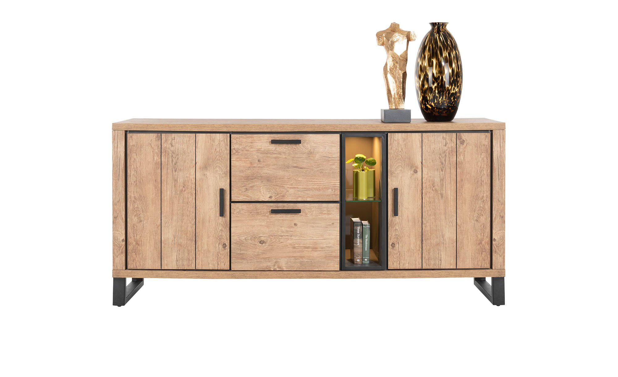 Hinter zwei gedämpften Türen lassen sich Gegenstände unterschiedlicher Größe verstauen. Weiterer Platz bietet sich innerhalb der beiden Fächer und in zwei Schubläden inkl. Soft-Close-Funktion.
